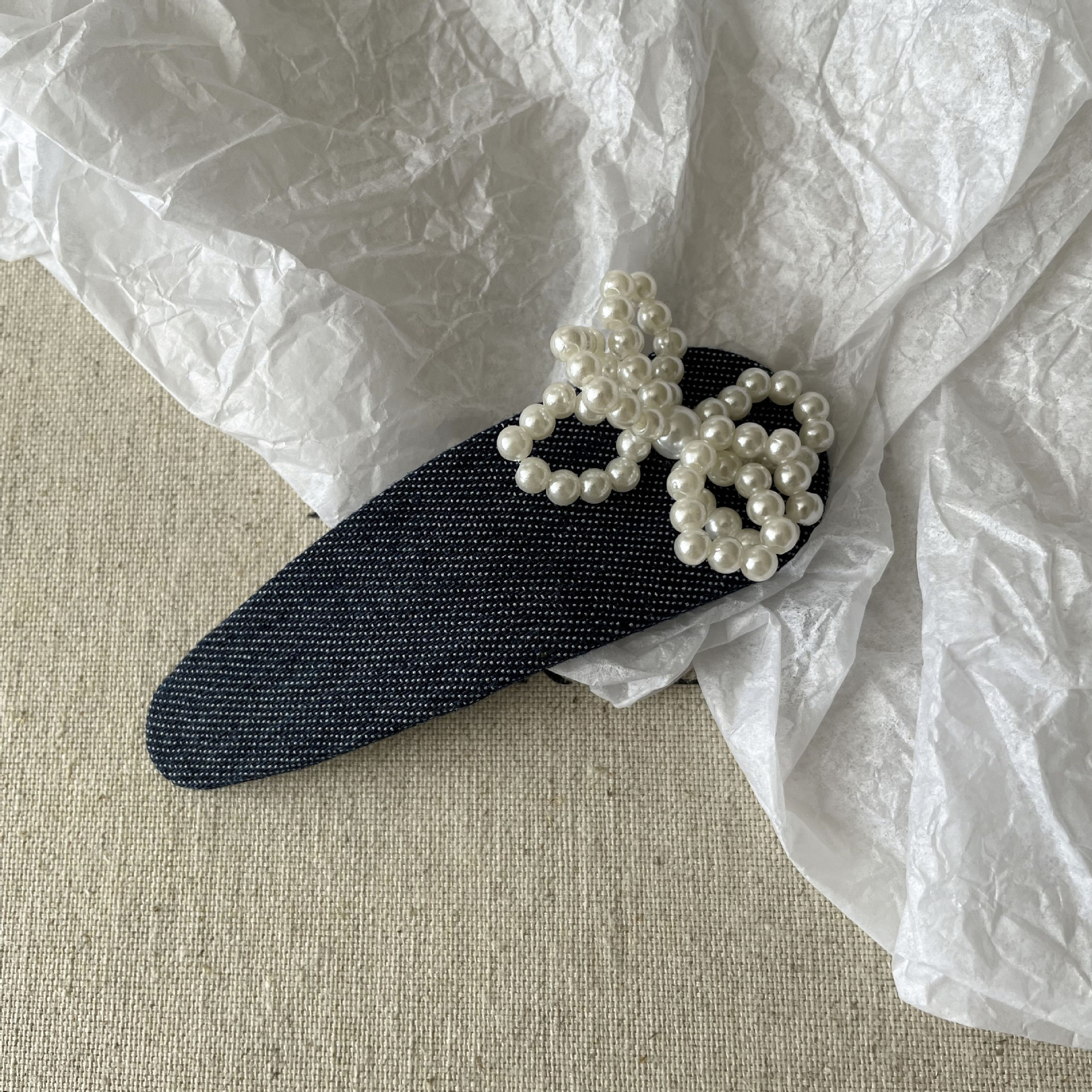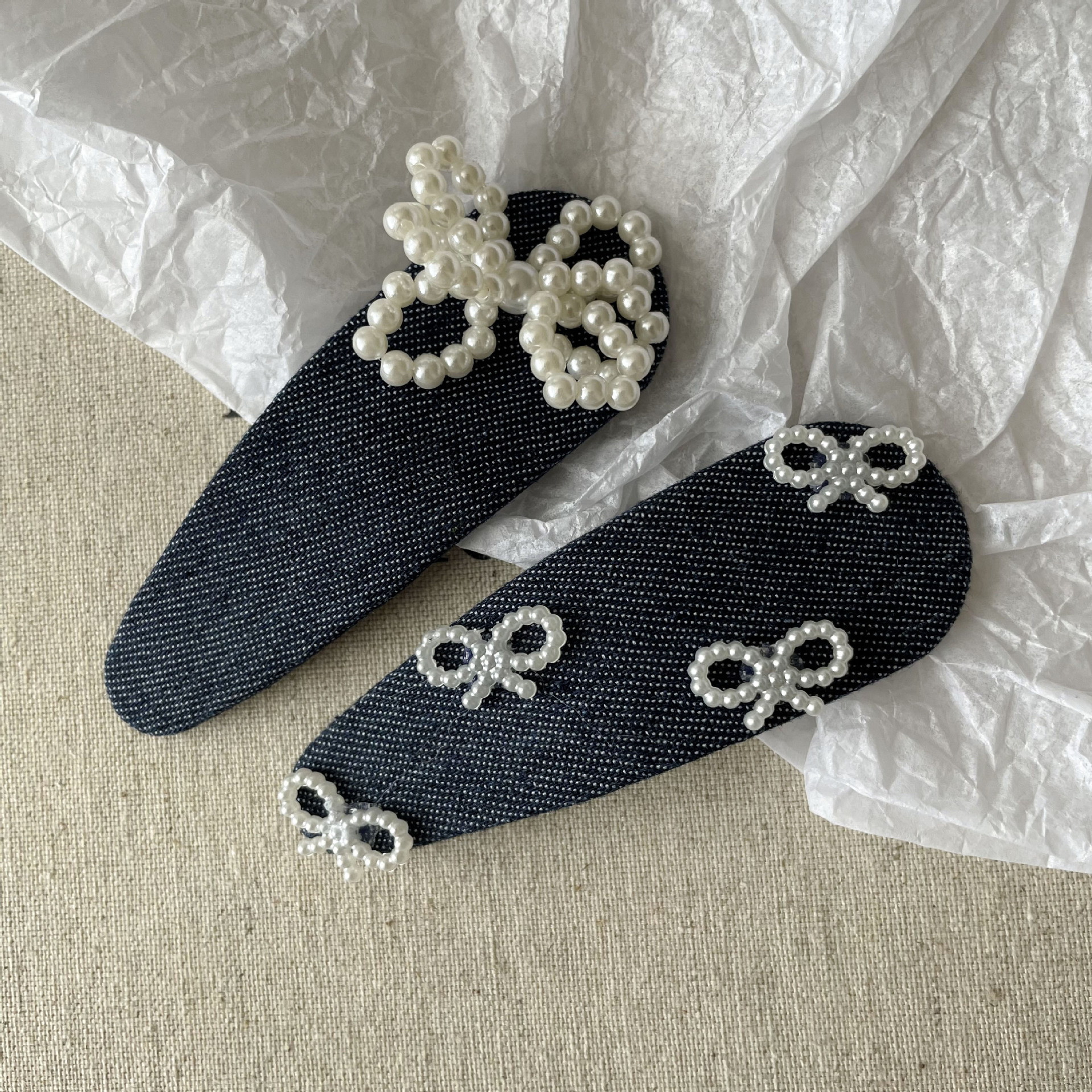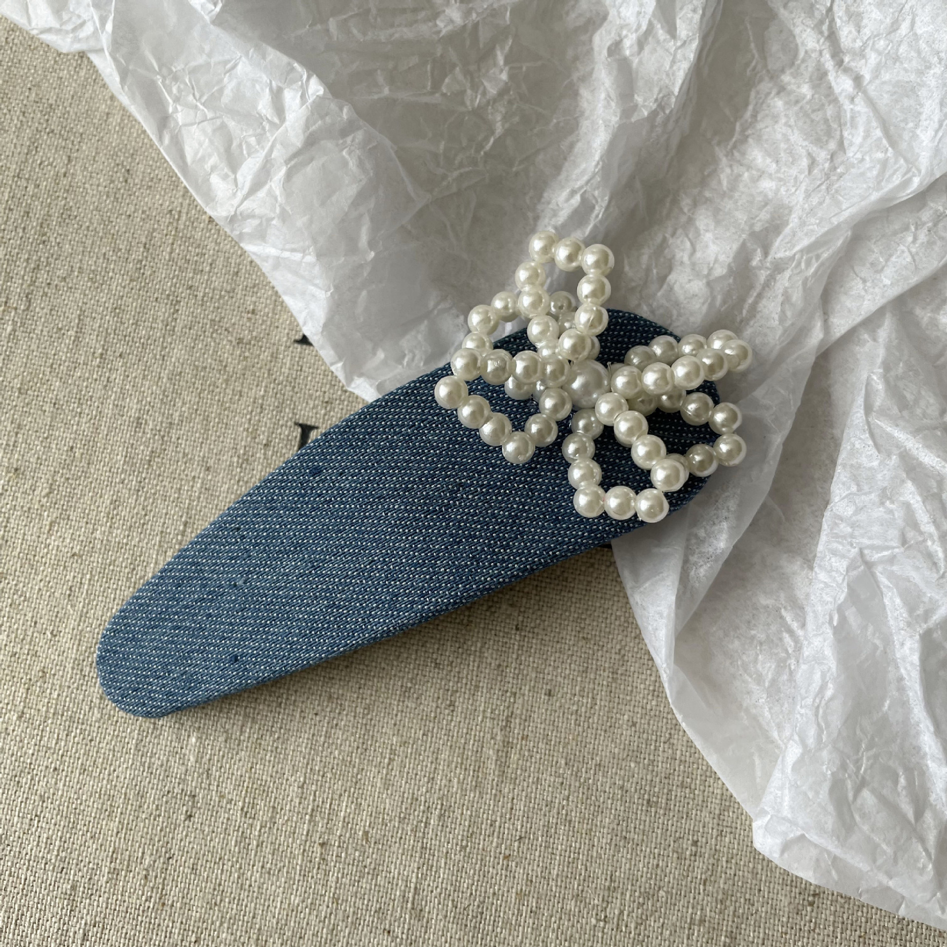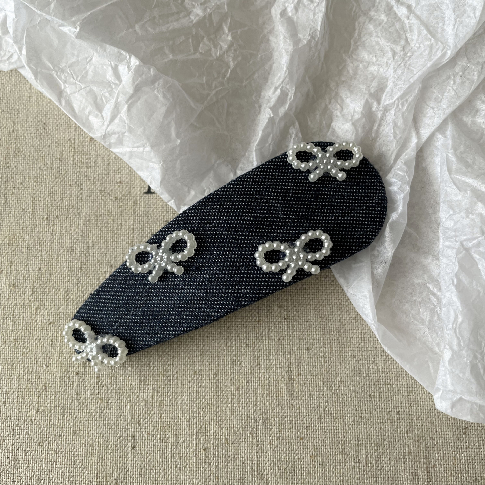 蓝色牛仔仿珍珠蝴蝶结发夹甜美可爱布艺侧边刘海掰掰夹发饰头饰女