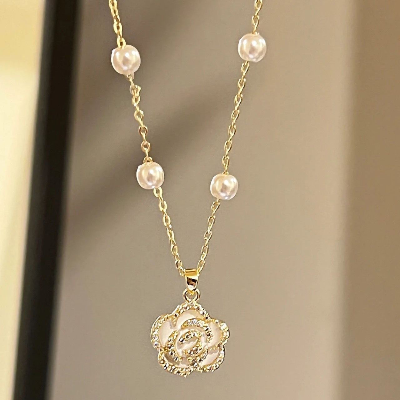 小红书同款初恋山茶花朵项链女复古珍珠锁骨链小众饰品高颜值配饰