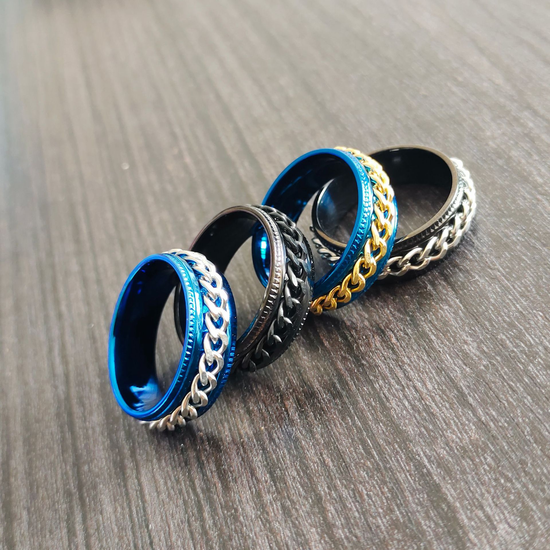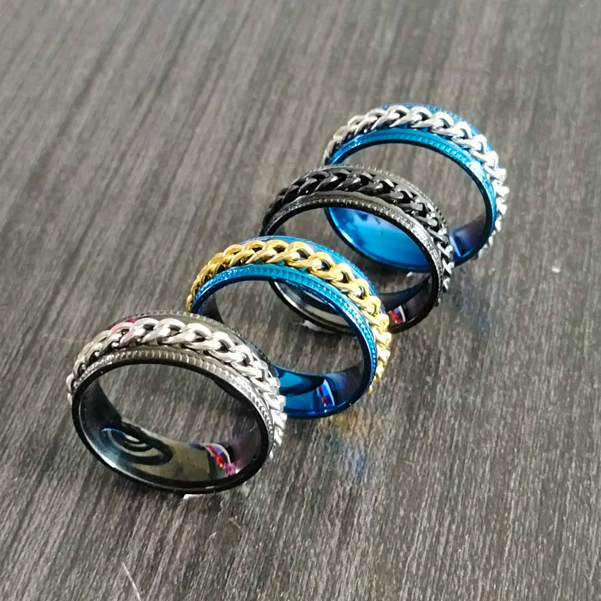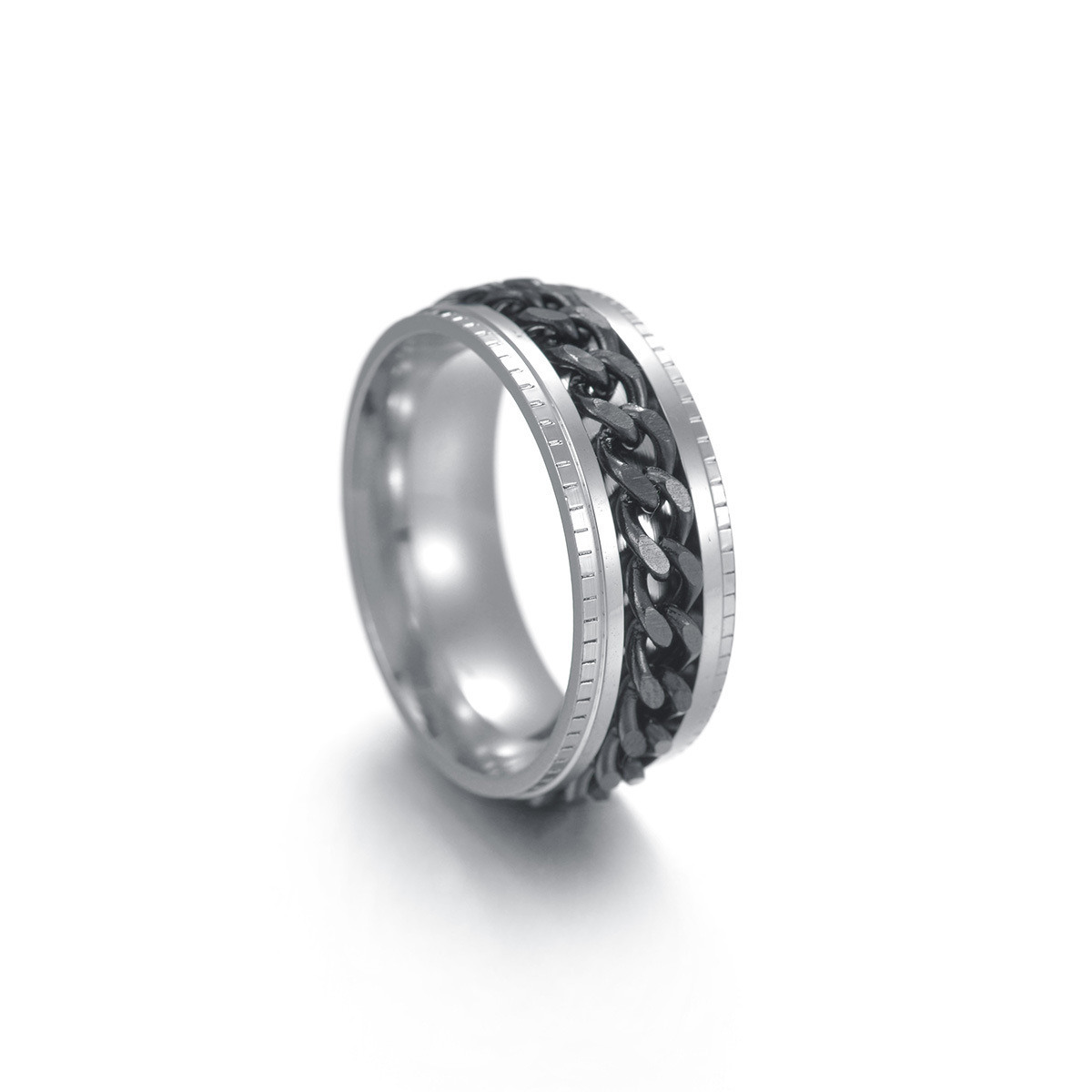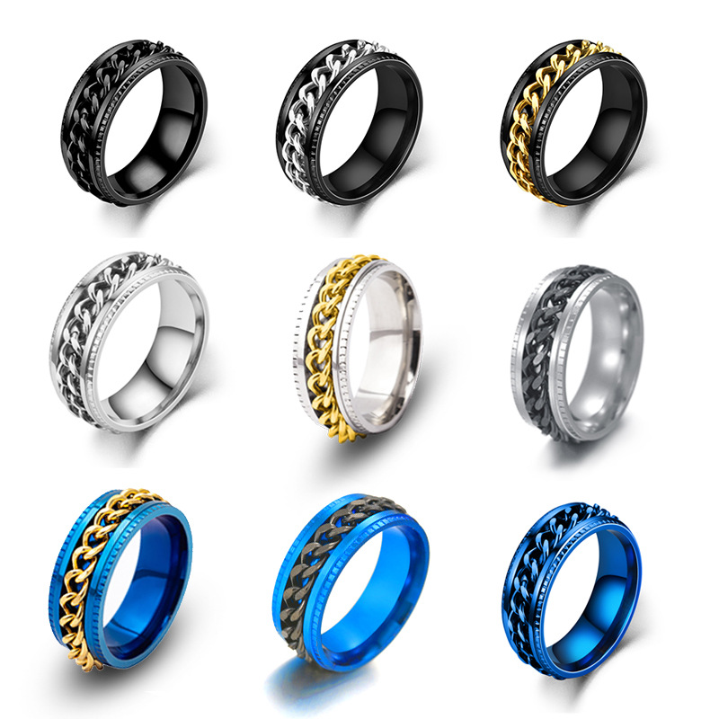 欧美抖音同款可转动链条钛钢戒指个性男双层压花不锈钢开瓶器指环