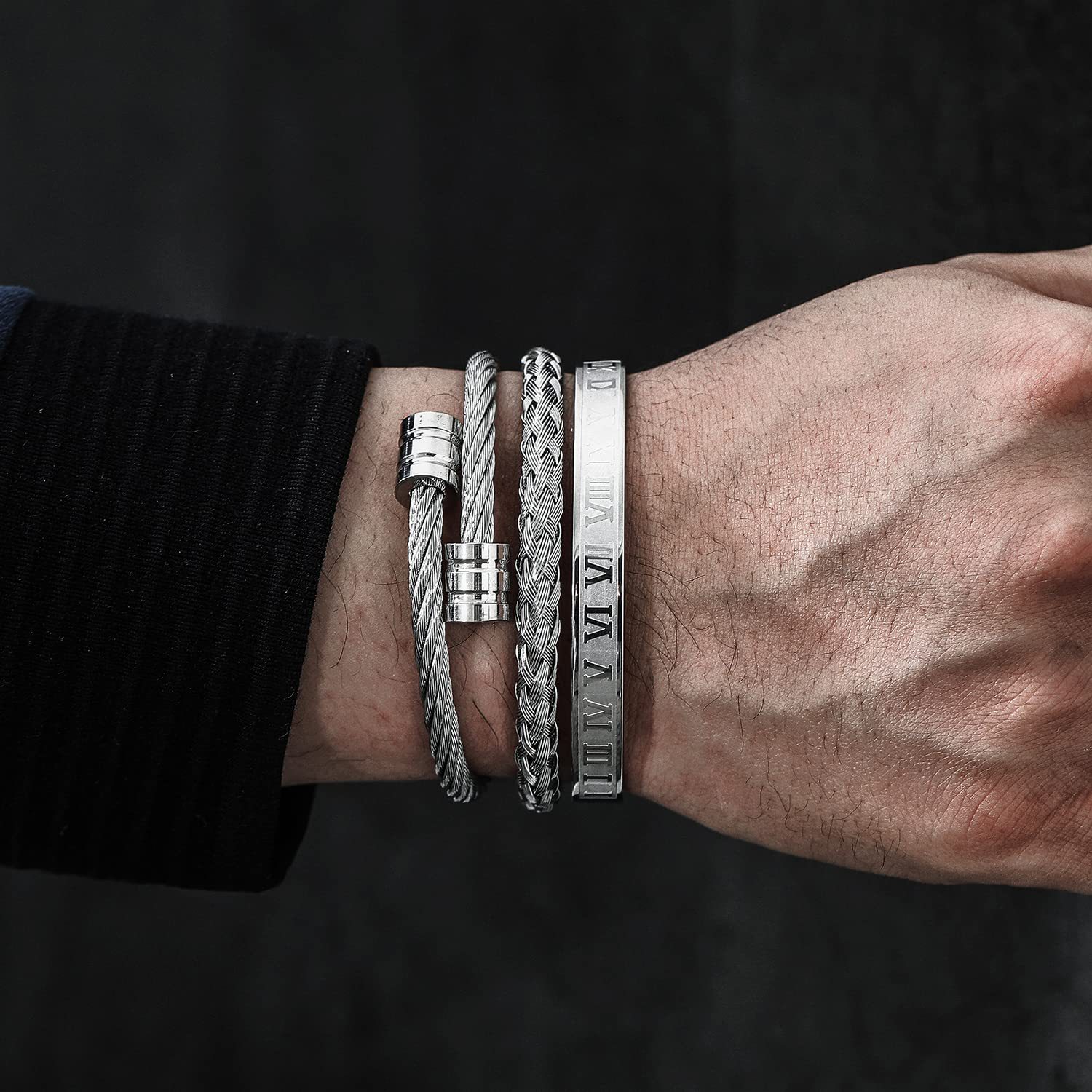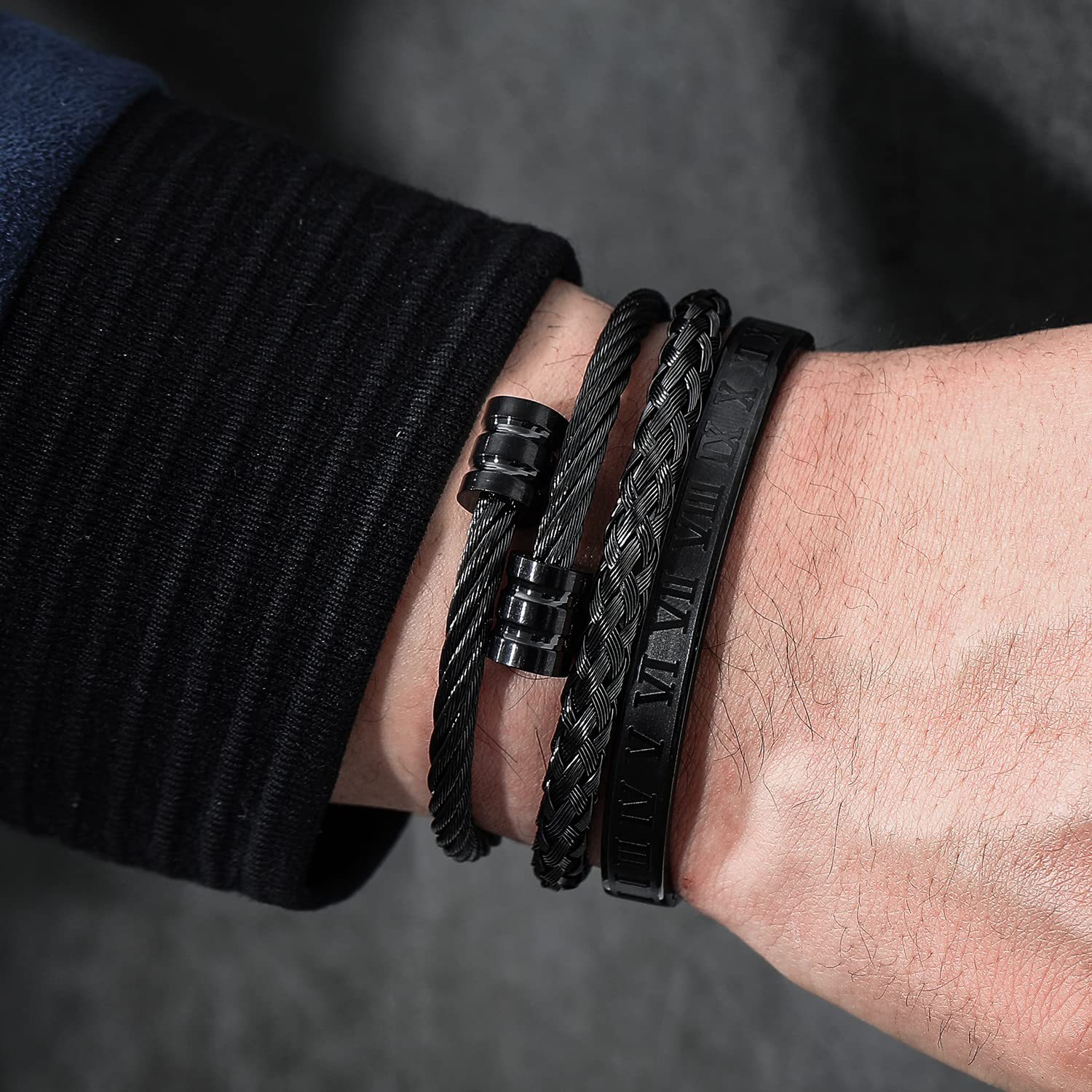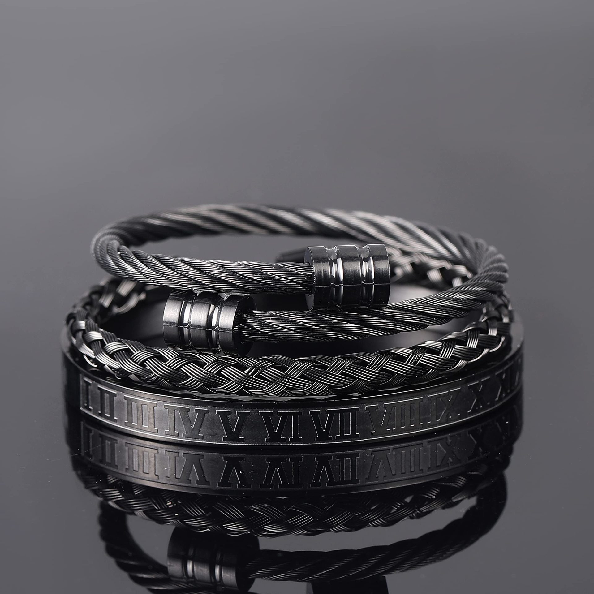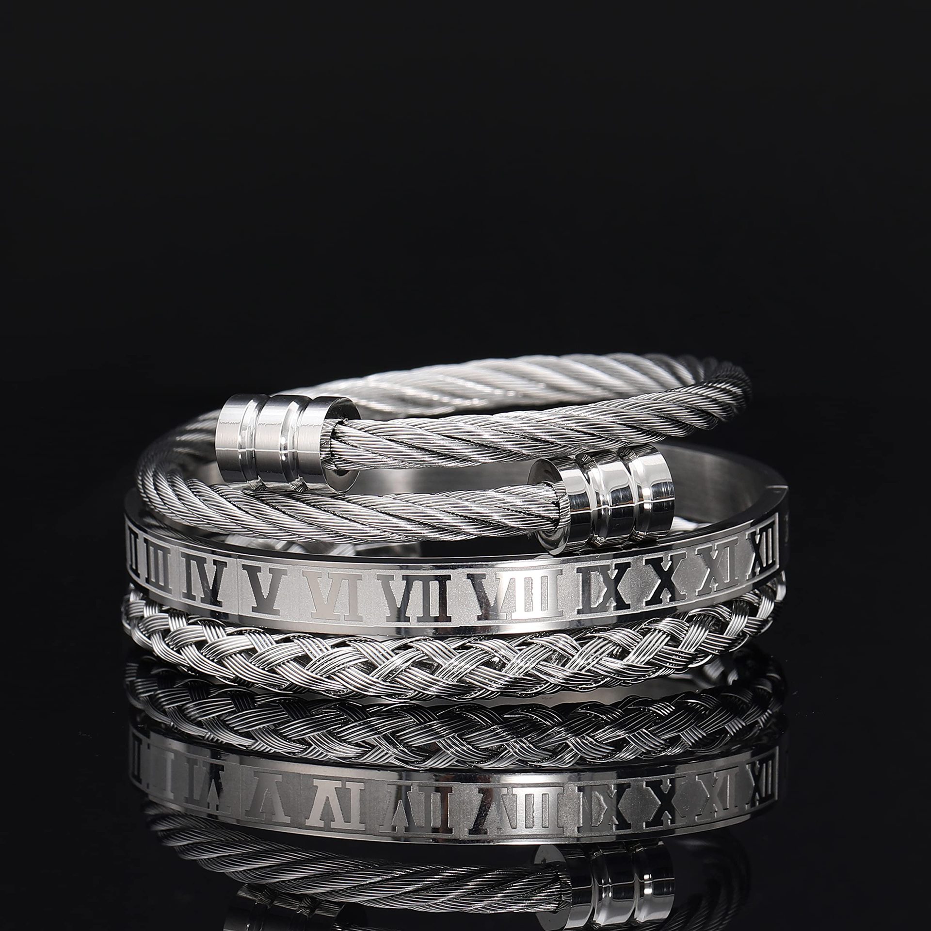 跨境3件组合不锈钢编织手链男士罗马数字手镯扭绳可调节袖口手镯