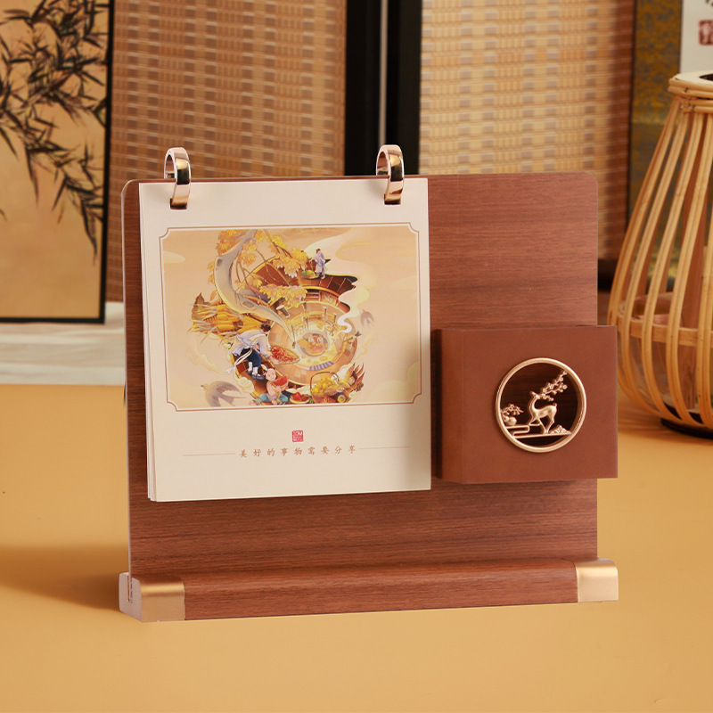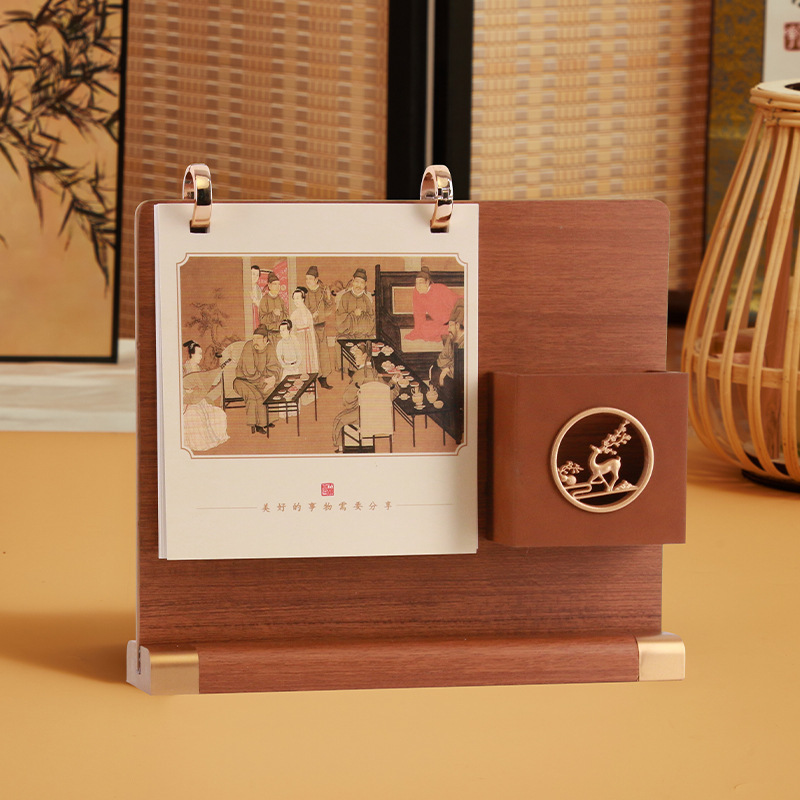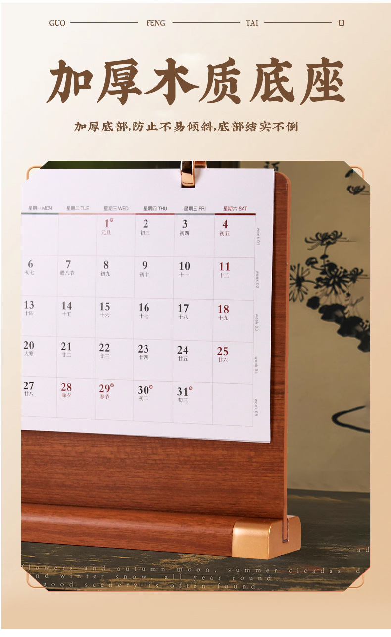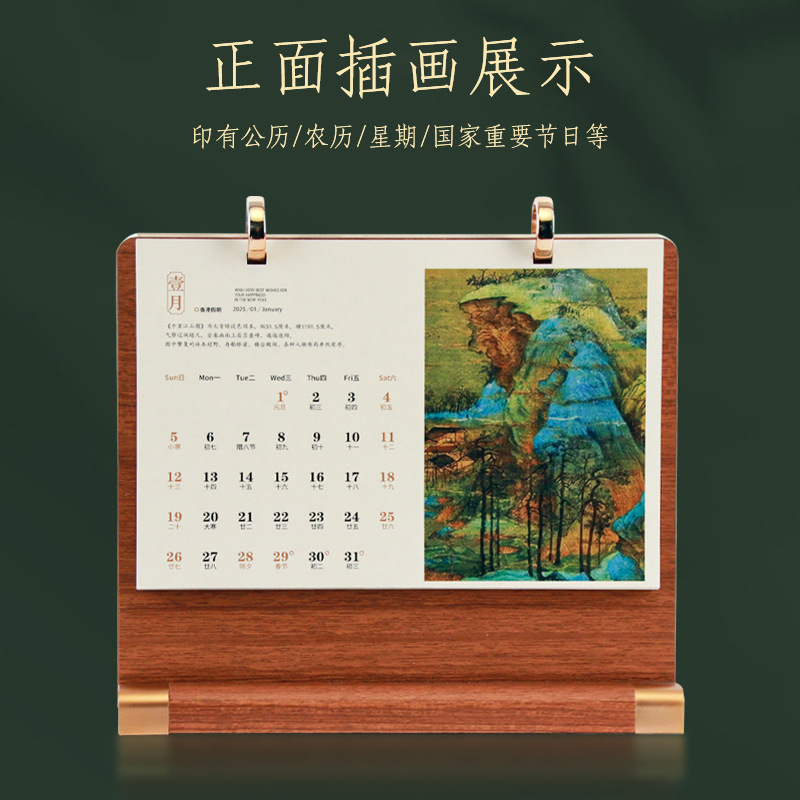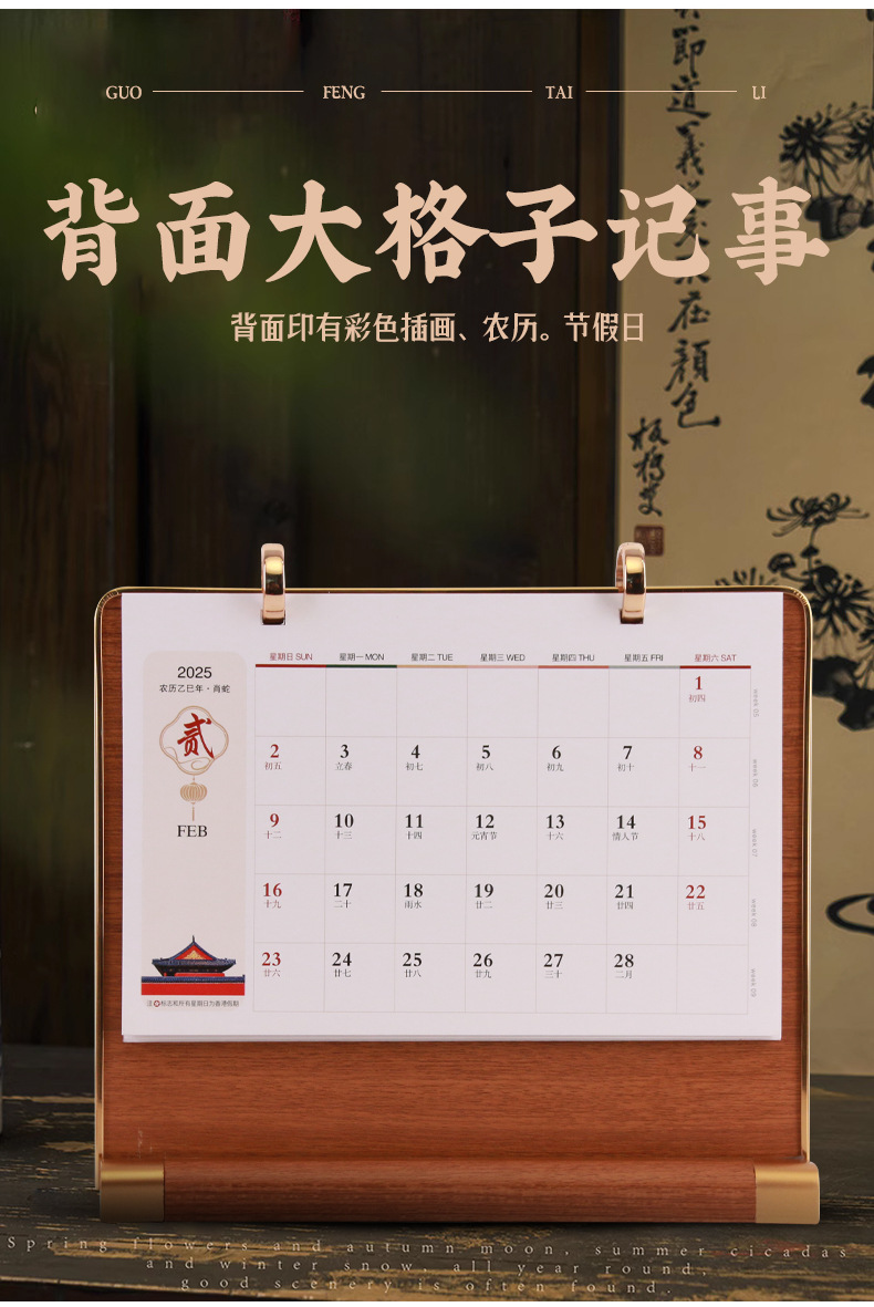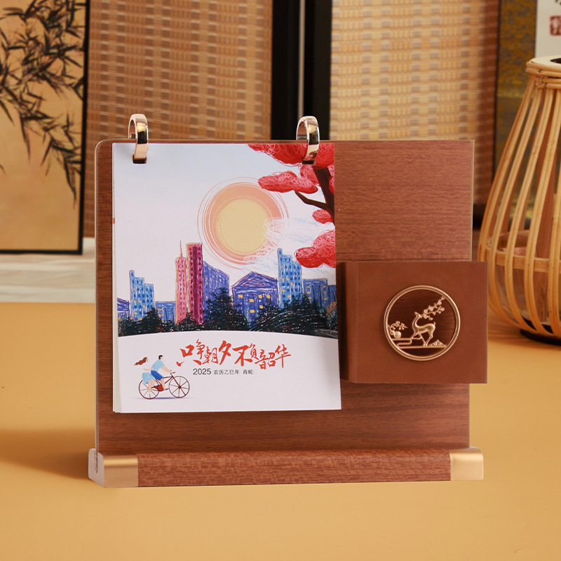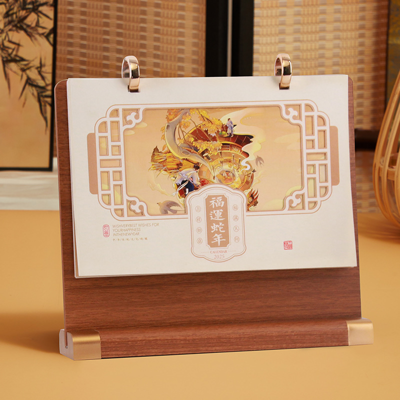 2025蛇年木质台历打卡创意企业桌面木架国潮简约办公台历现货定制