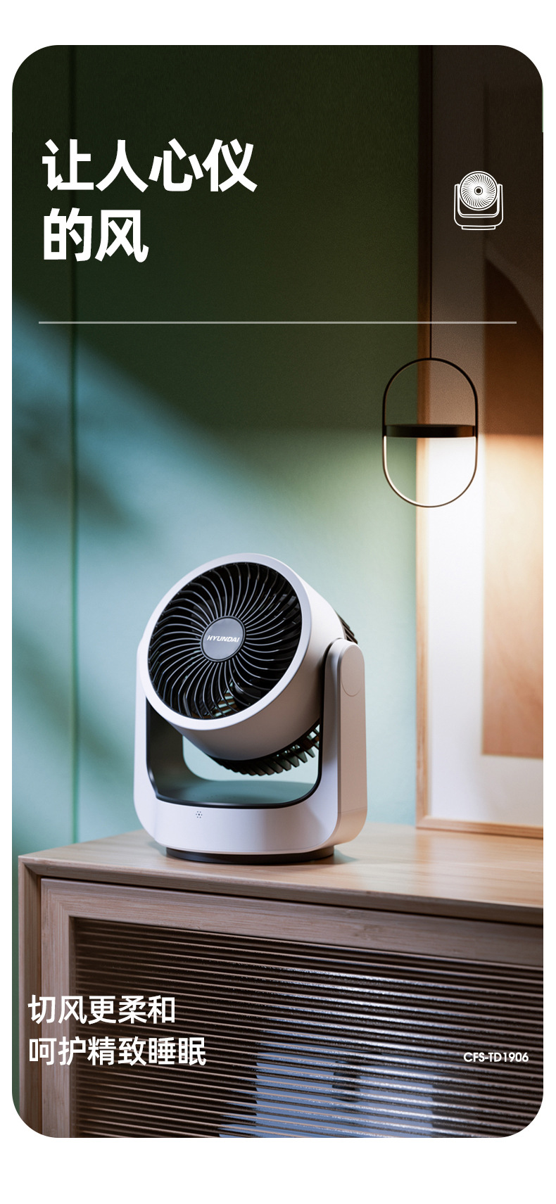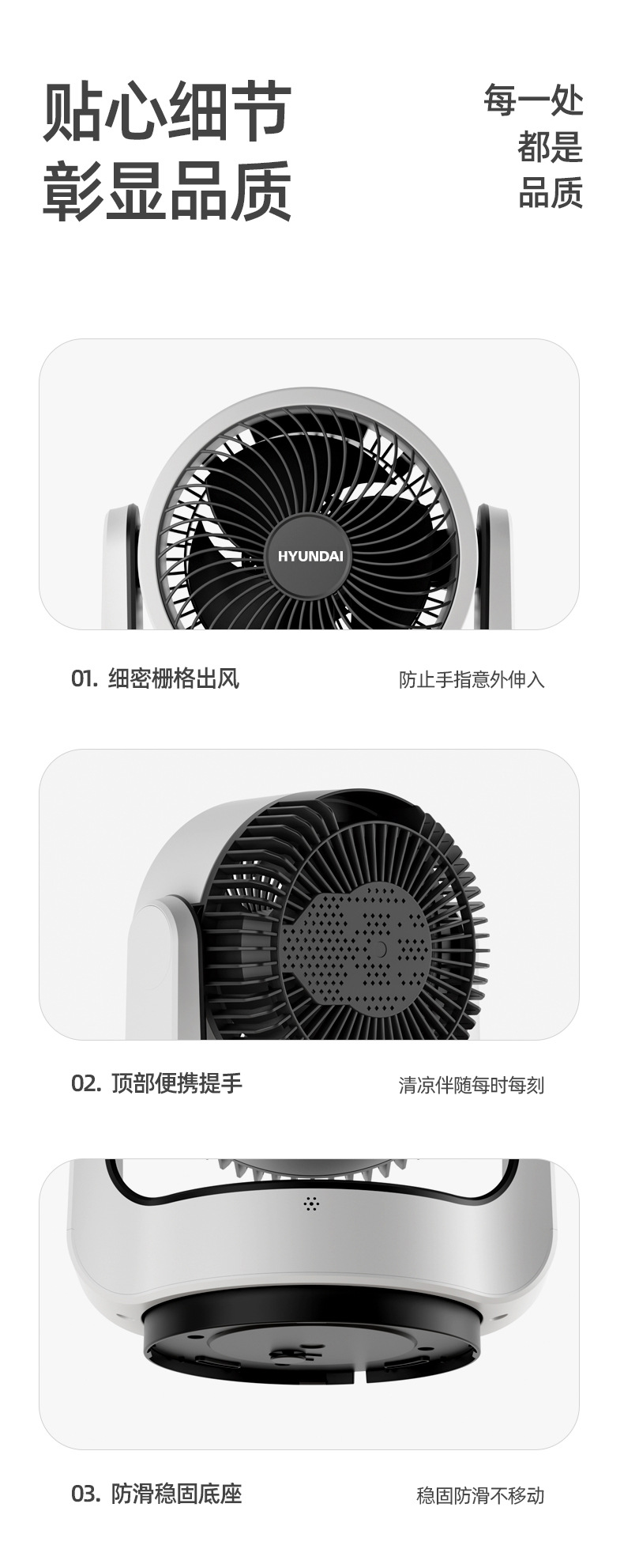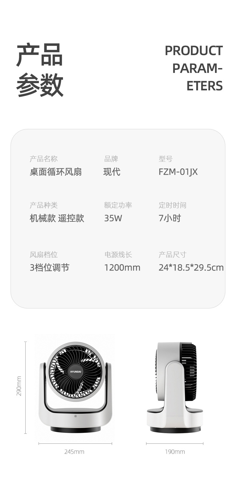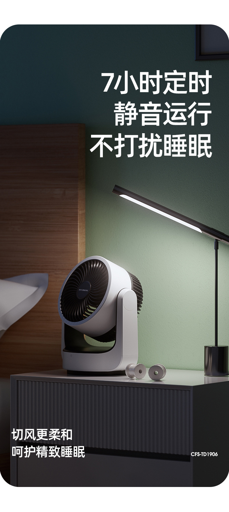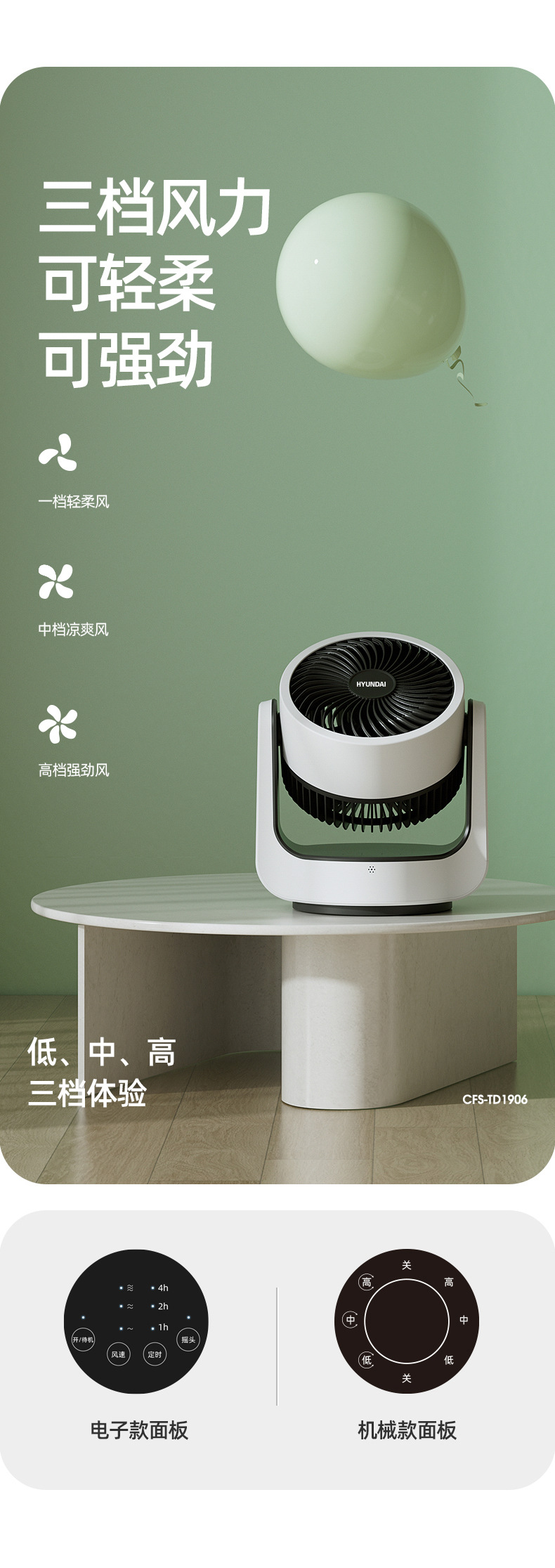 HYUNDAI电风扇静音定时涡轮对流风便携式办公桌面台扇空气循环扇