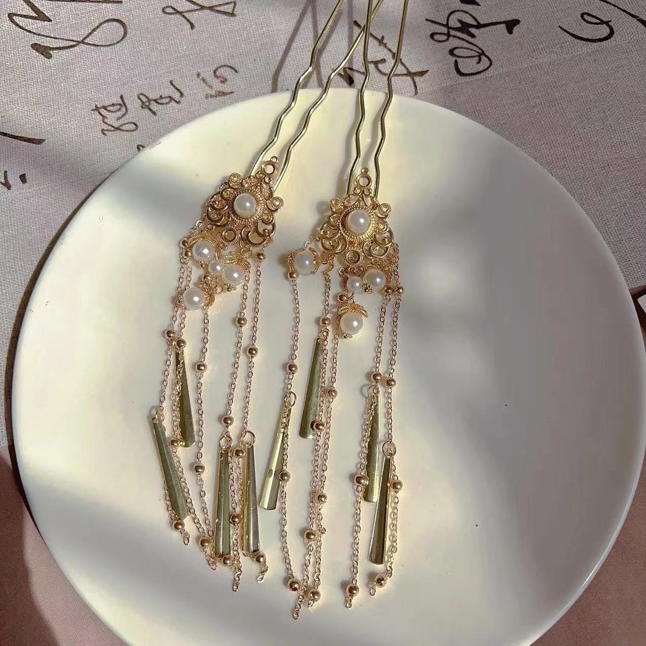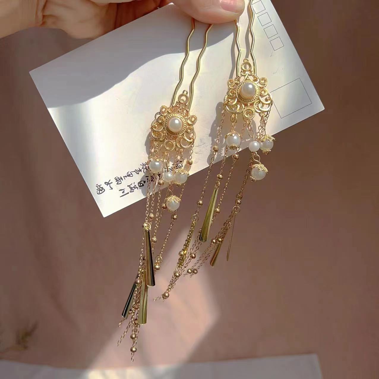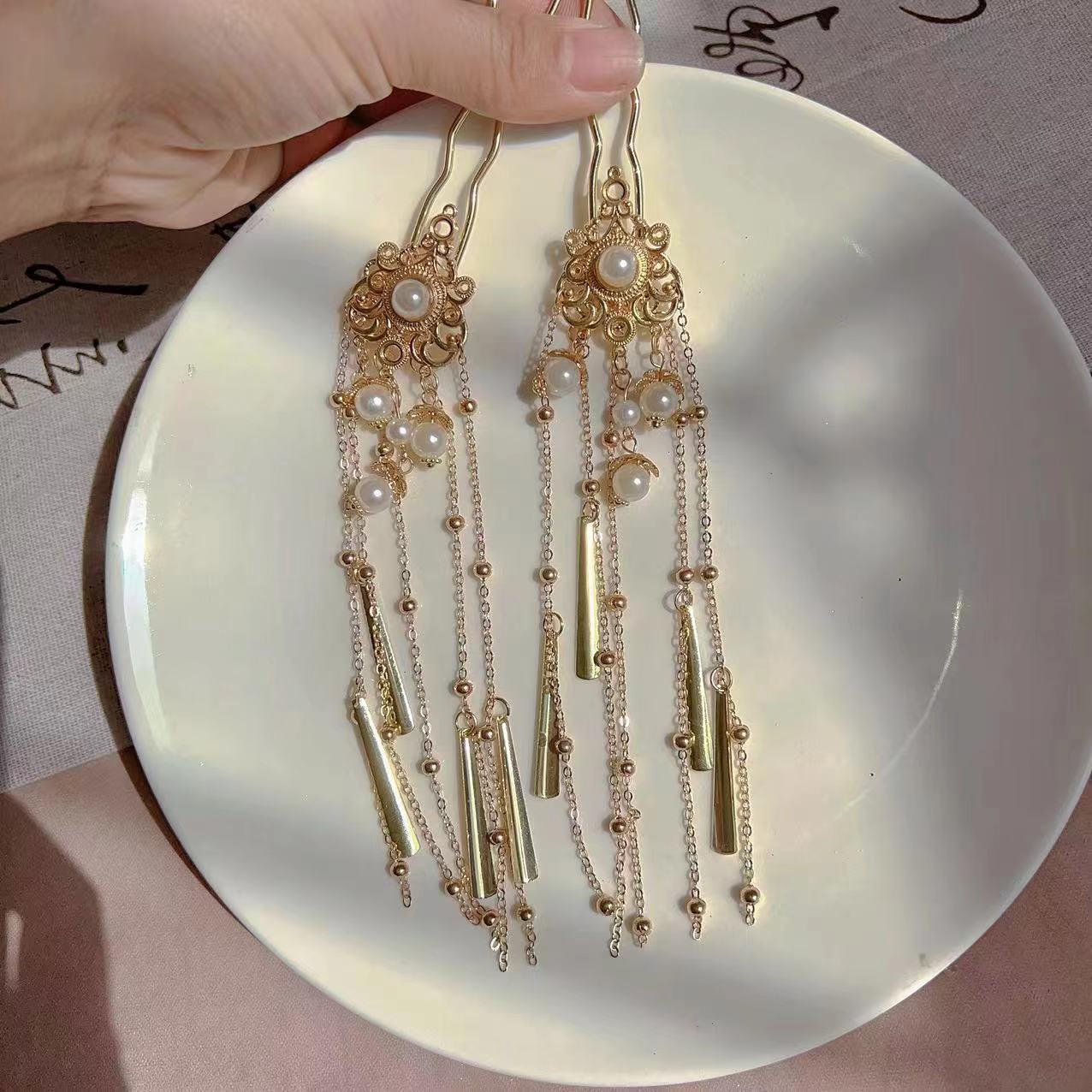 金色鬓发簪仿珠点缀汉服配饰古风头饰金色长流苏发簪复古头饰宫廷