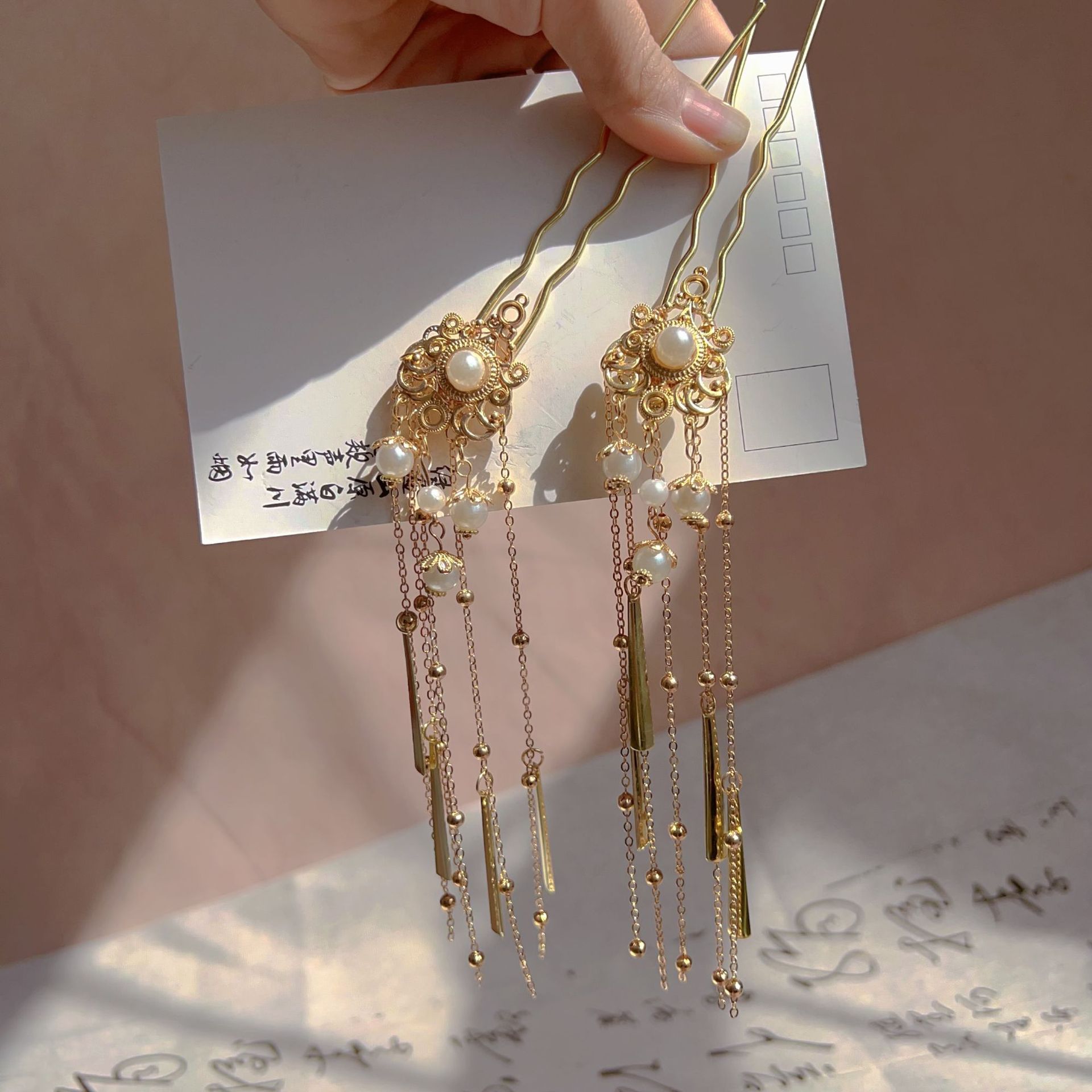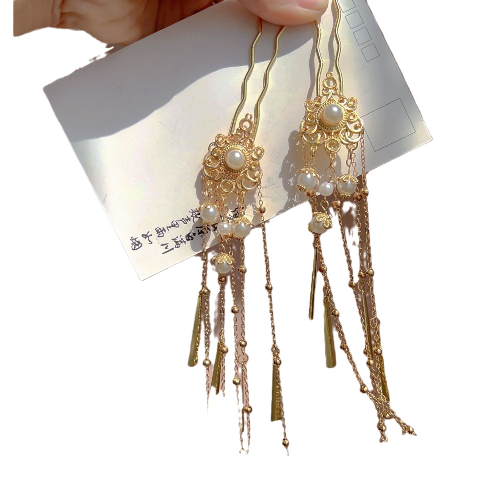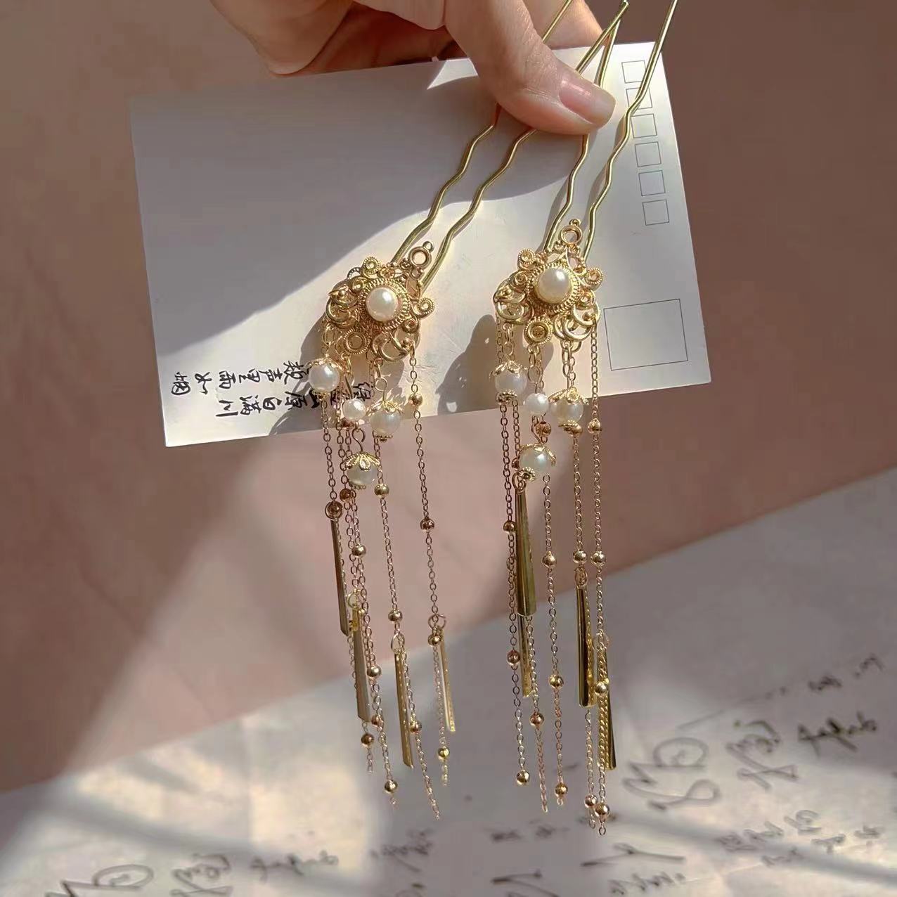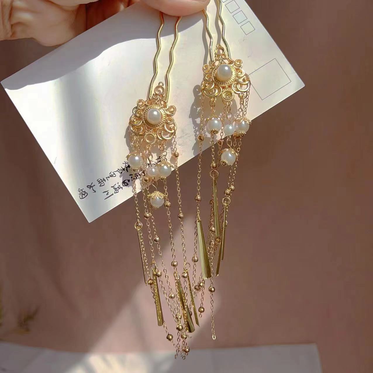 金色鬓发簪仿珠点缀汉服配饰古风头饰金色长流苏发簪复古头饰宫廷