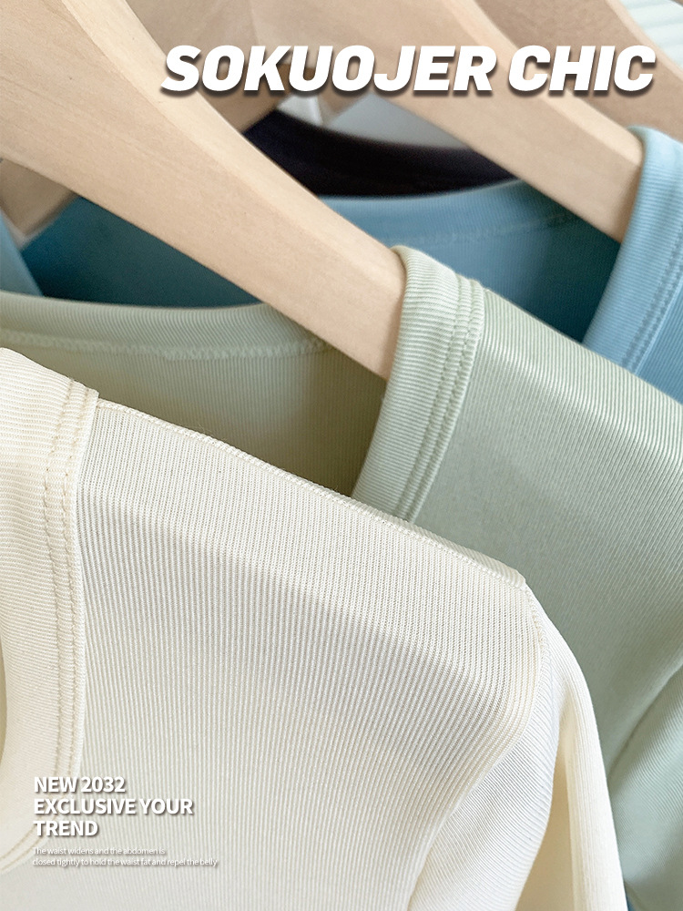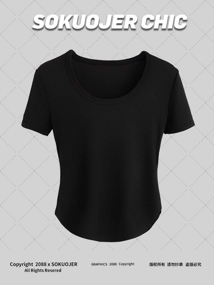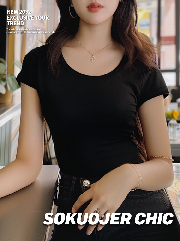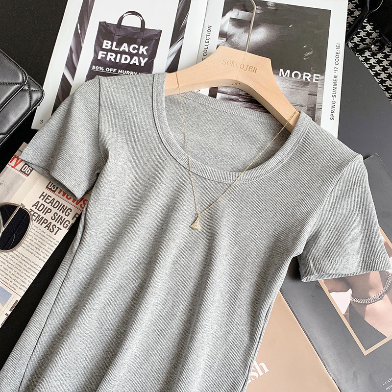 辣妹冰丝螺纹正肩U领短袖T恤女夏时尚百搭修身显瘦打底衫高弹上衣