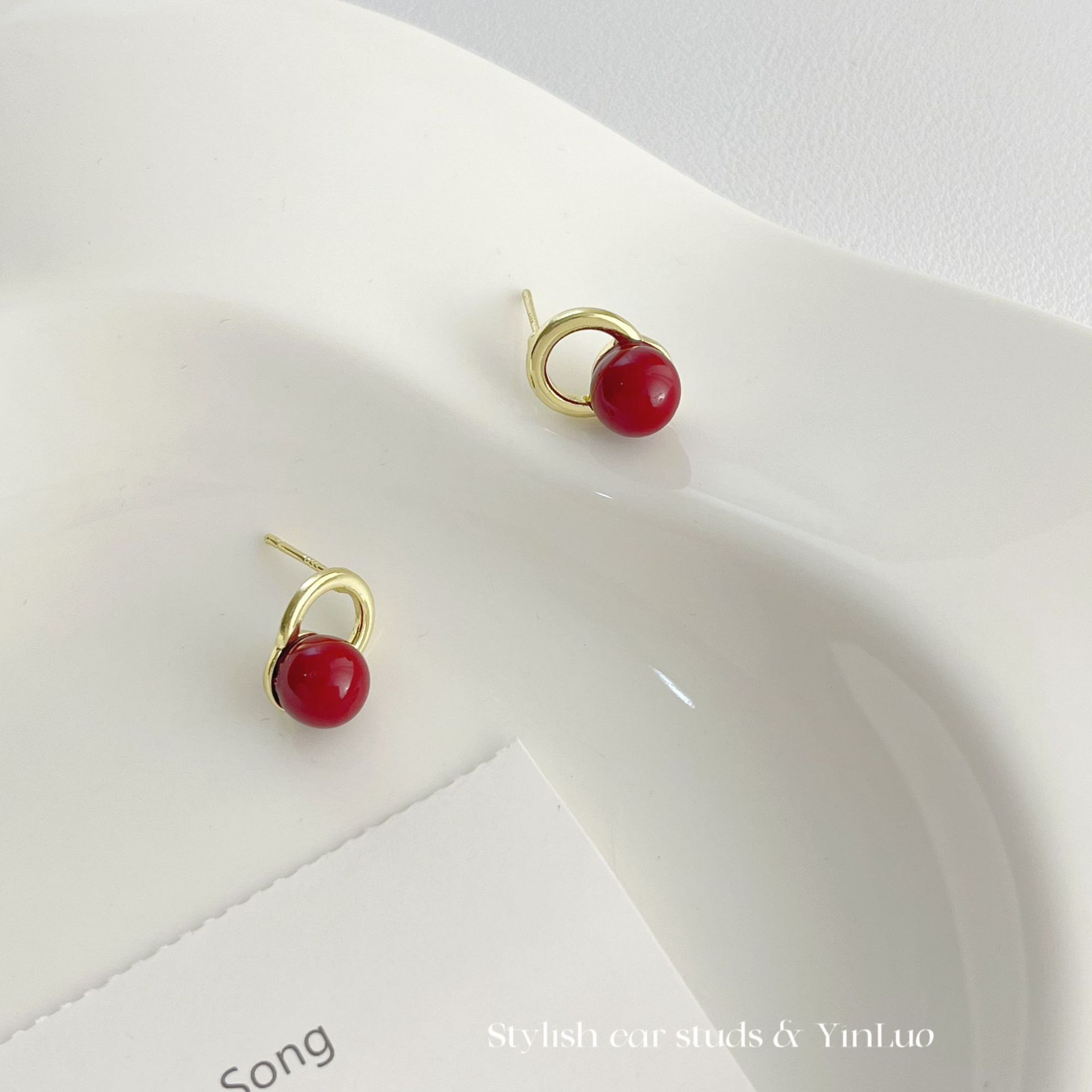 秋冬气质红色豆豆耳钉女简约复古百搭耳环过年喜庆耳环2023新款