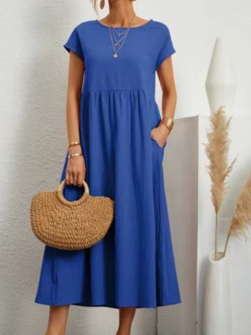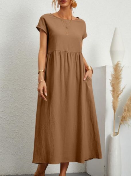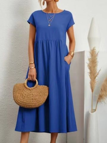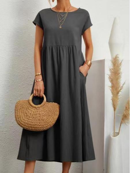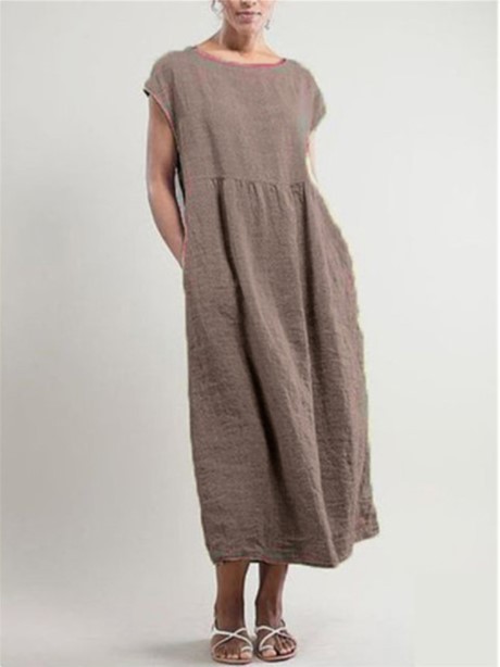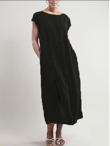 亚马逊 速卖通 2024ebay欧美纯色无袖宽松棉麻插口袋 连衣裙 现货