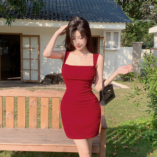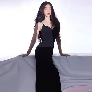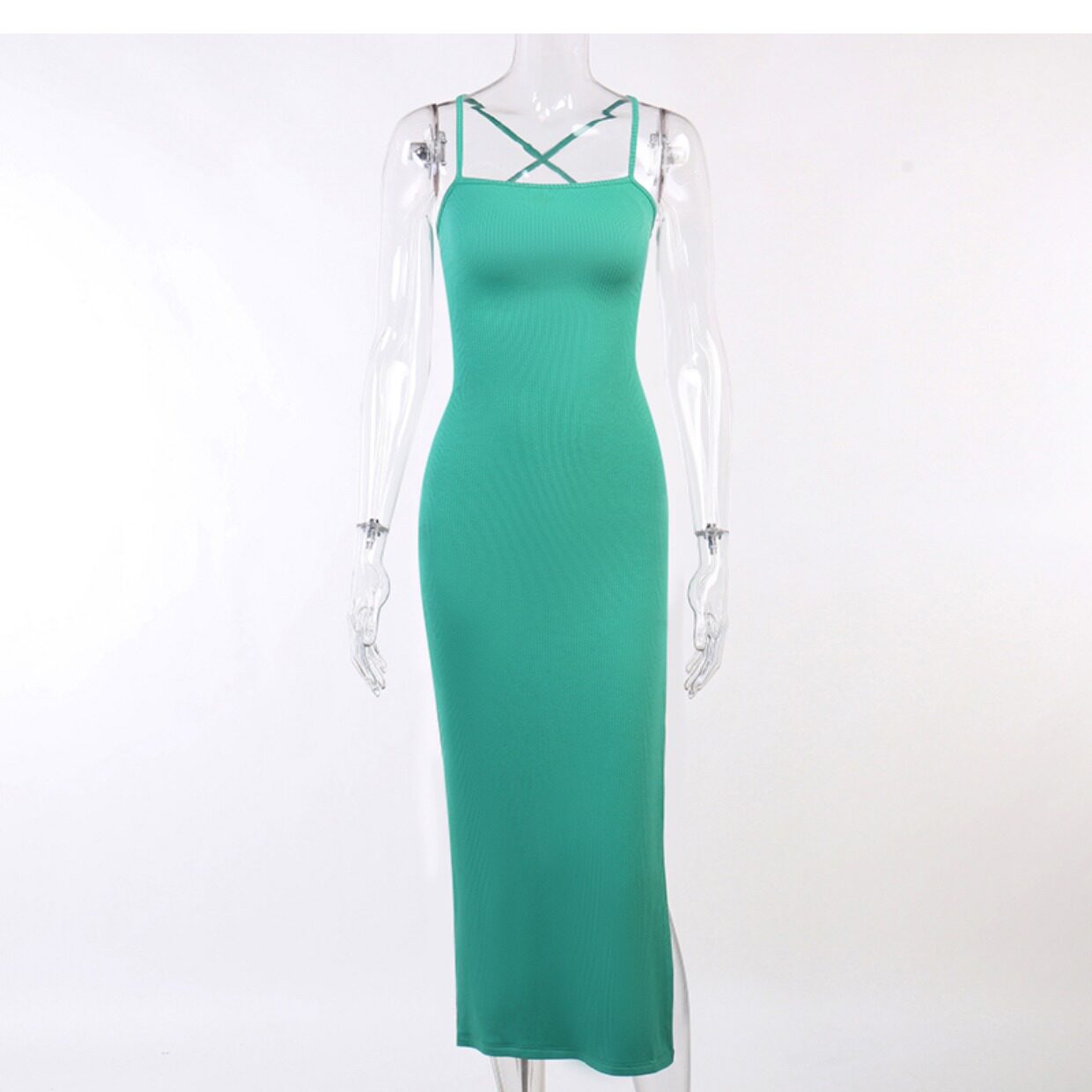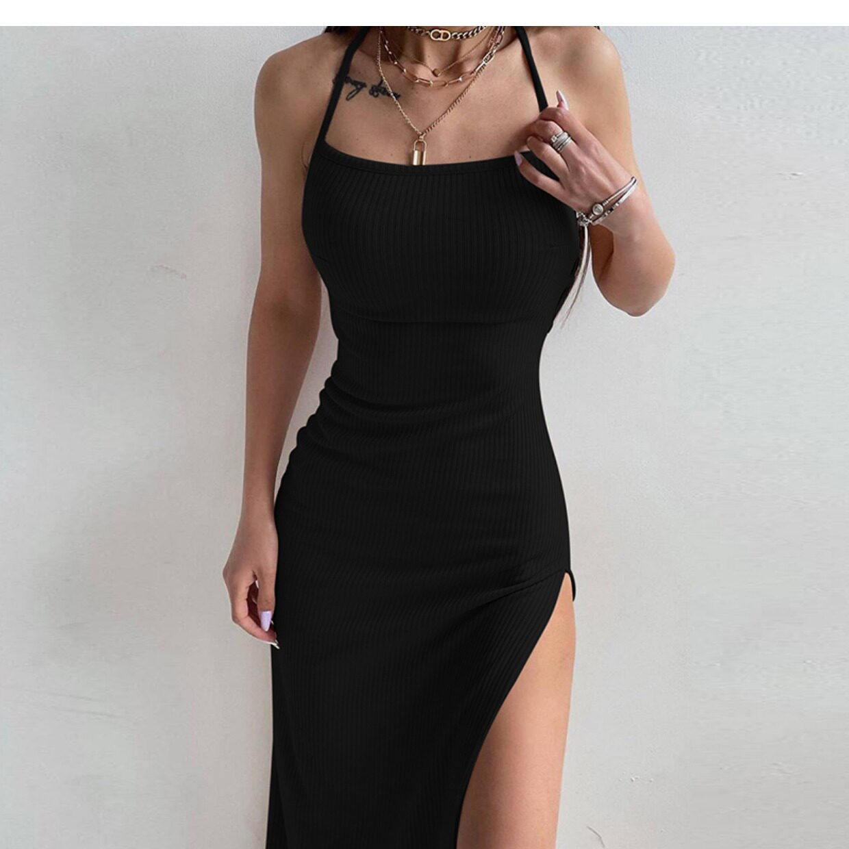 伊莉雅性感高开叉吊带连衣裙气质休闲度假风露背纯色长裙CC22157