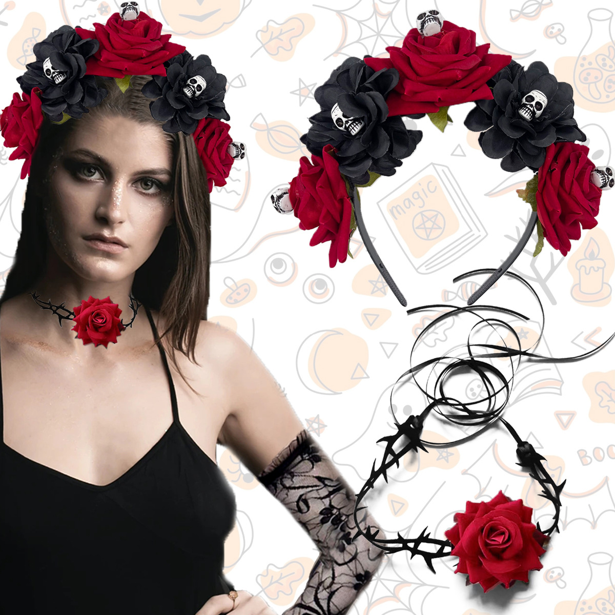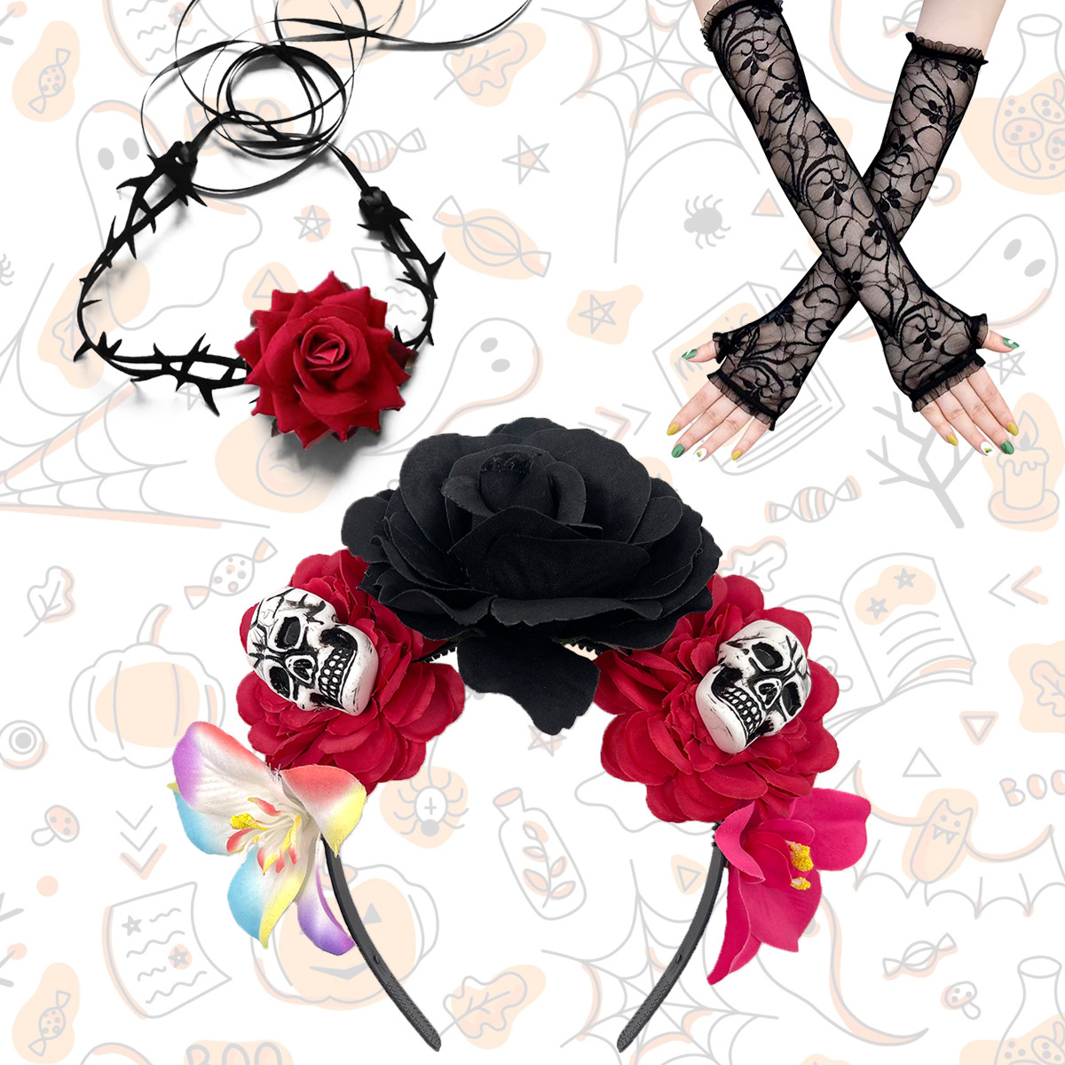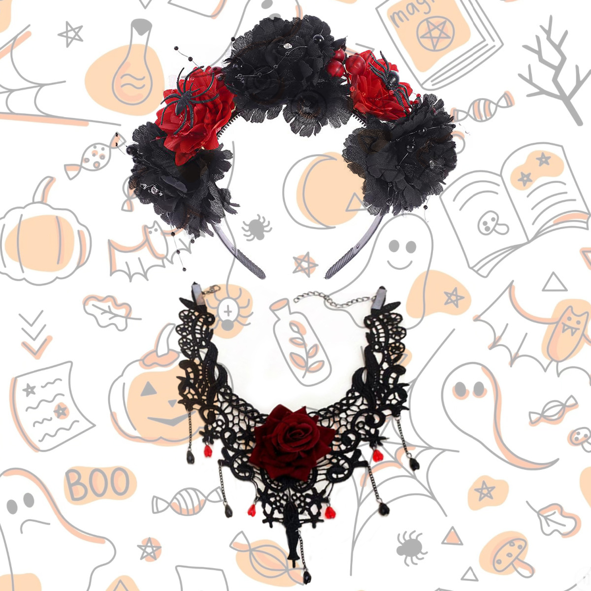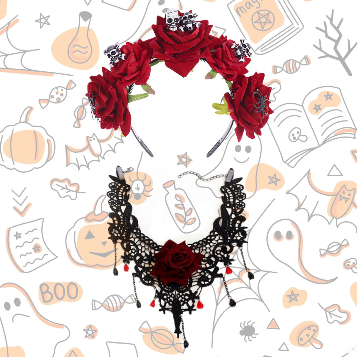 跨境热销万圣节搞怪发箍项链套装玫瑰花头箍女骷髅头发饰恐怖道具