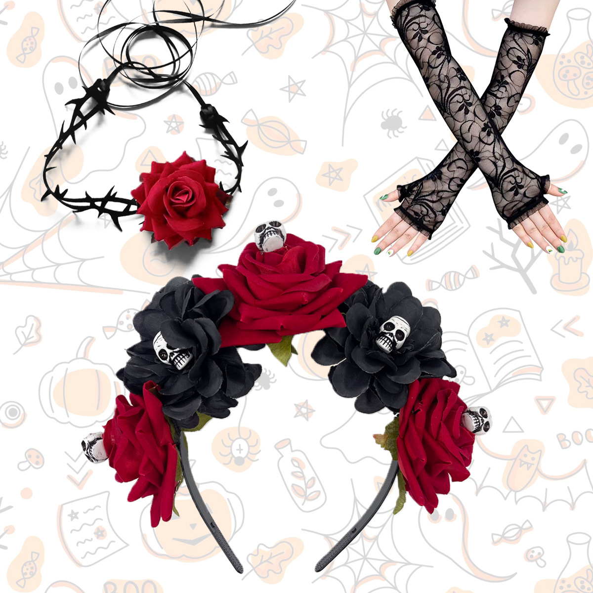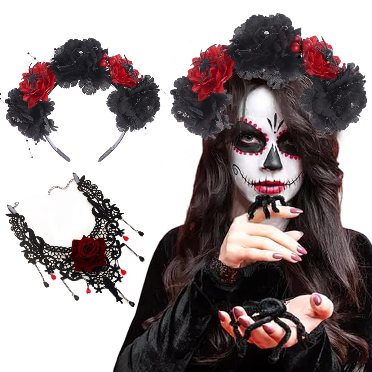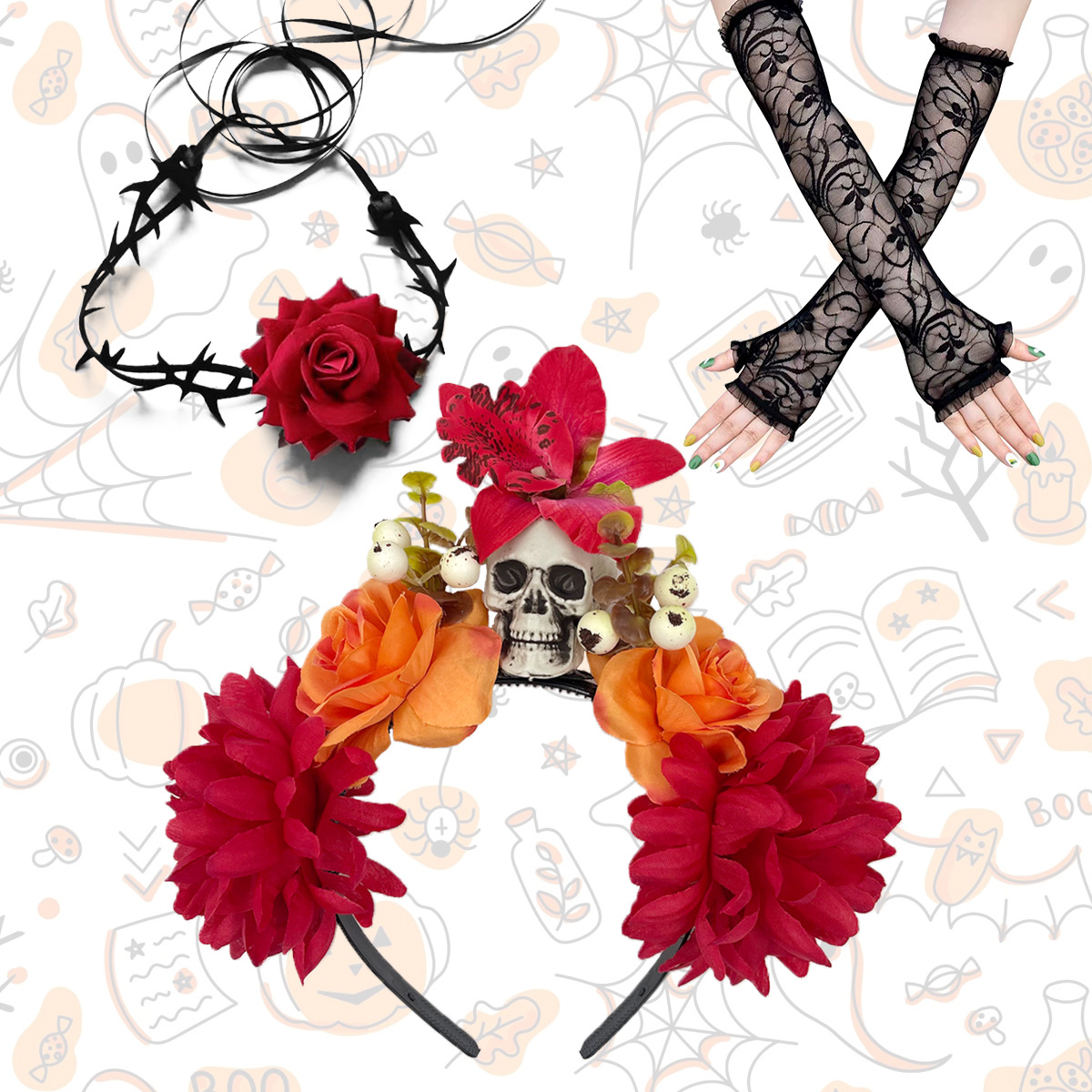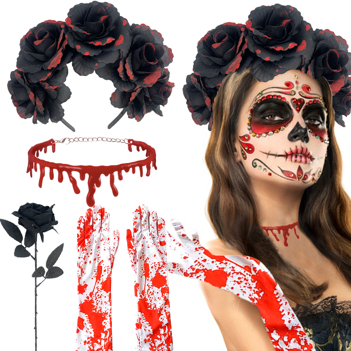 跨境热销万圣节搞怪发箍项链套装玫瑰花头箍女骷髅头发饰恐怖道具