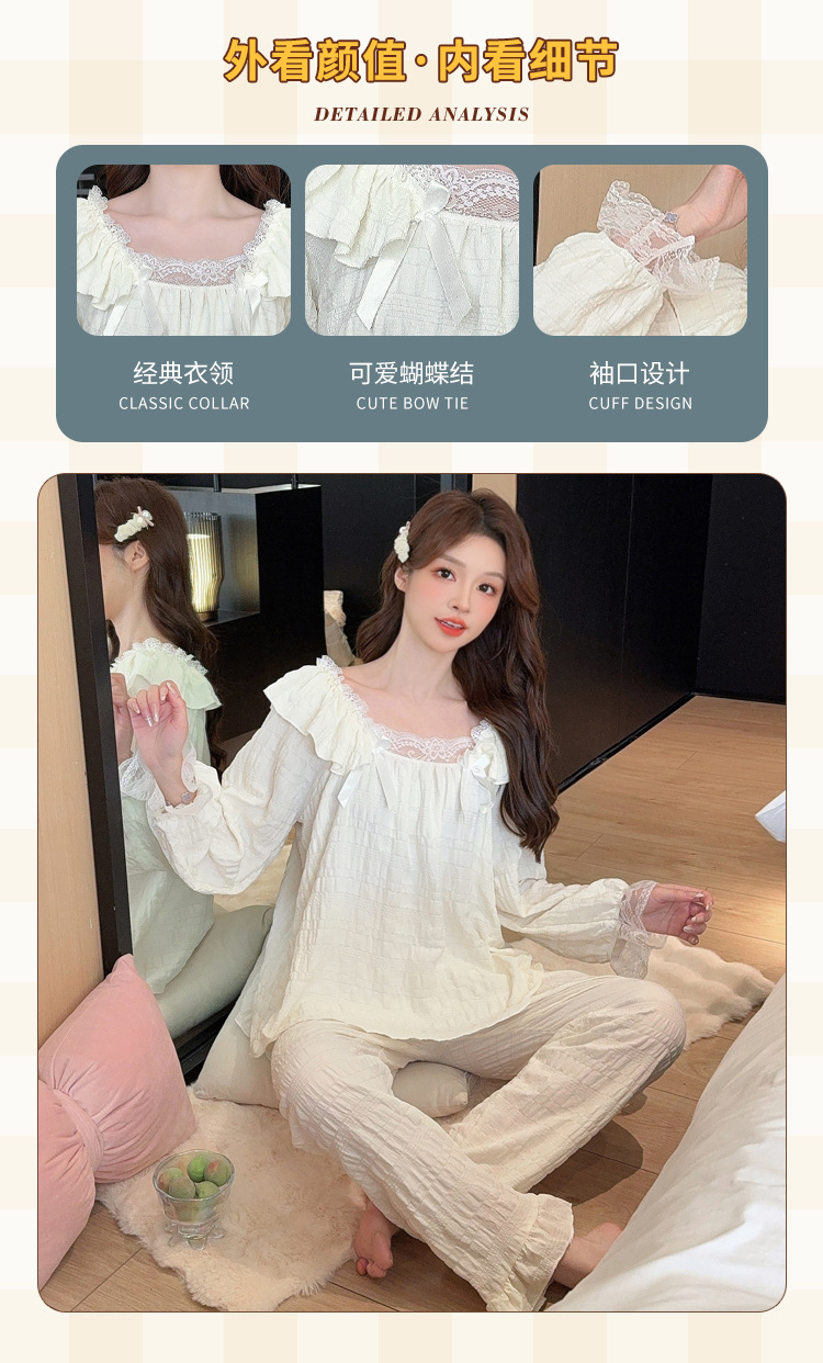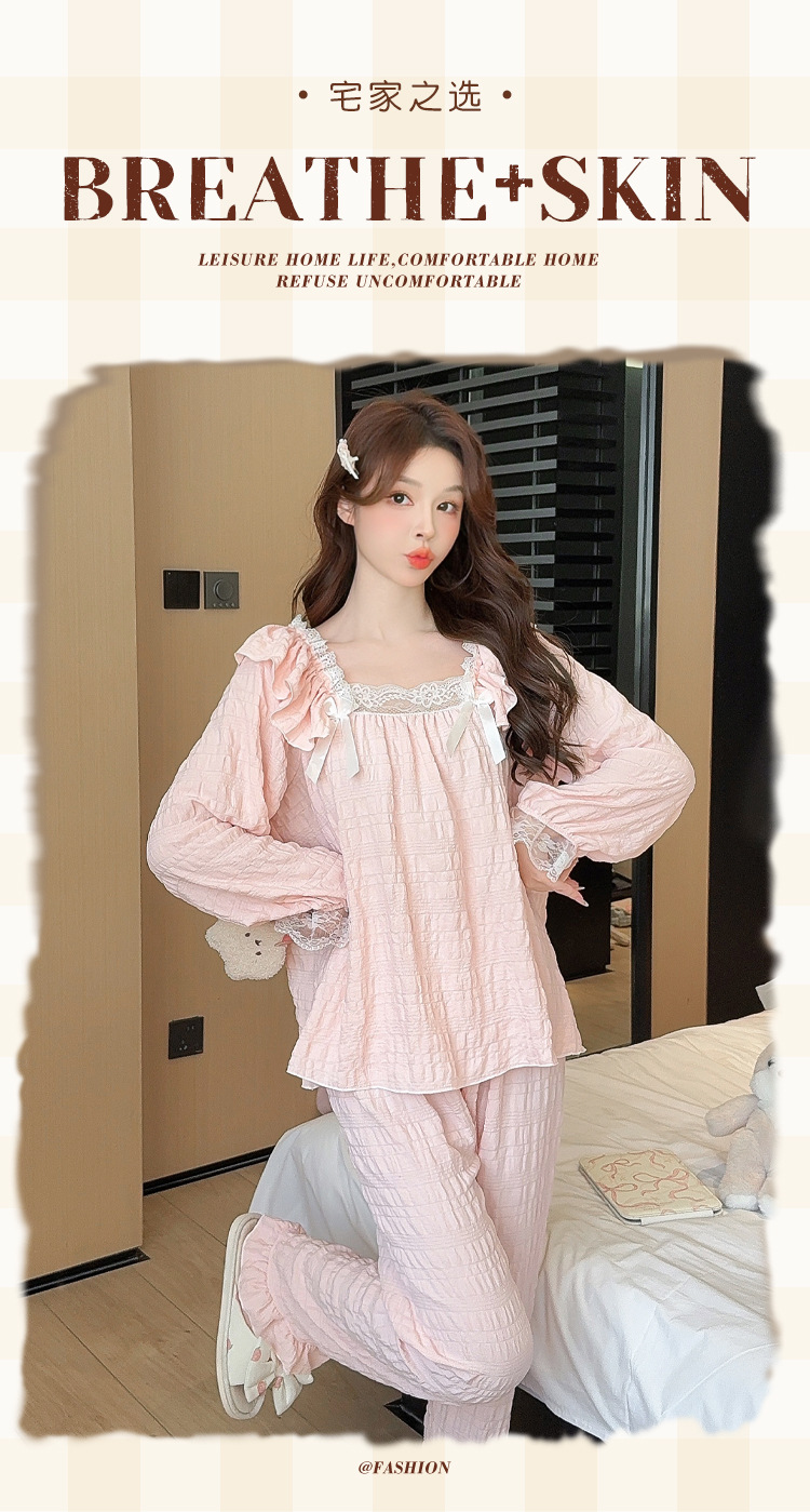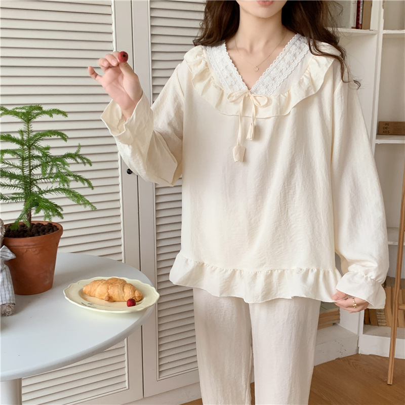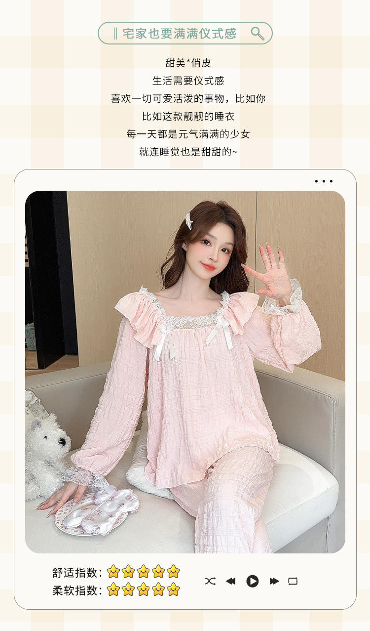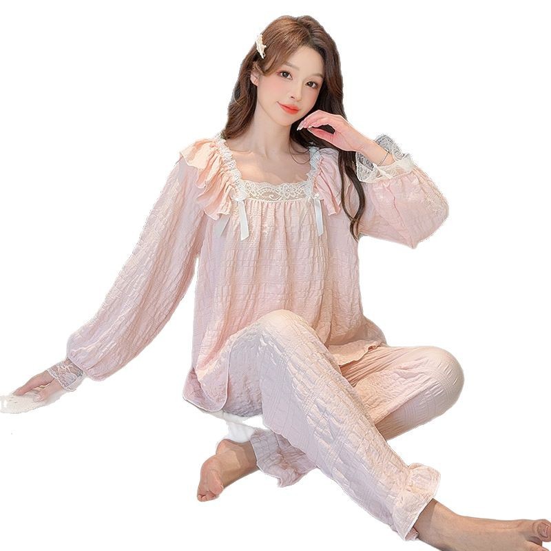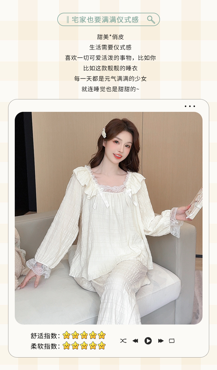 跨境睡衣女春季薄款云朵棉纯色简约花边少女套头长袖家居服可外穿