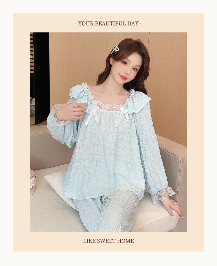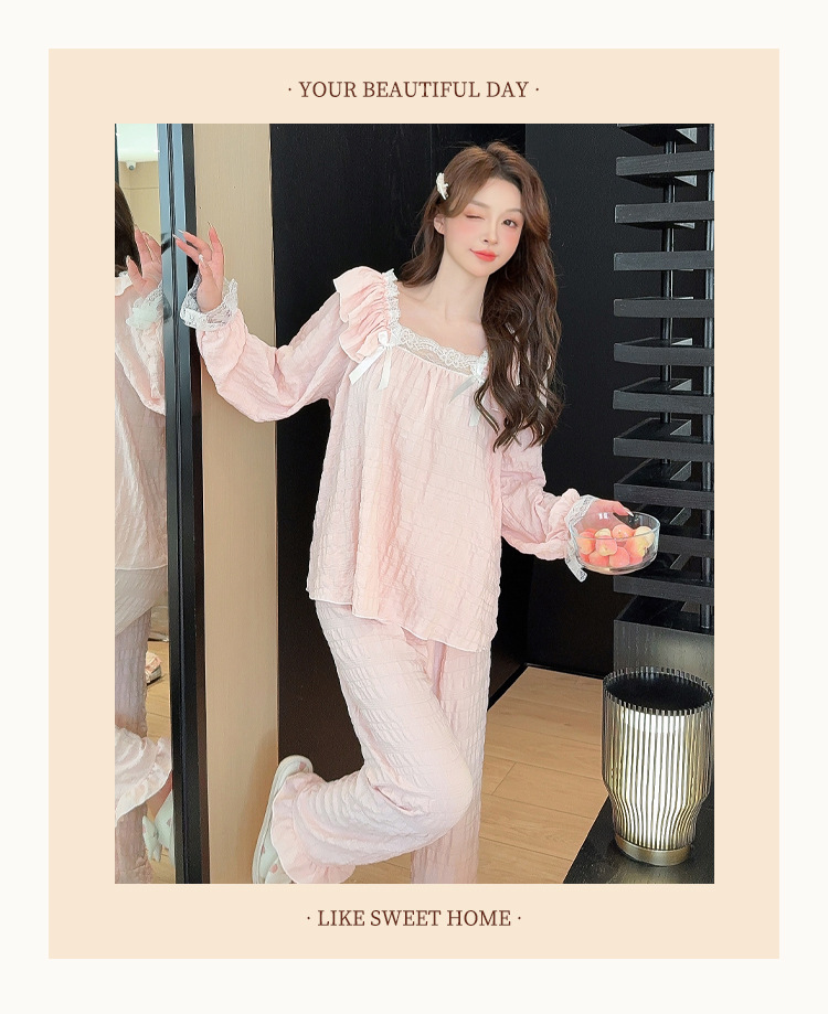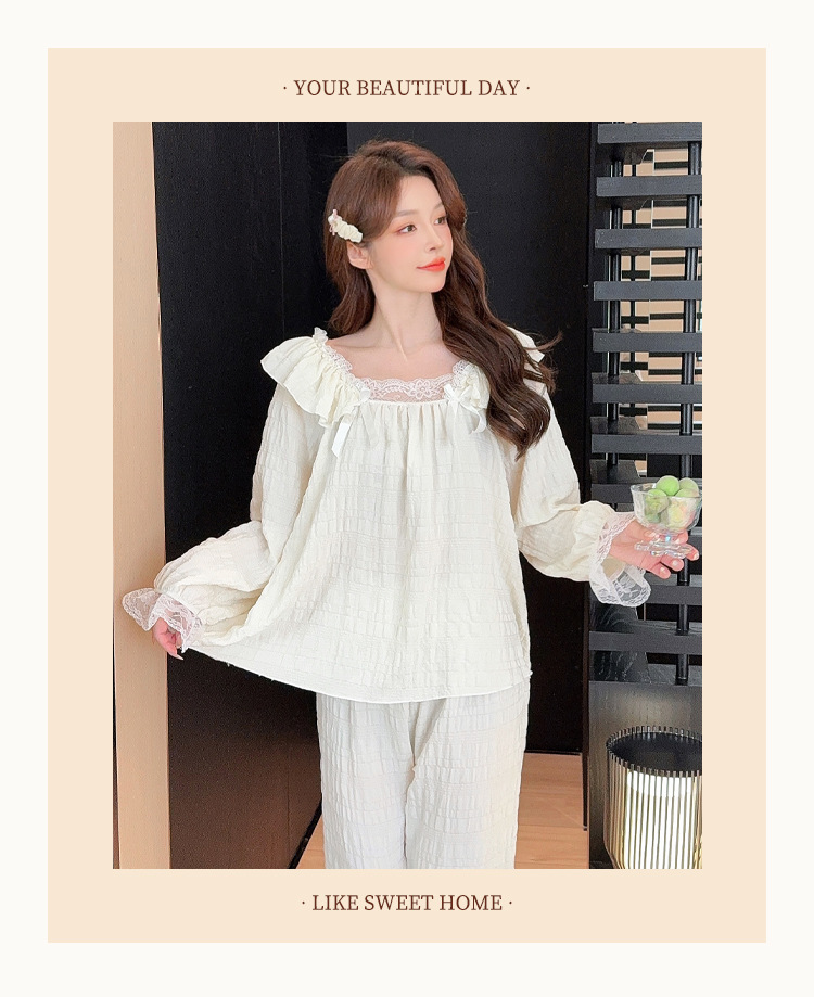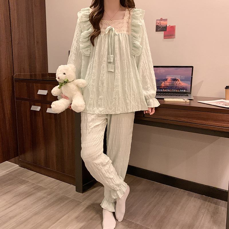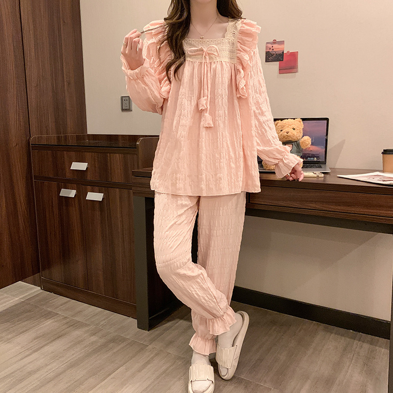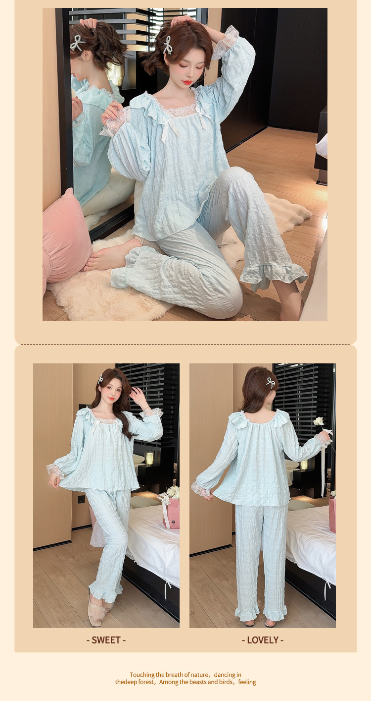 跨境睡衣女春季薄款云朵棉纯色简约花边少女套头长袖家居服可外穿