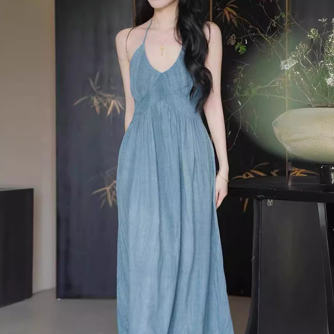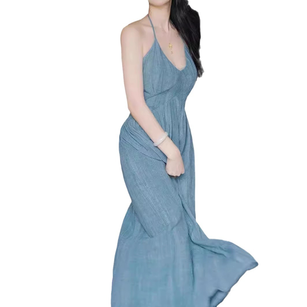 天青色等烟雨2024夏季新款V领国风吊带收腰气质亚麻中长款连衣裙