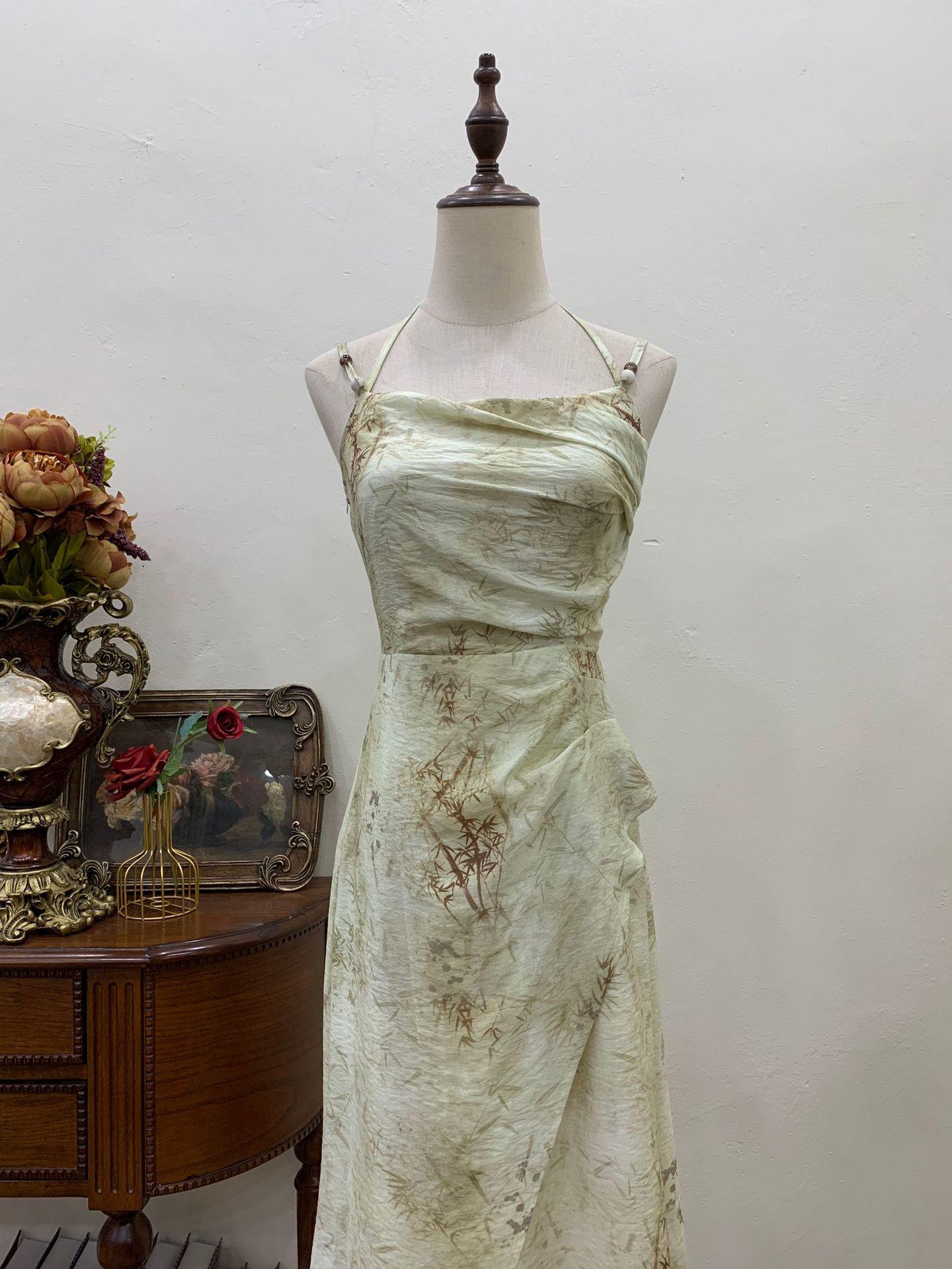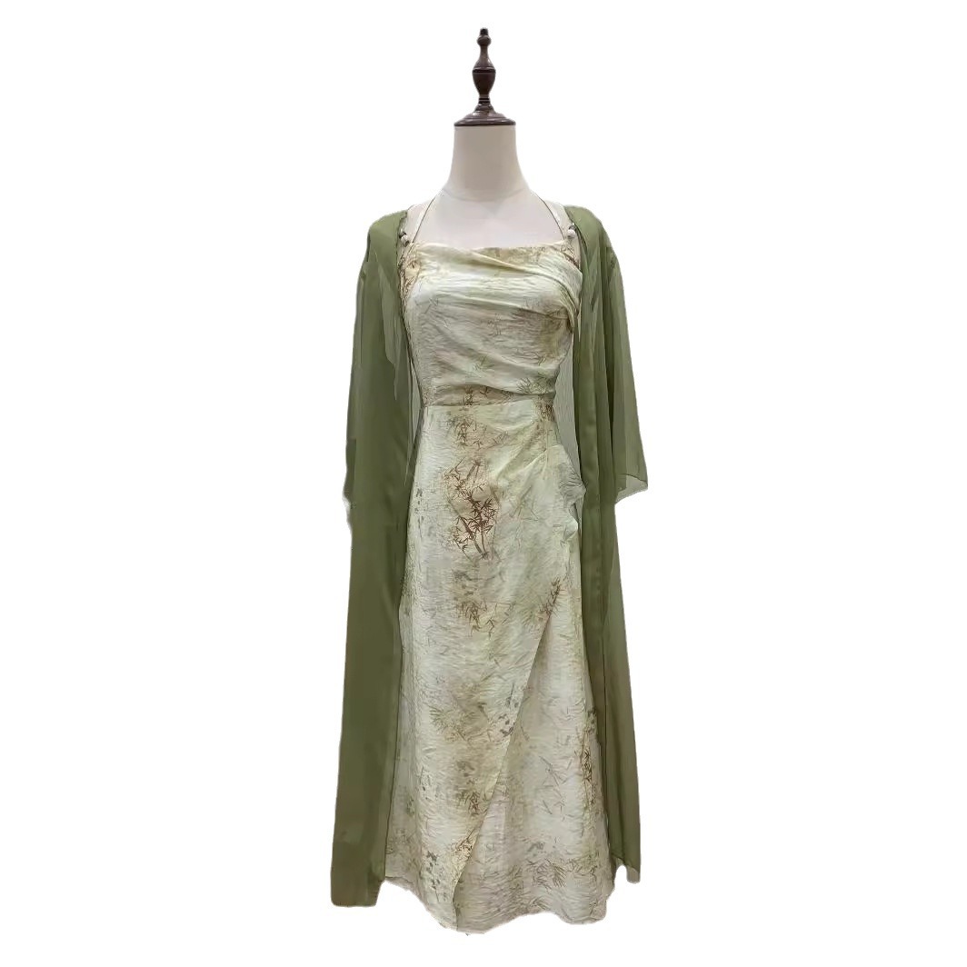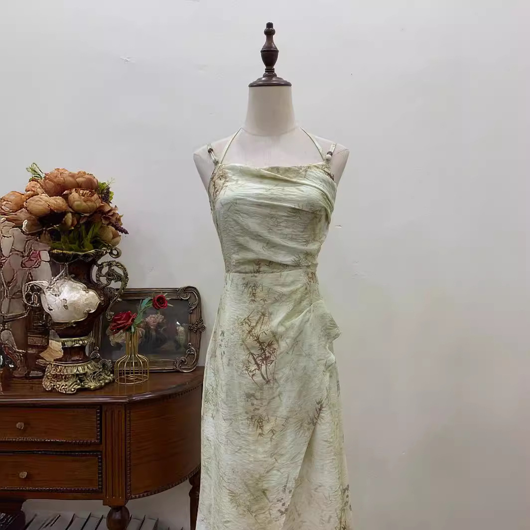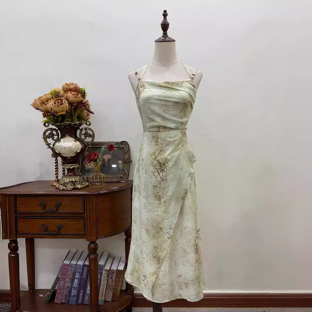 2023夏季新中式国风复古吊带连衣裙碎花收腰显瘦