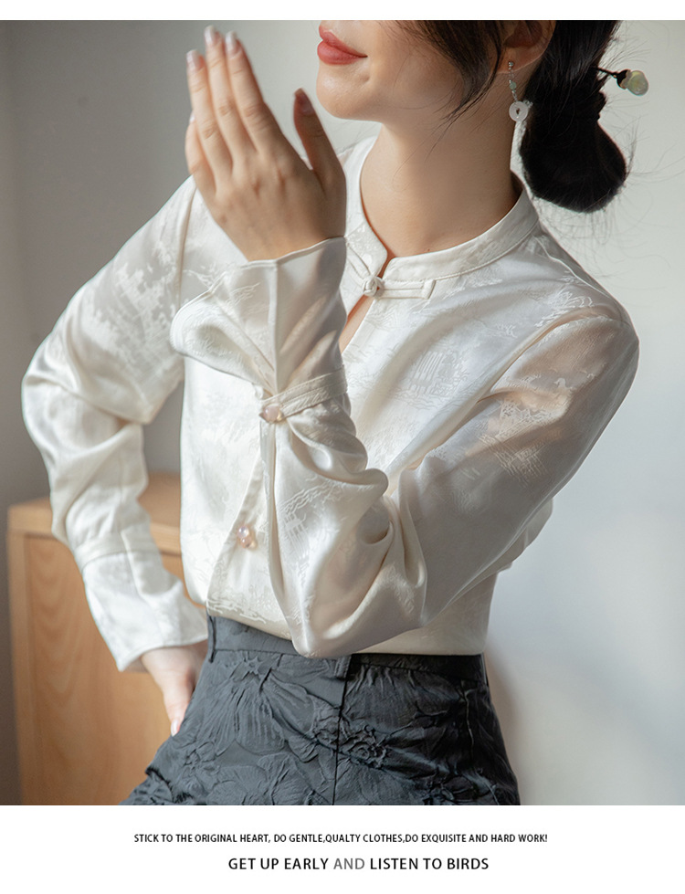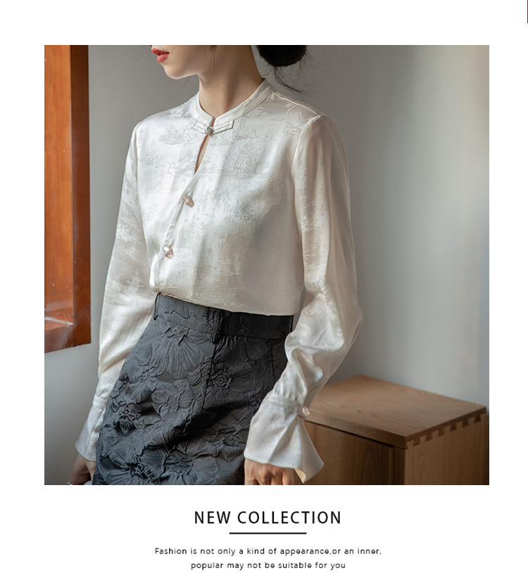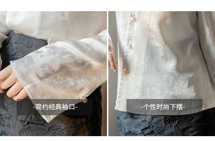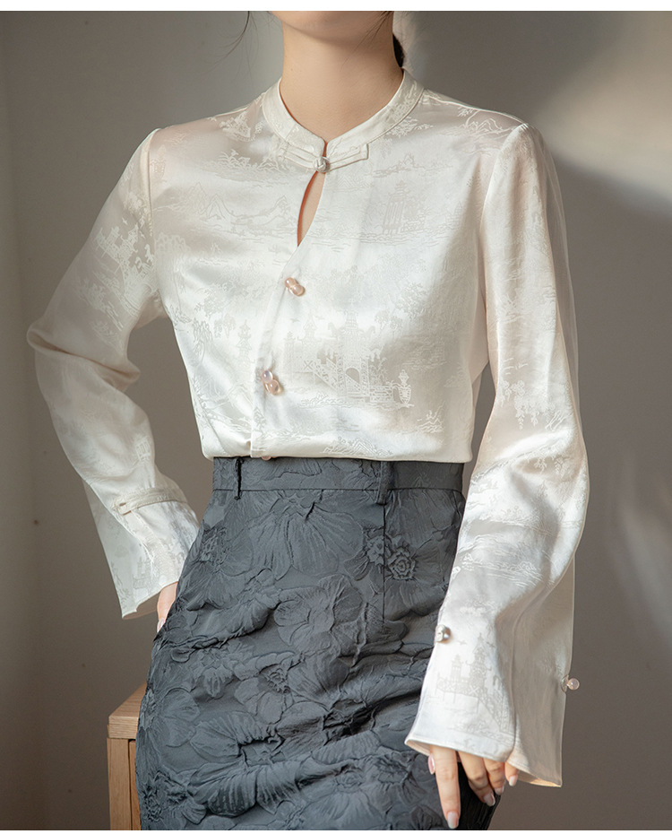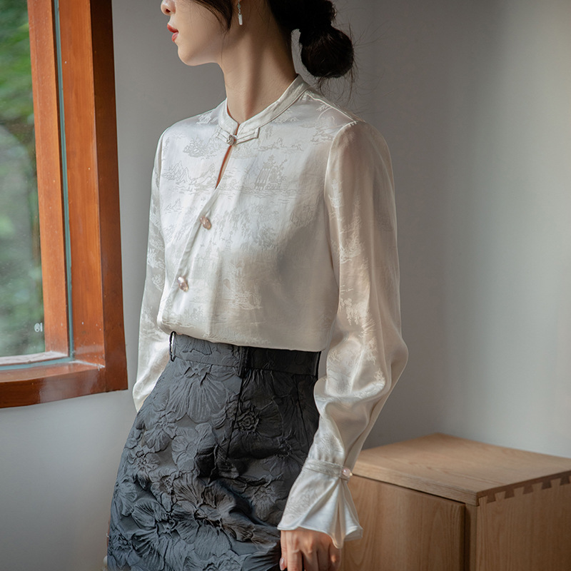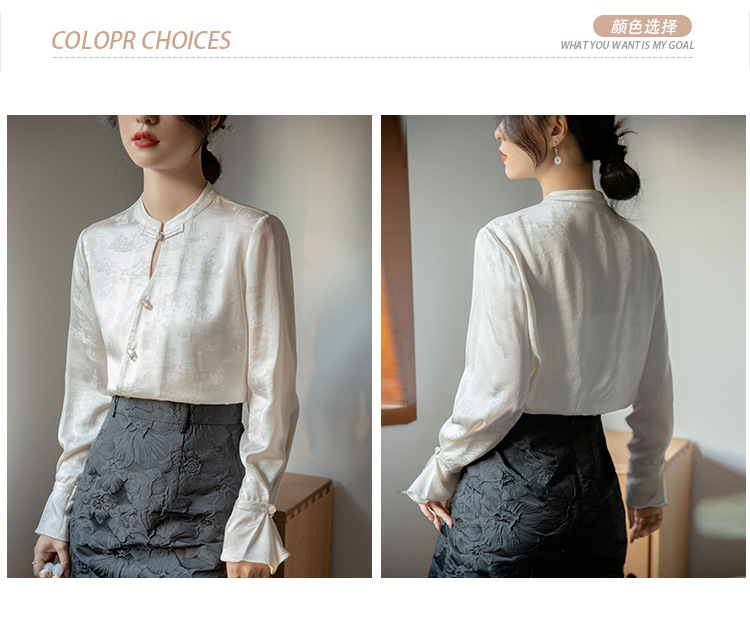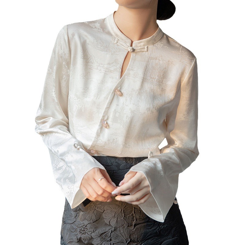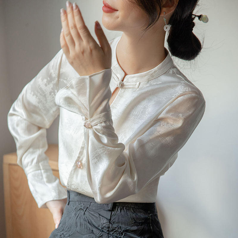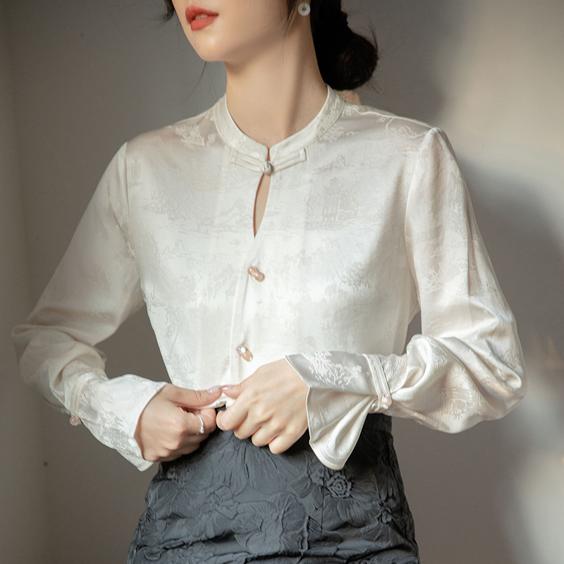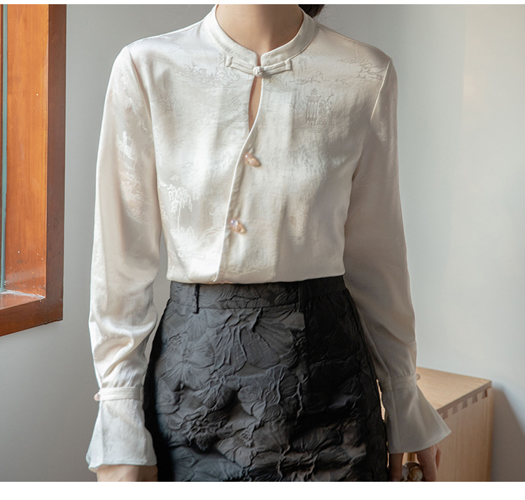 提花醋酸缎面新中式盘扣衬衫女秋季新款设计感小众时尚通勤上衣
