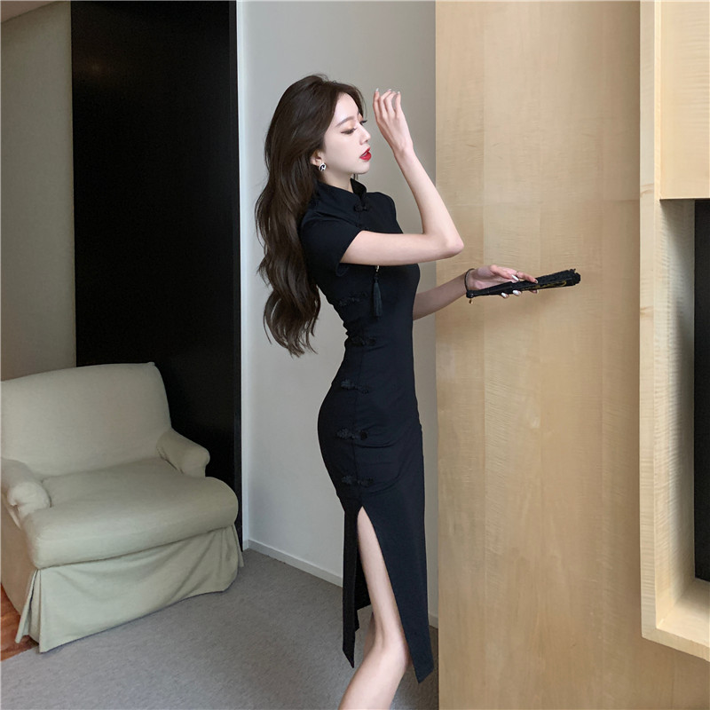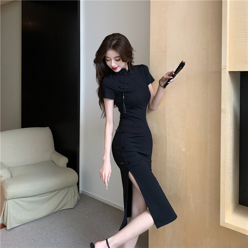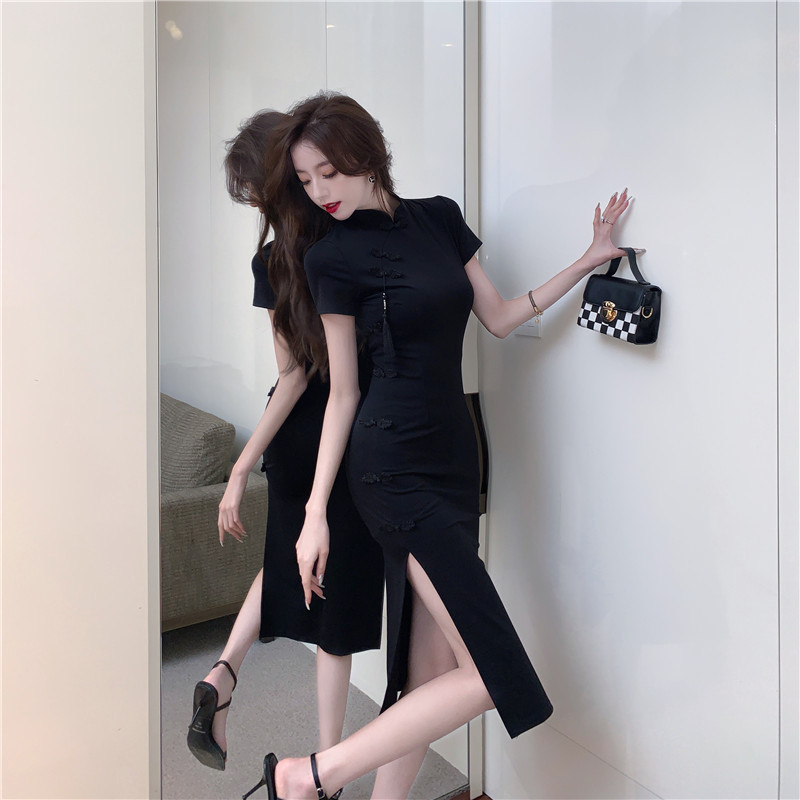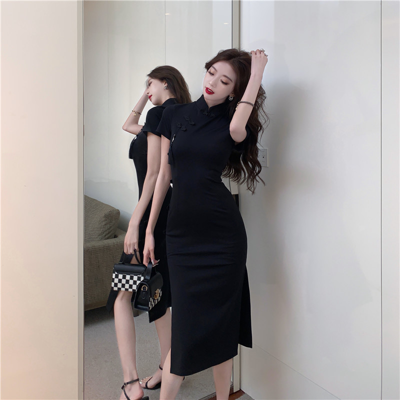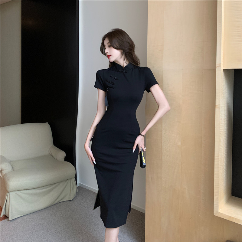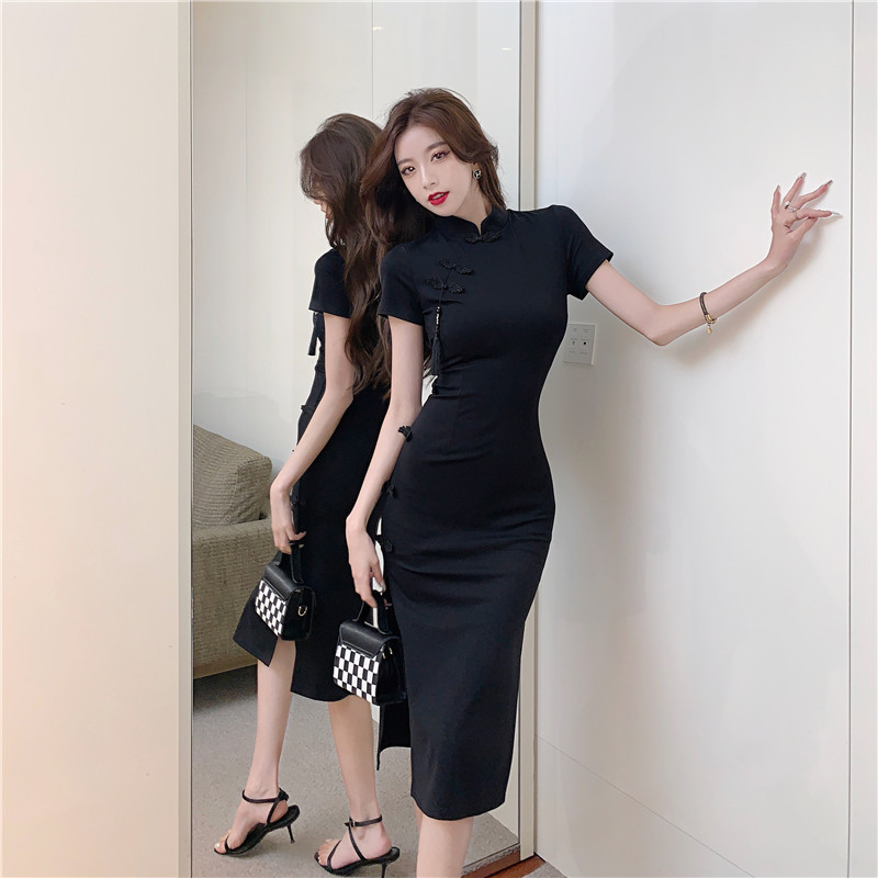 中式复古盘扣旗袍连衣裙女夏季高级感气质小黑裙收腰显瘦包臀长裙