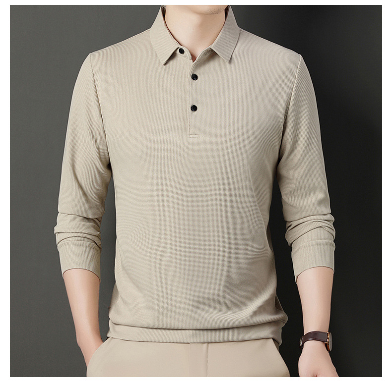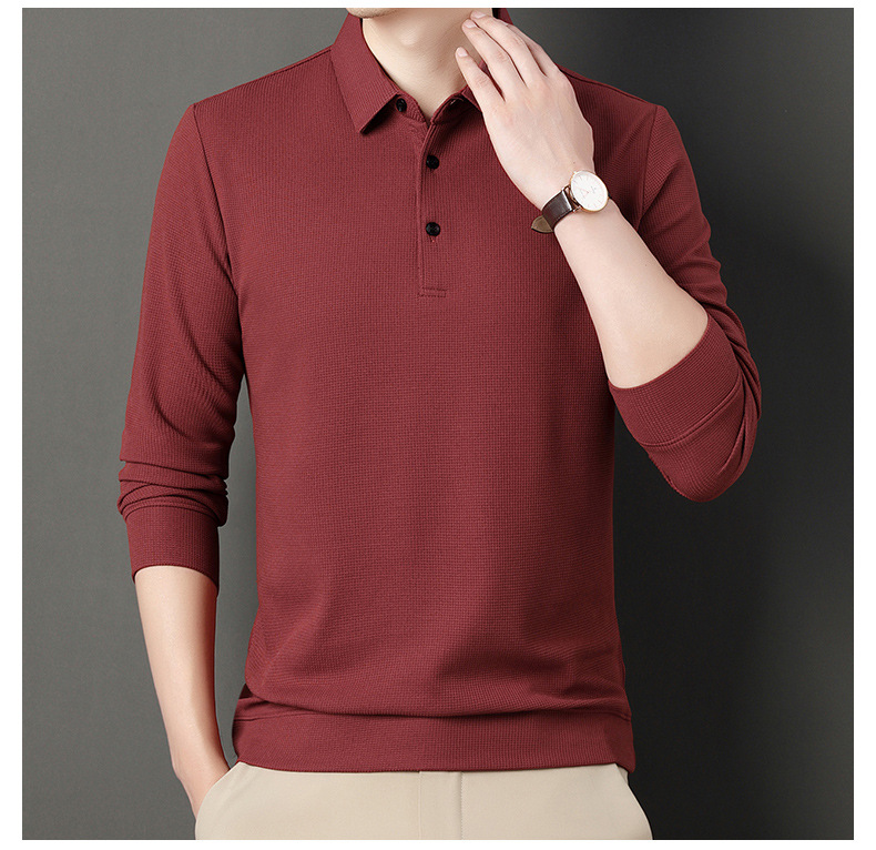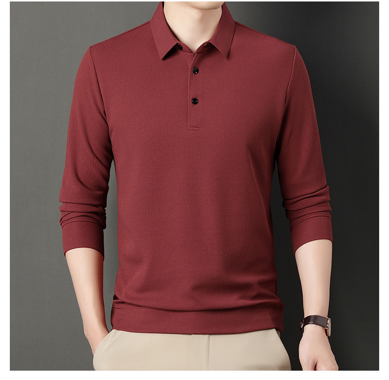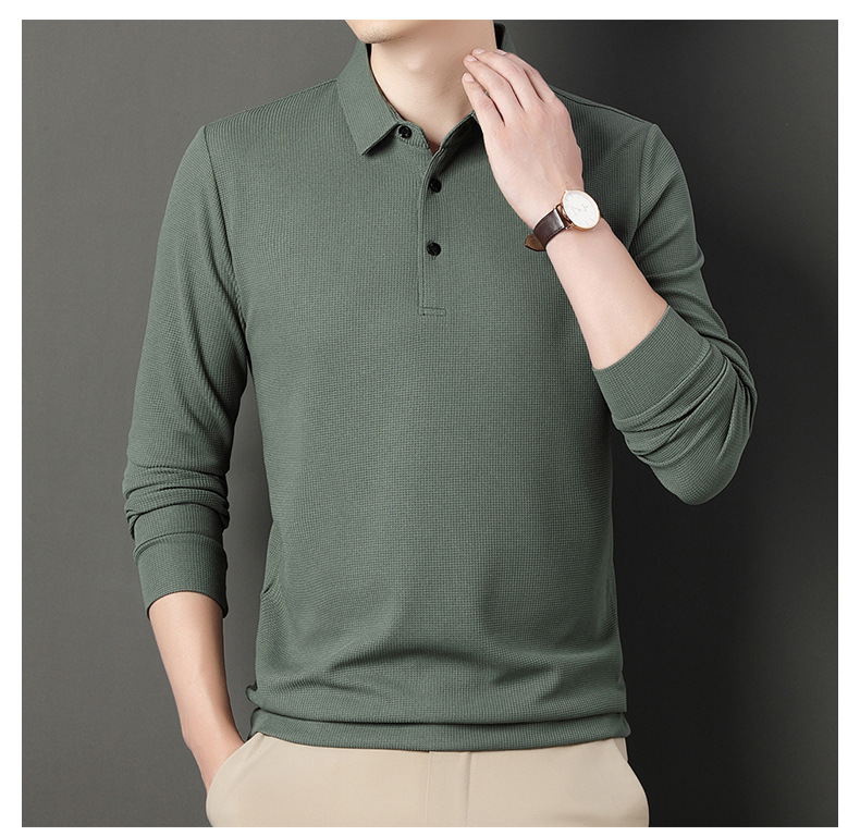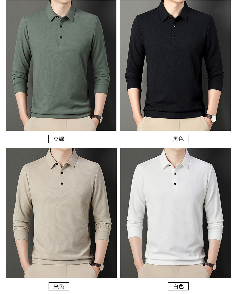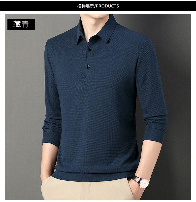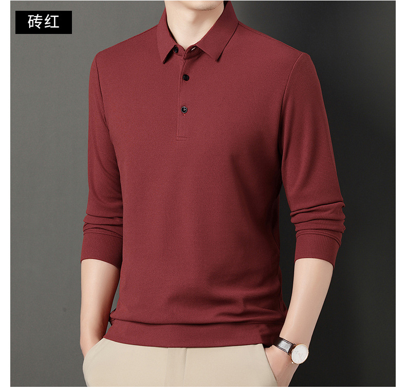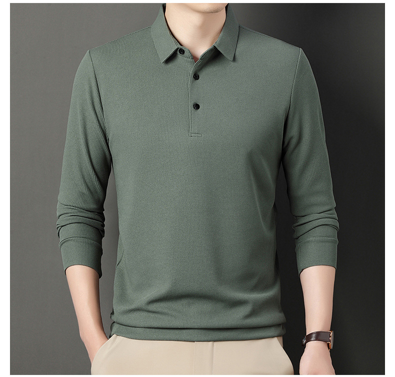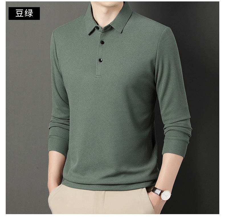 男士长袖t恤2025春季新款纯色翻领华夫格polo衫中青年休闲体恤衫