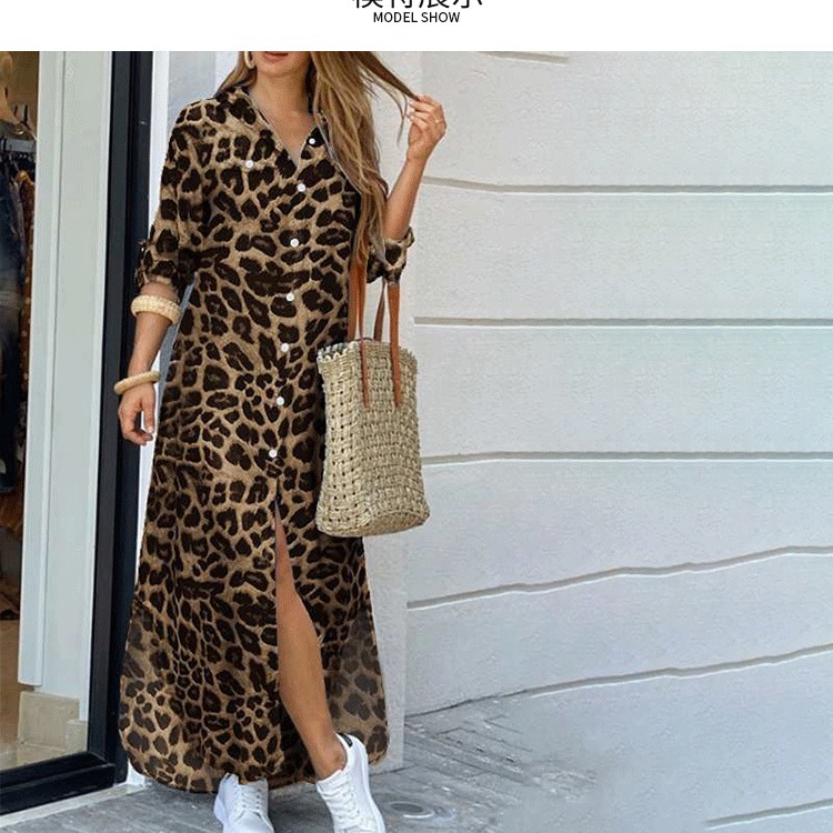 速卖通跨境外贸2022新潮豹纹欧美女装时尚裙子开叉长款衬衫连衣裙