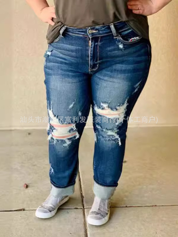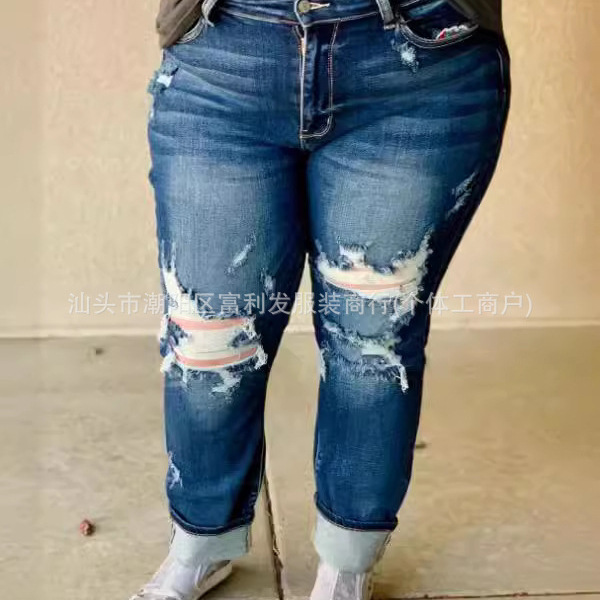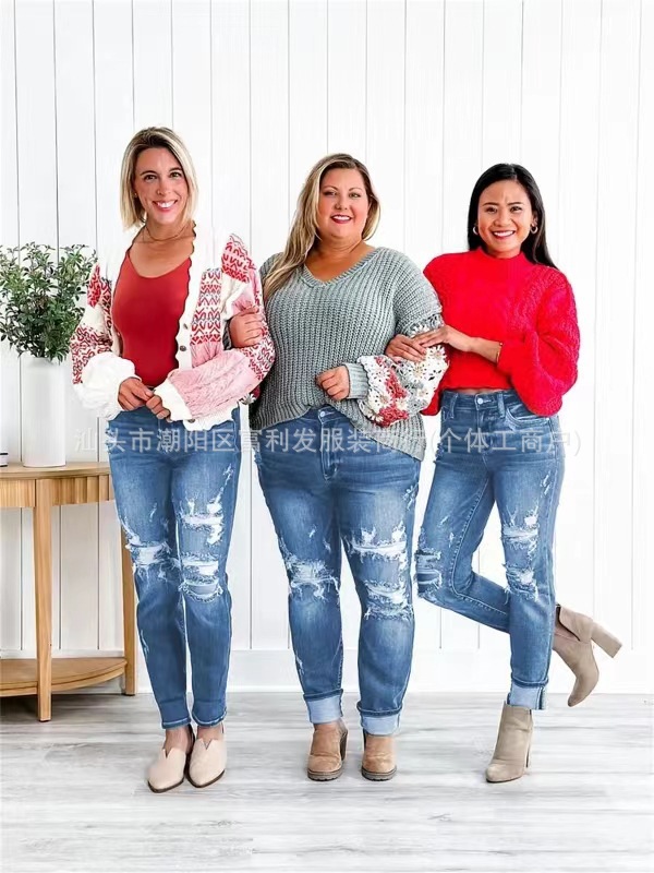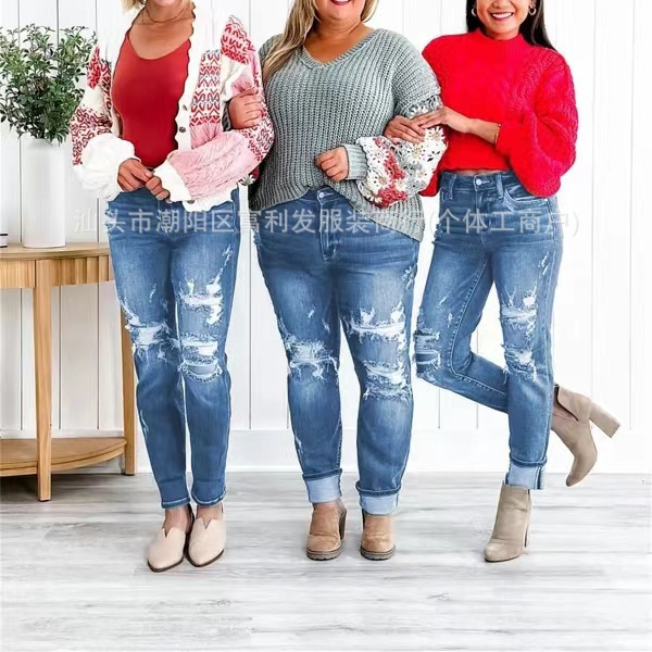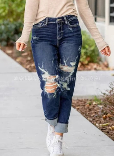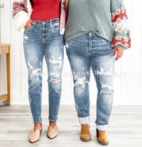 厂家直销欧美跨境新款外贸女牛仔裤独立站破洞中腰小脚裤嘻哈长裤