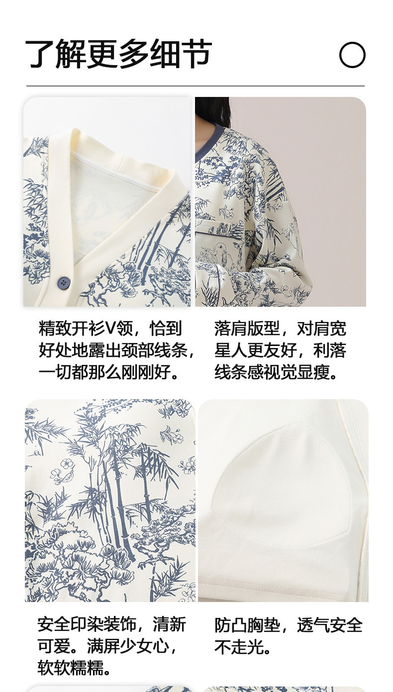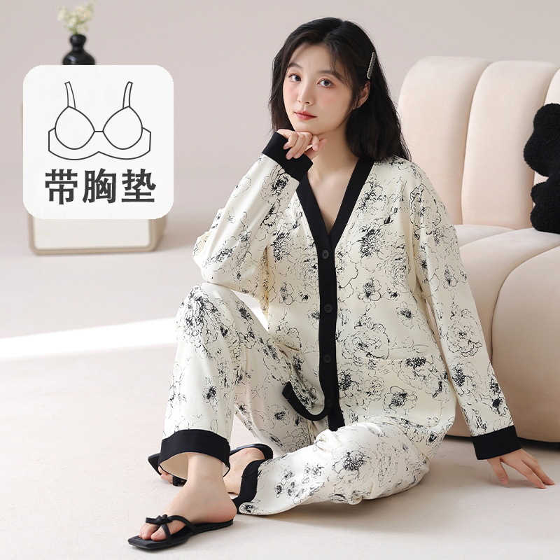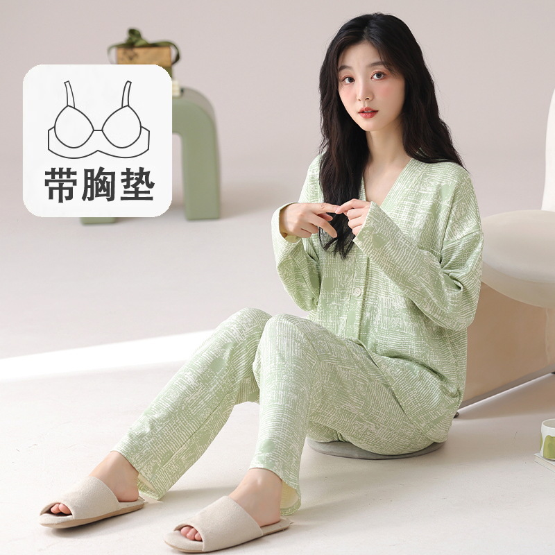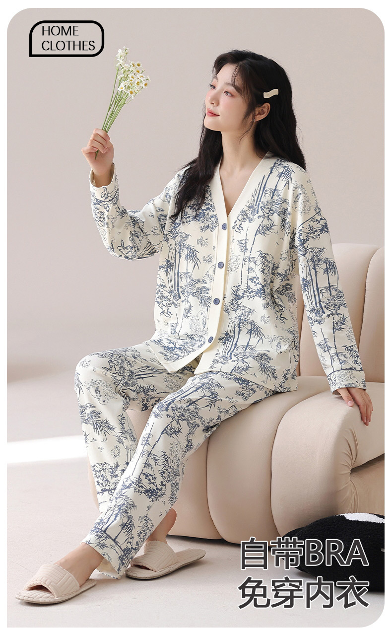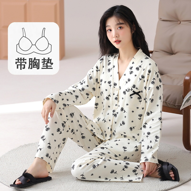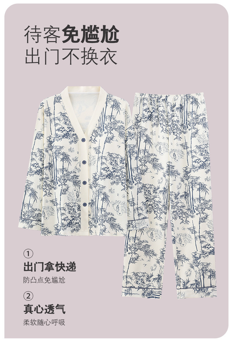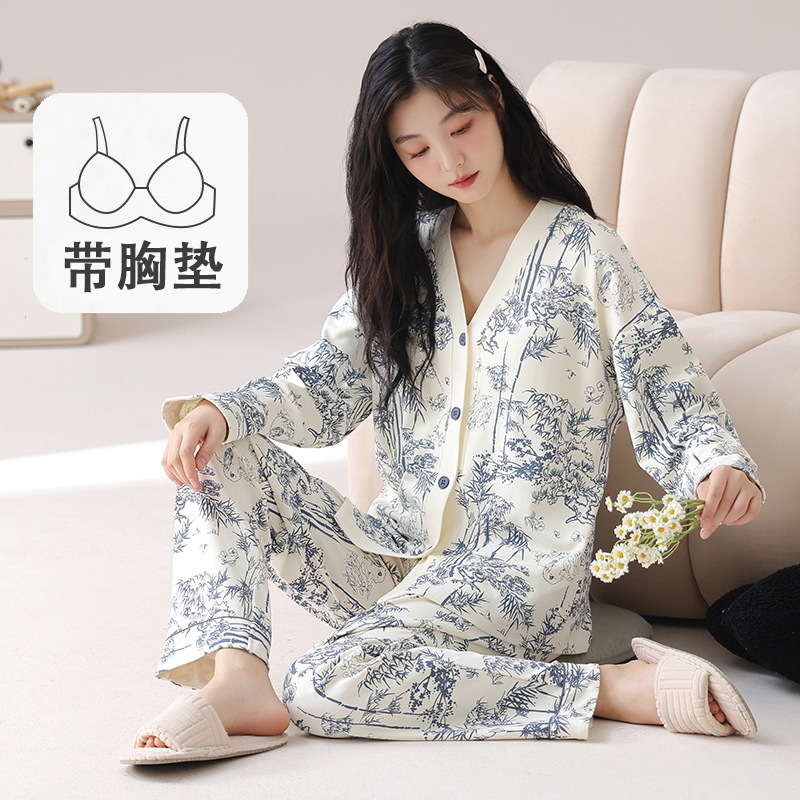 带胸垫春秋国风新款和服睡衣女长袖长裤可外穿套装V领开衫家居服