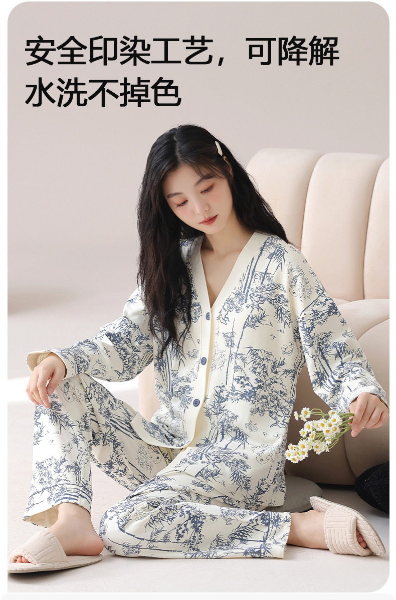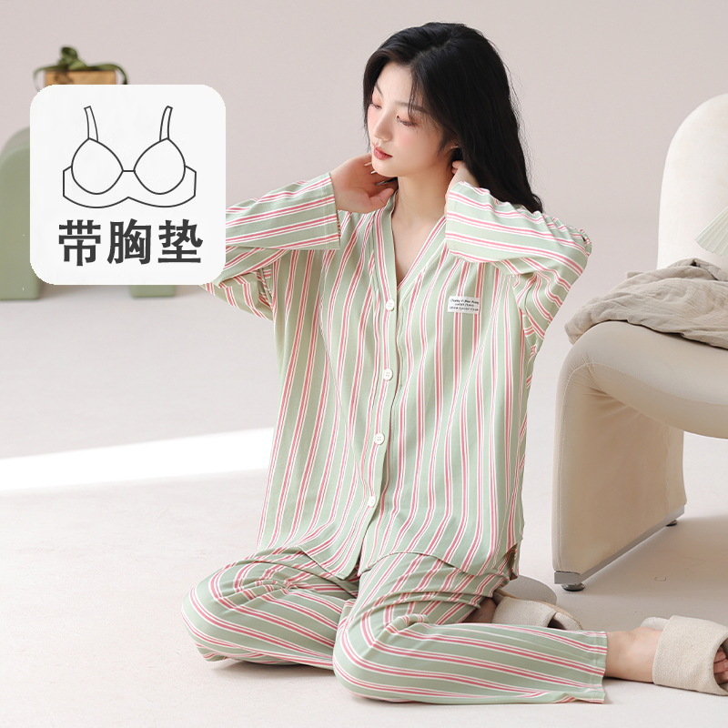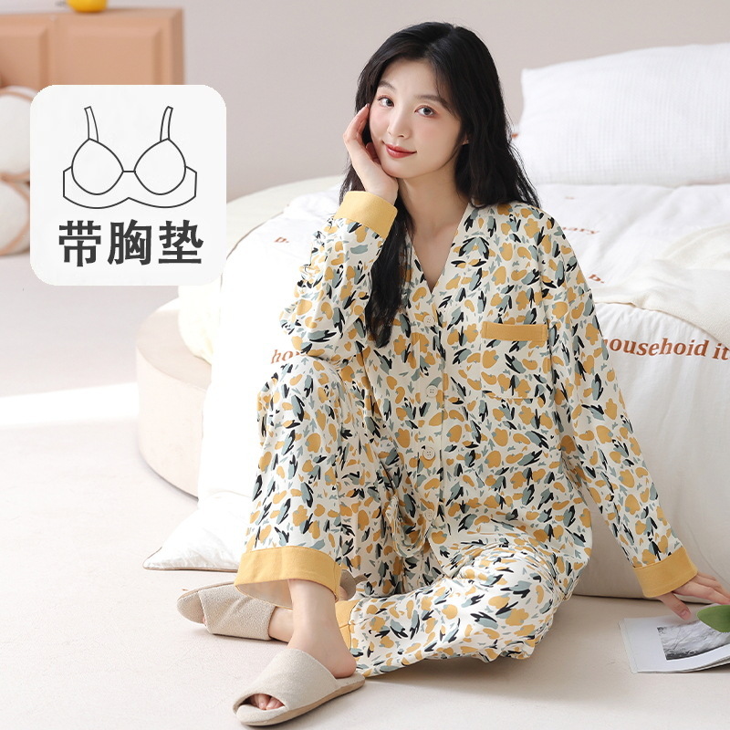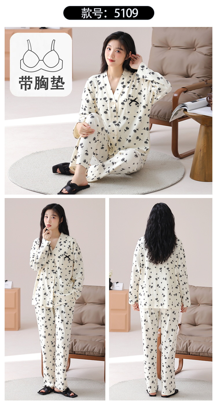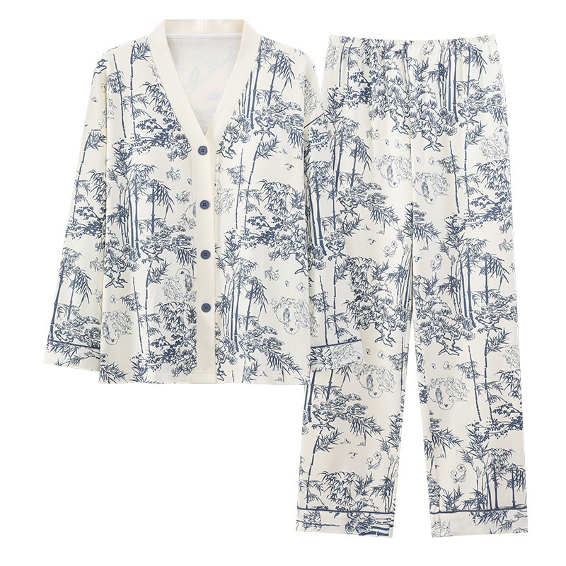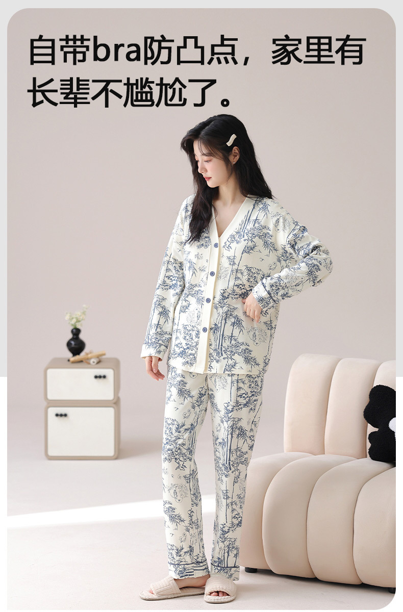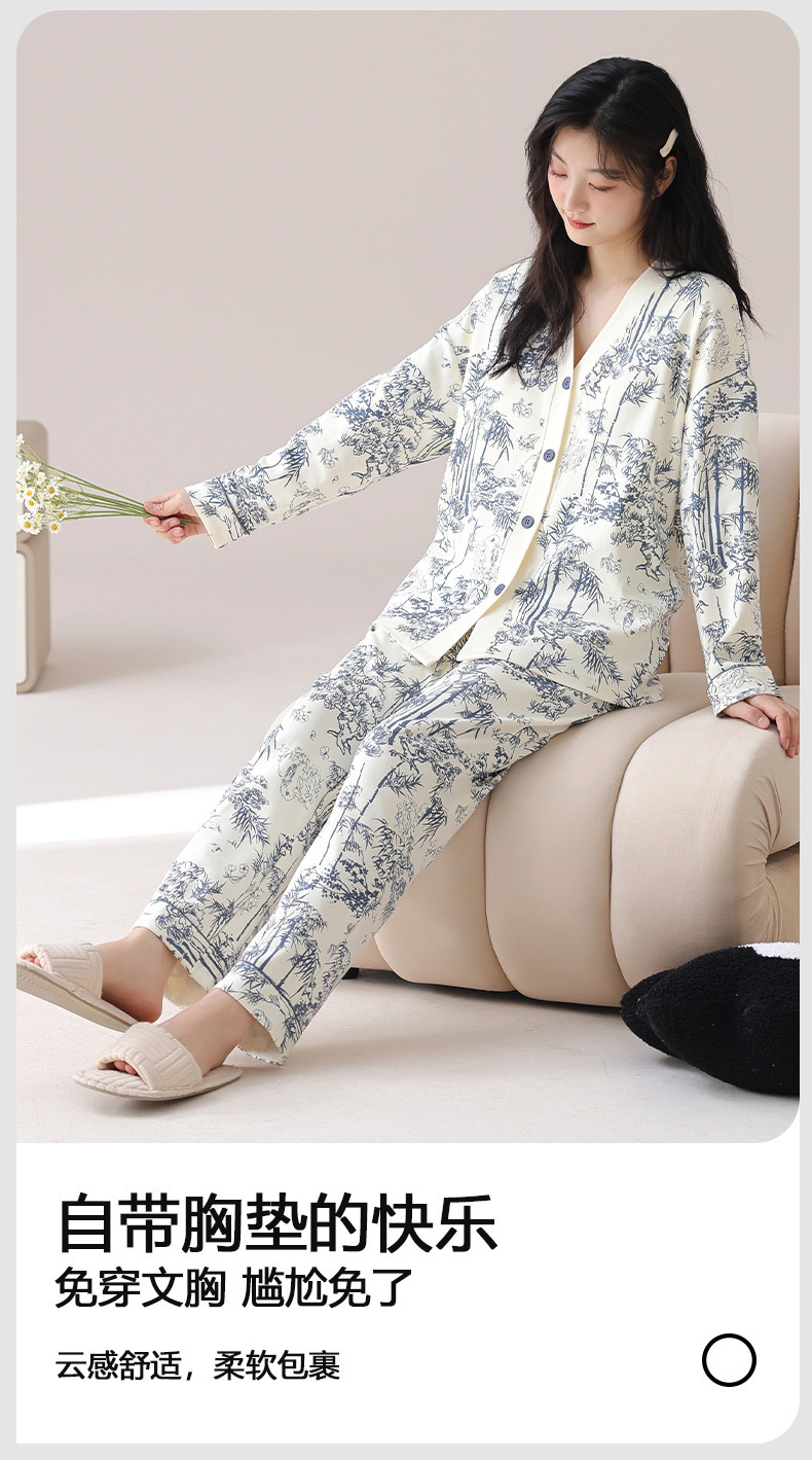 带胸垫春秋国风新款和服睡衣女长袖长裤可外穿套装V领开衫家居服