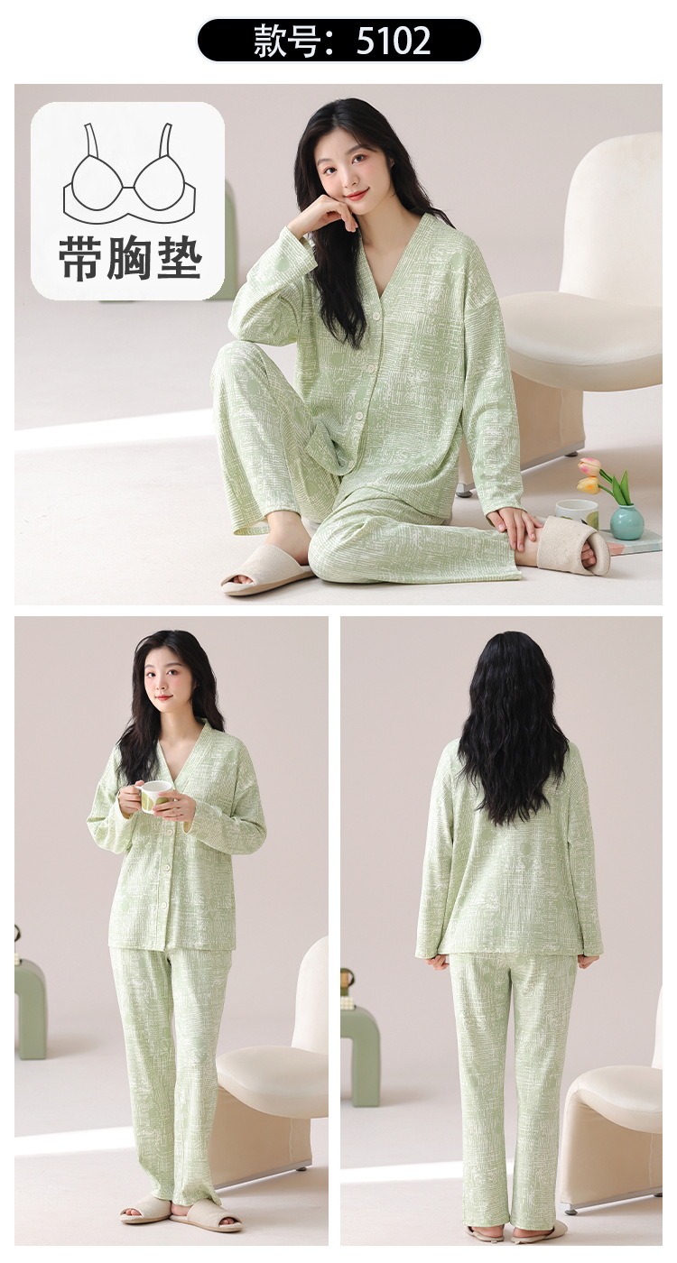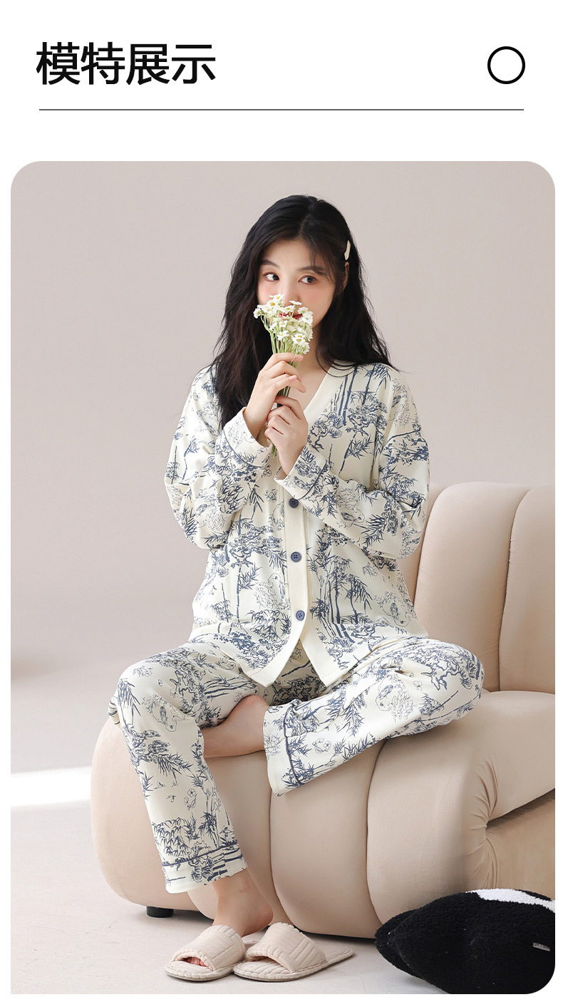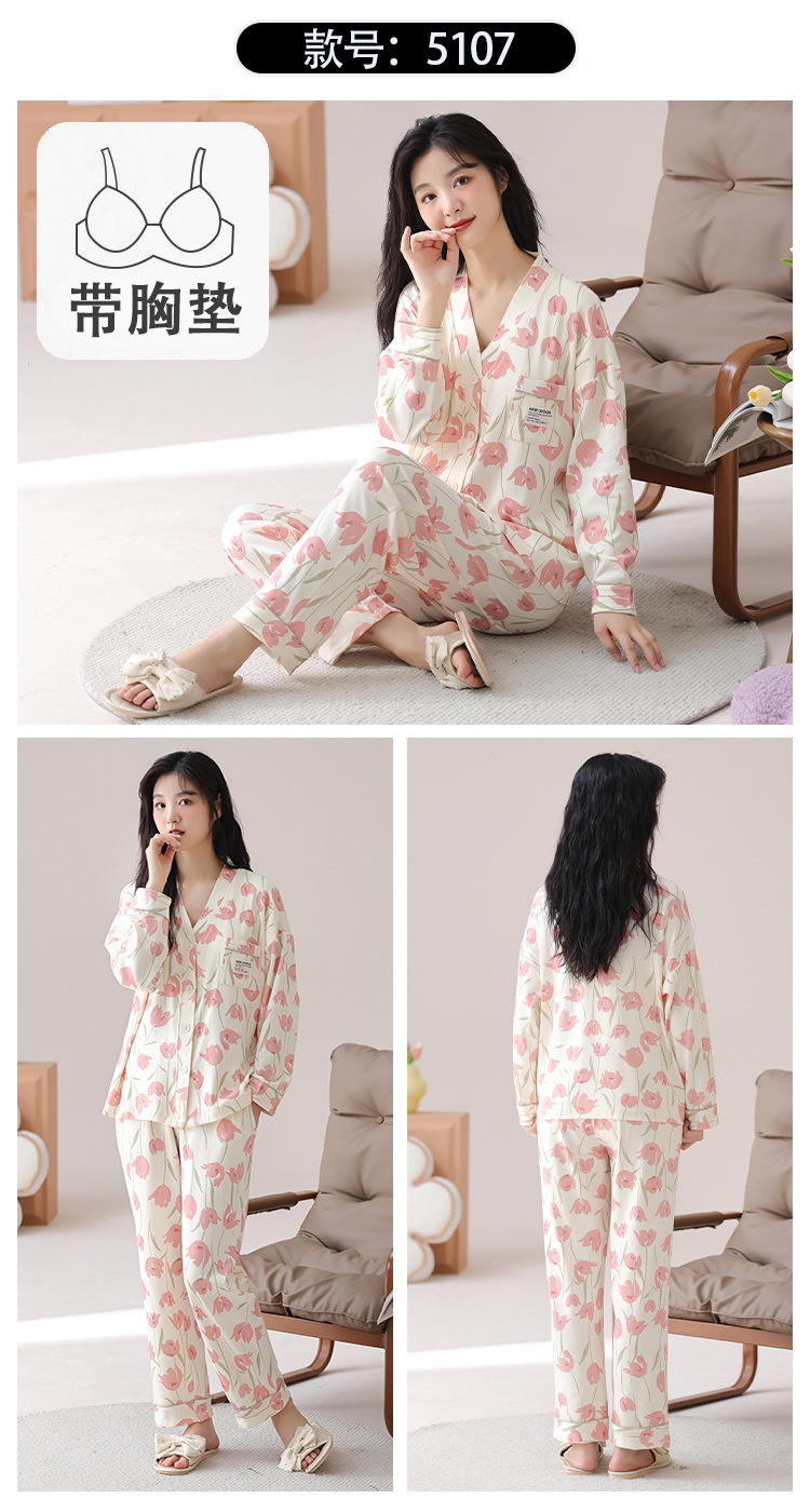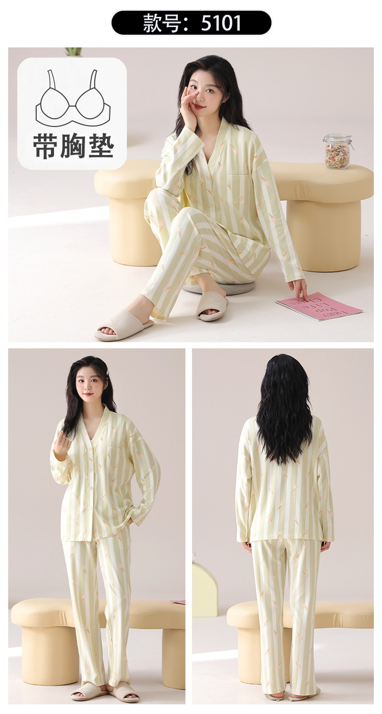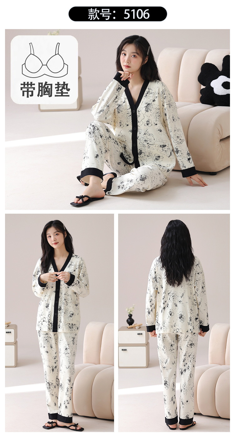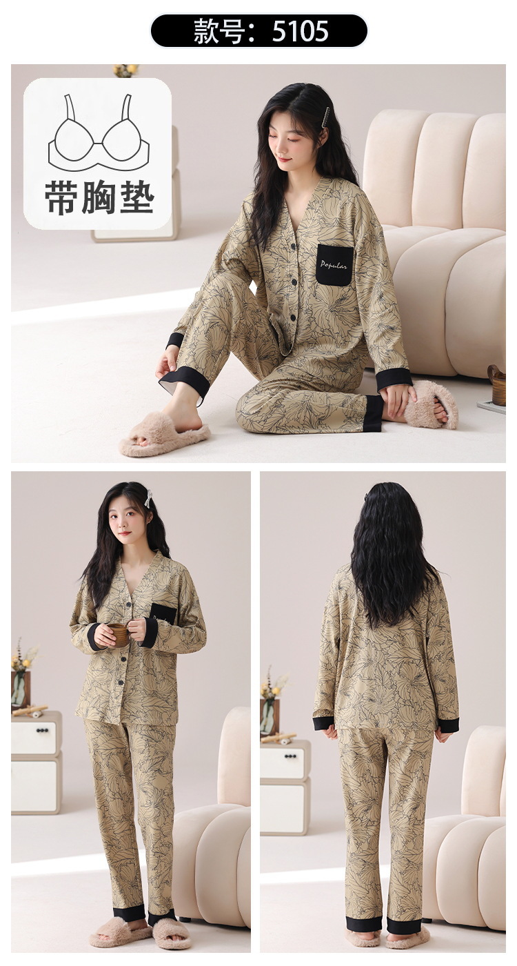 带胸垫春秋国风新款和服睡衣女长袖长裤可外穿套装V领开衫家居服