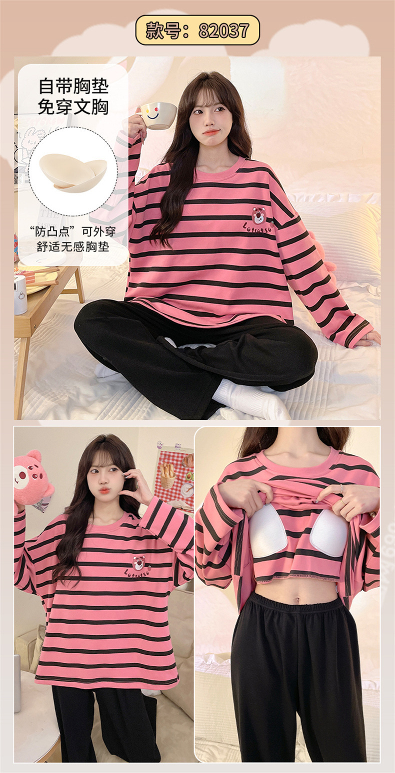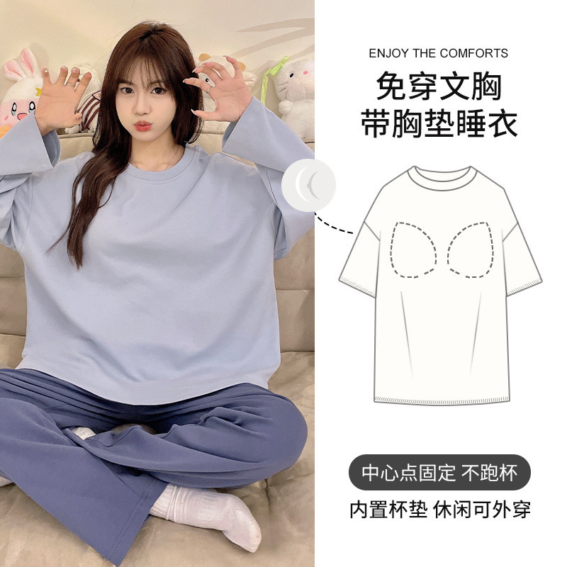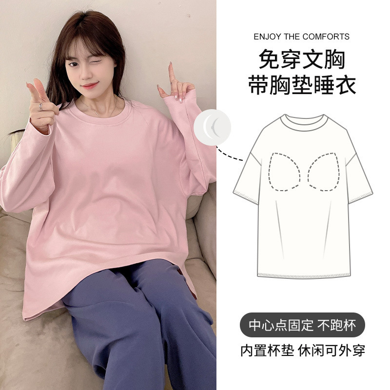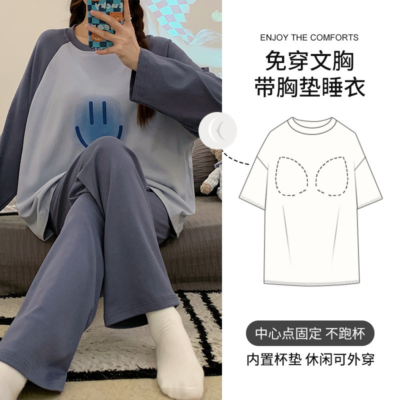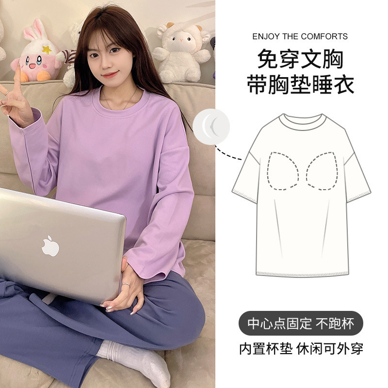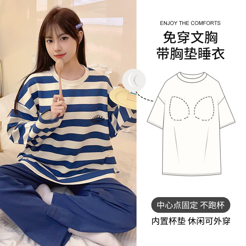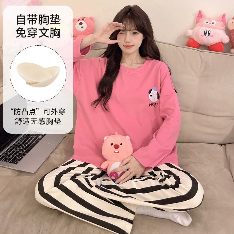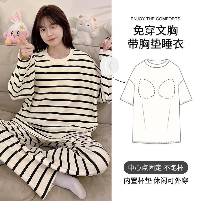 2025新款春秋季天长袖带胸垫一体睡衣女长裤冬款家居服套装可外穿