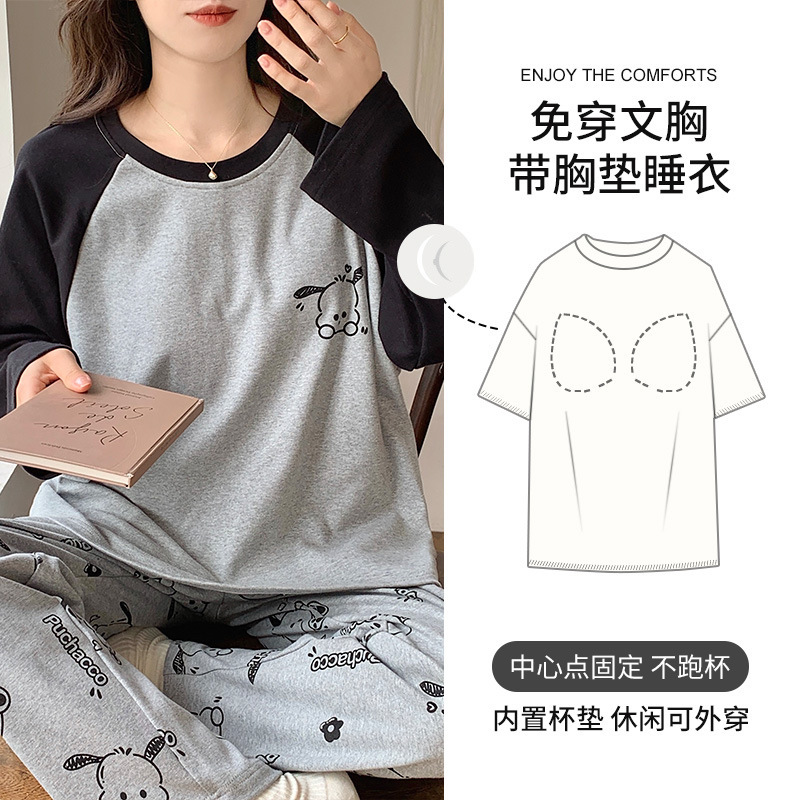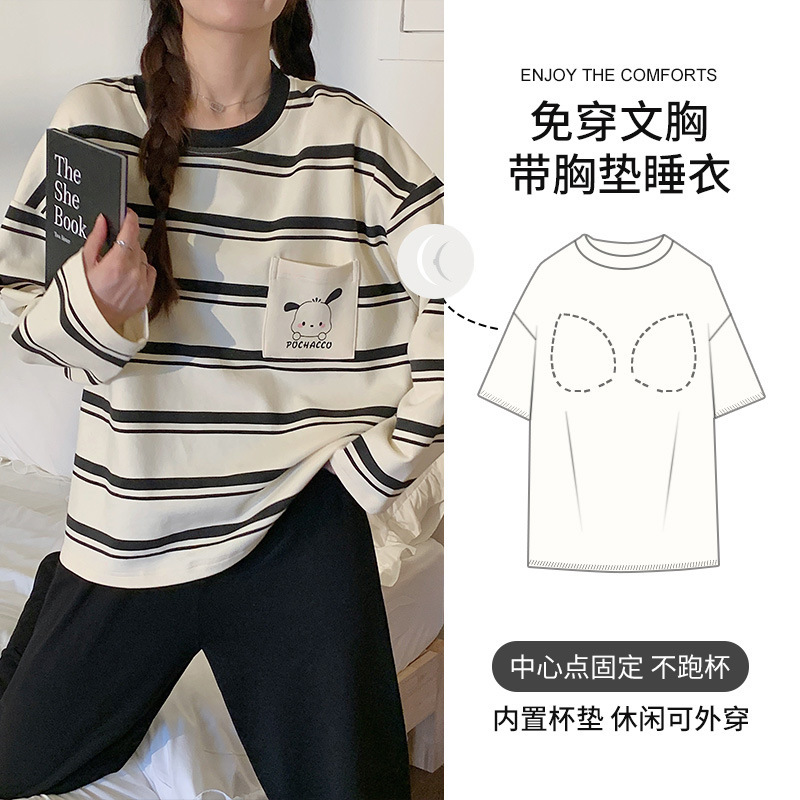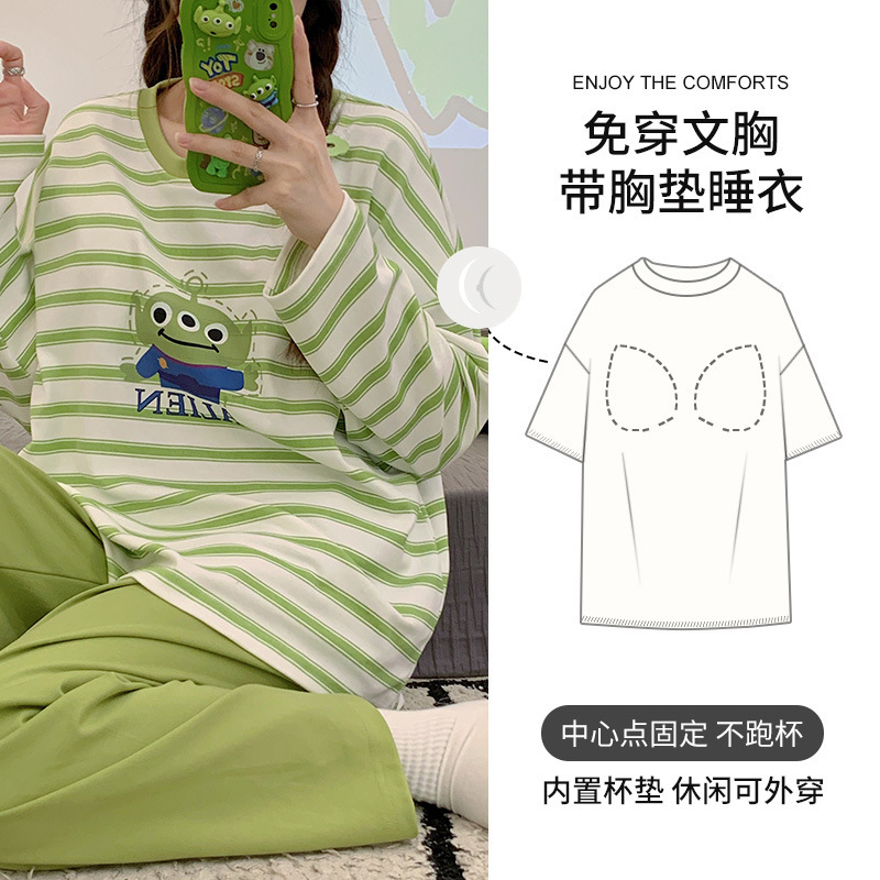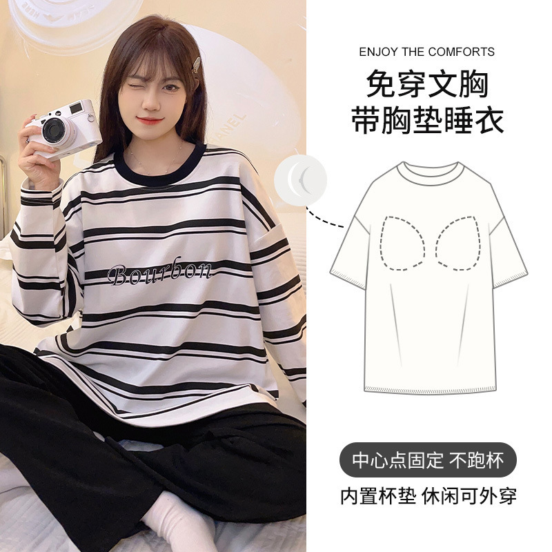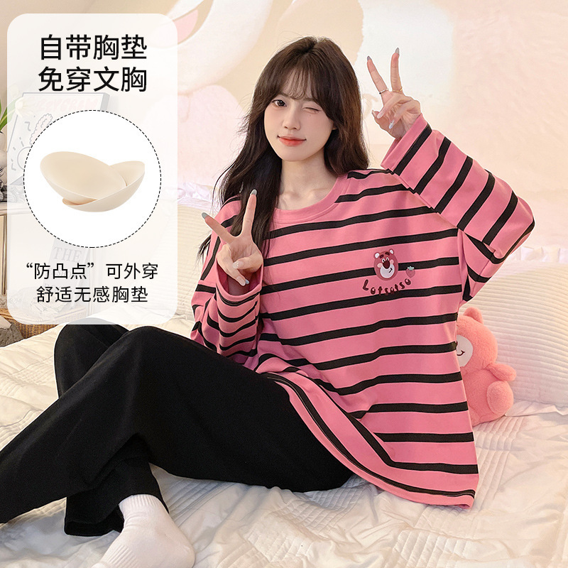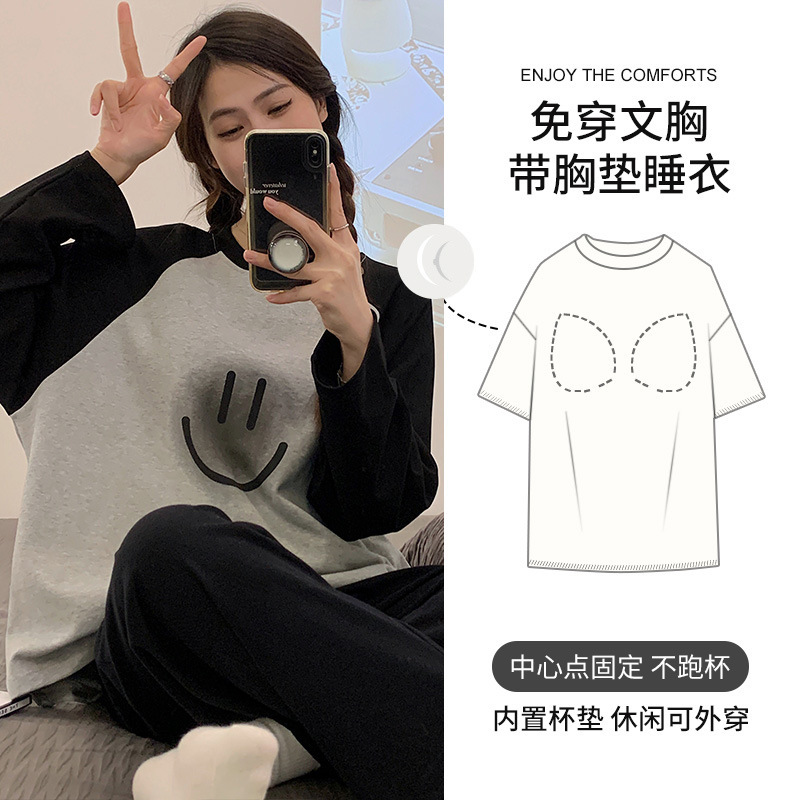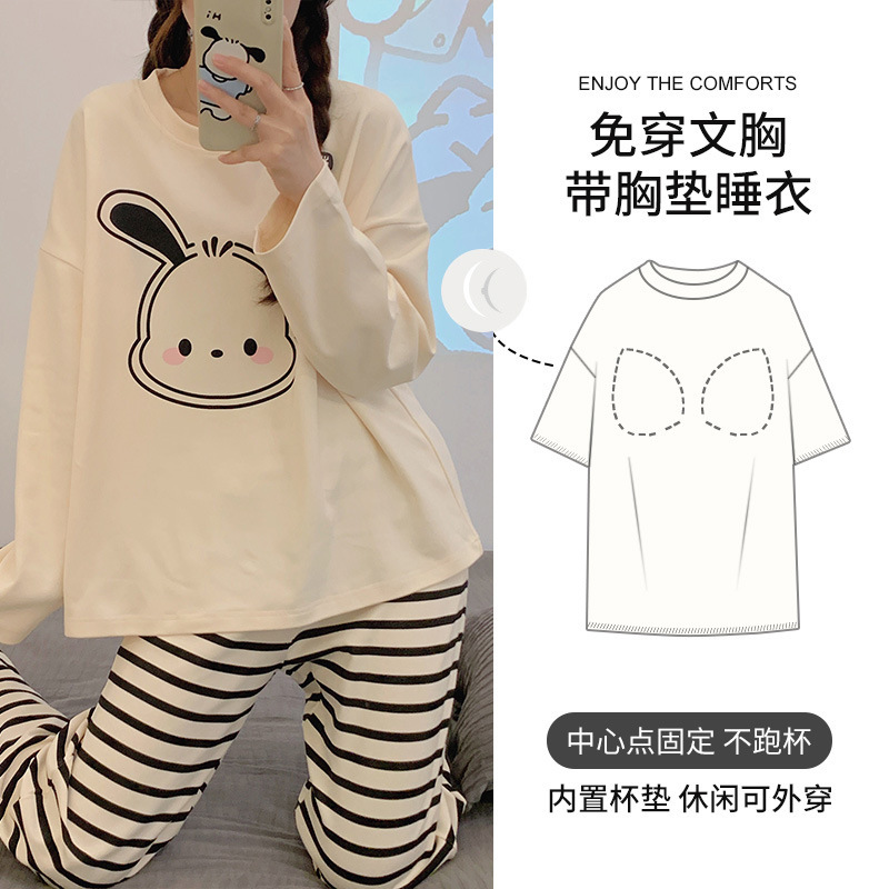 2025新款春秋季天长袖带胸垫一体睡衣女长裤冬款家居服套装可外穿