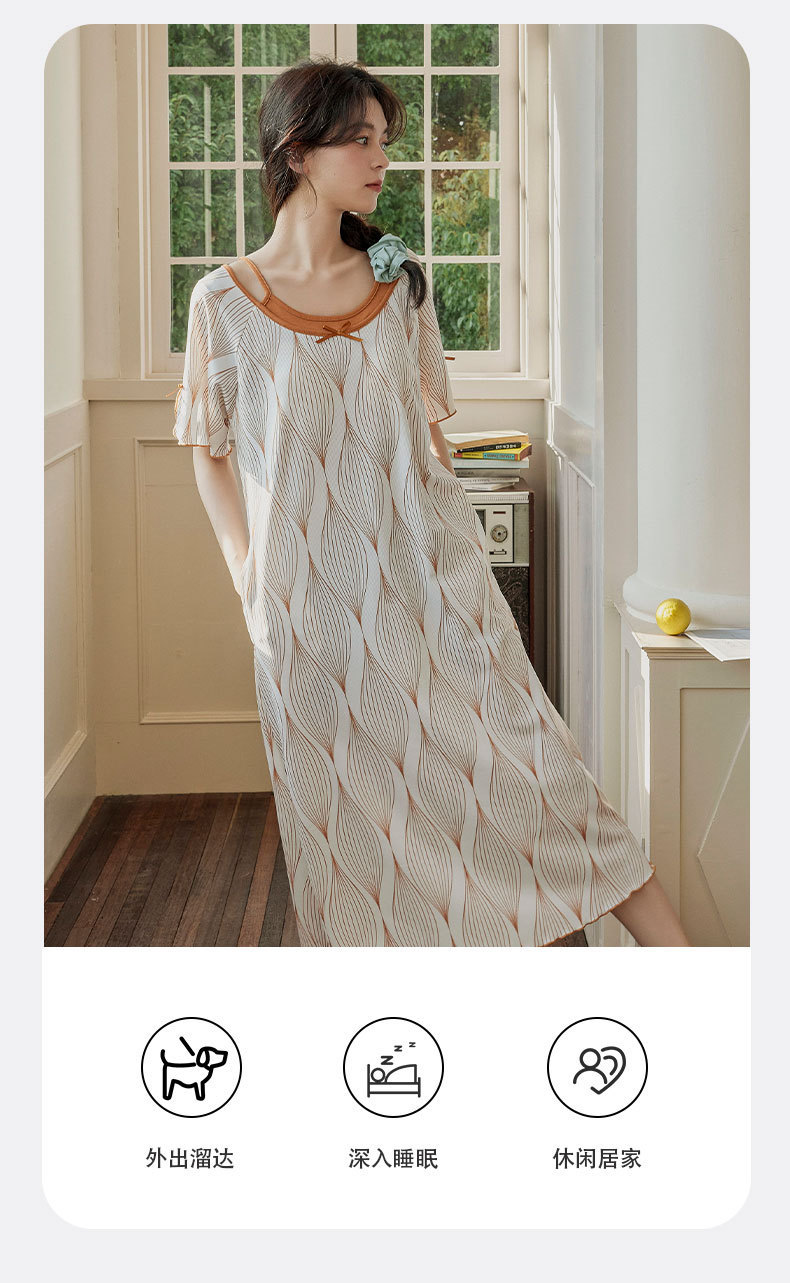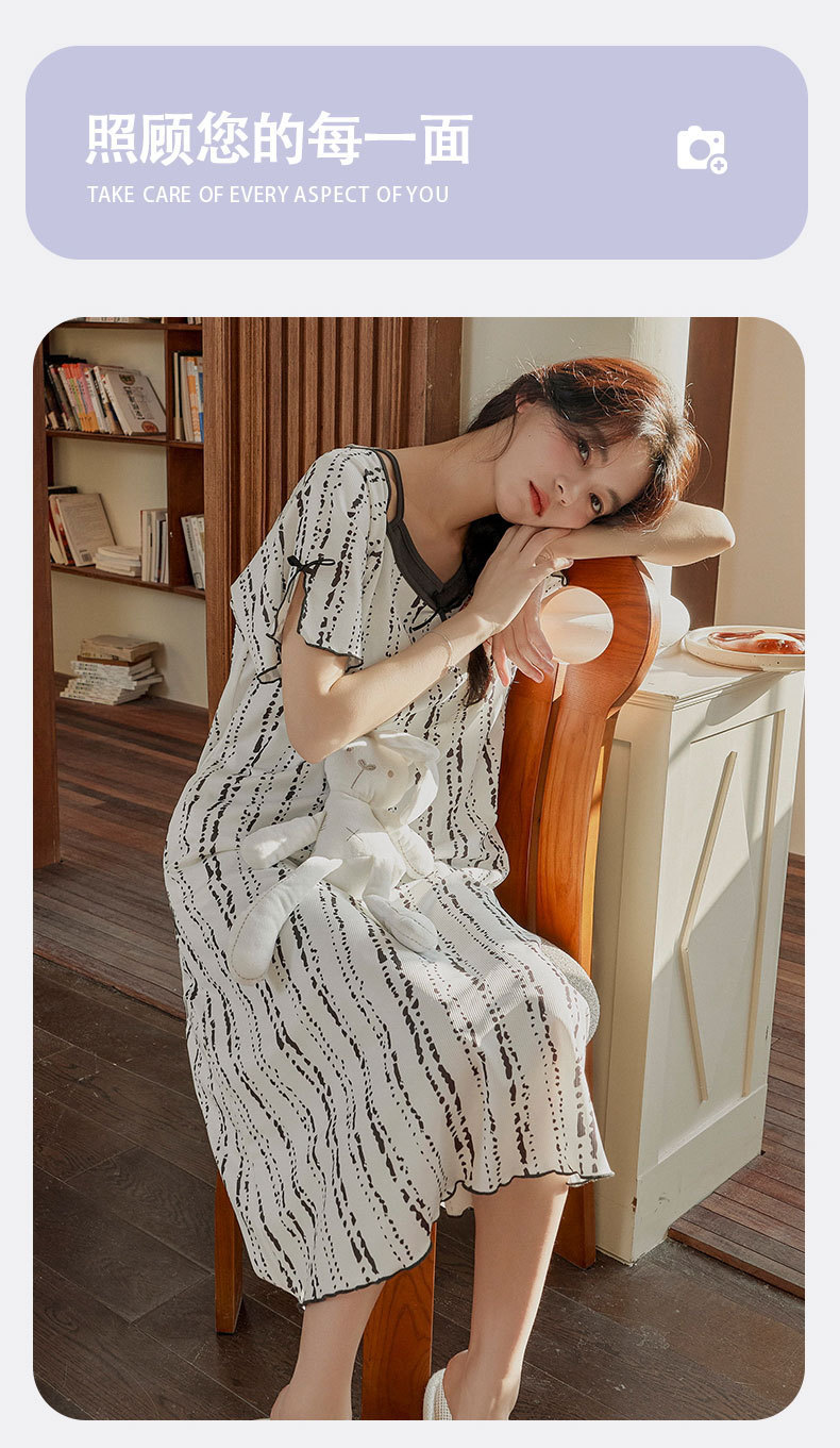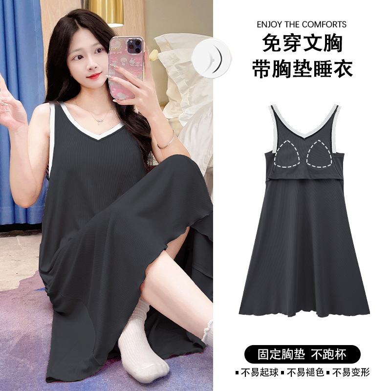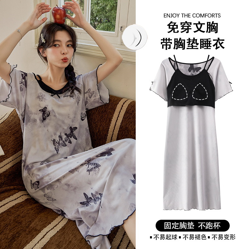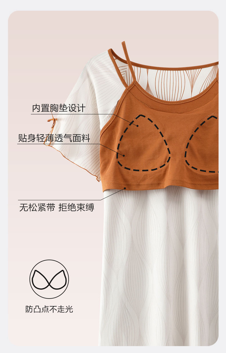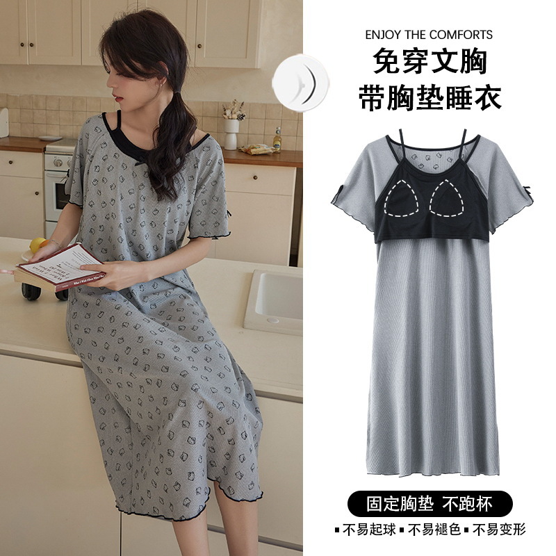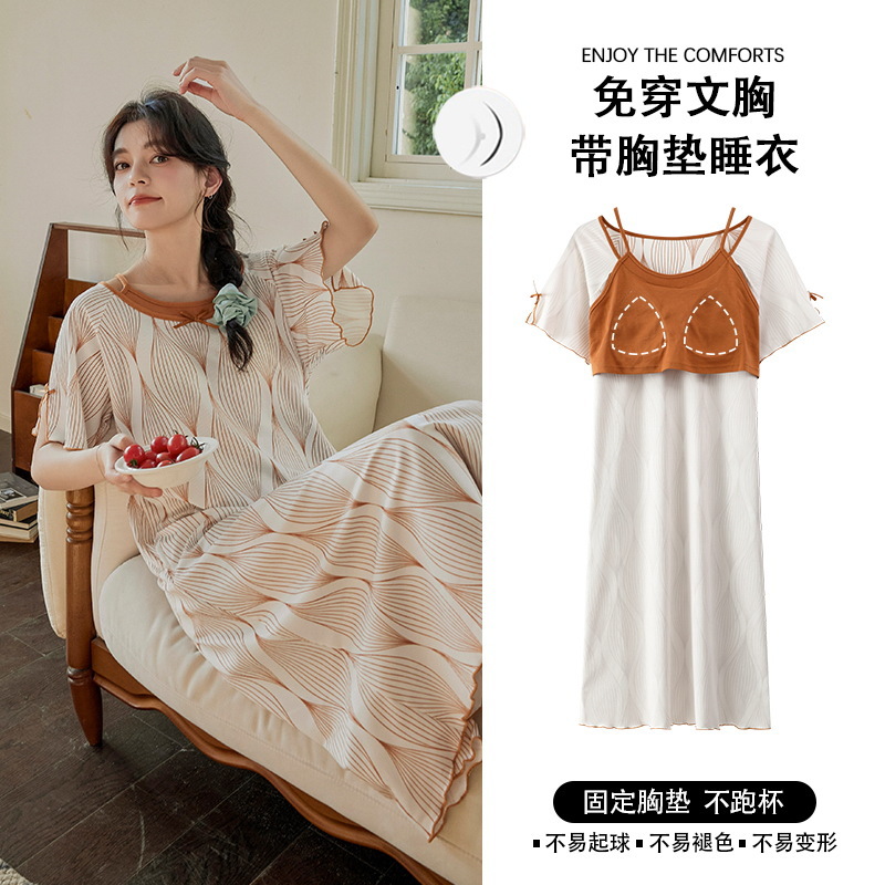 带胸垫睡裙女夏季薄款冰丝螺纹短袖裙甜美长款过膝连衣裙长裙爆款