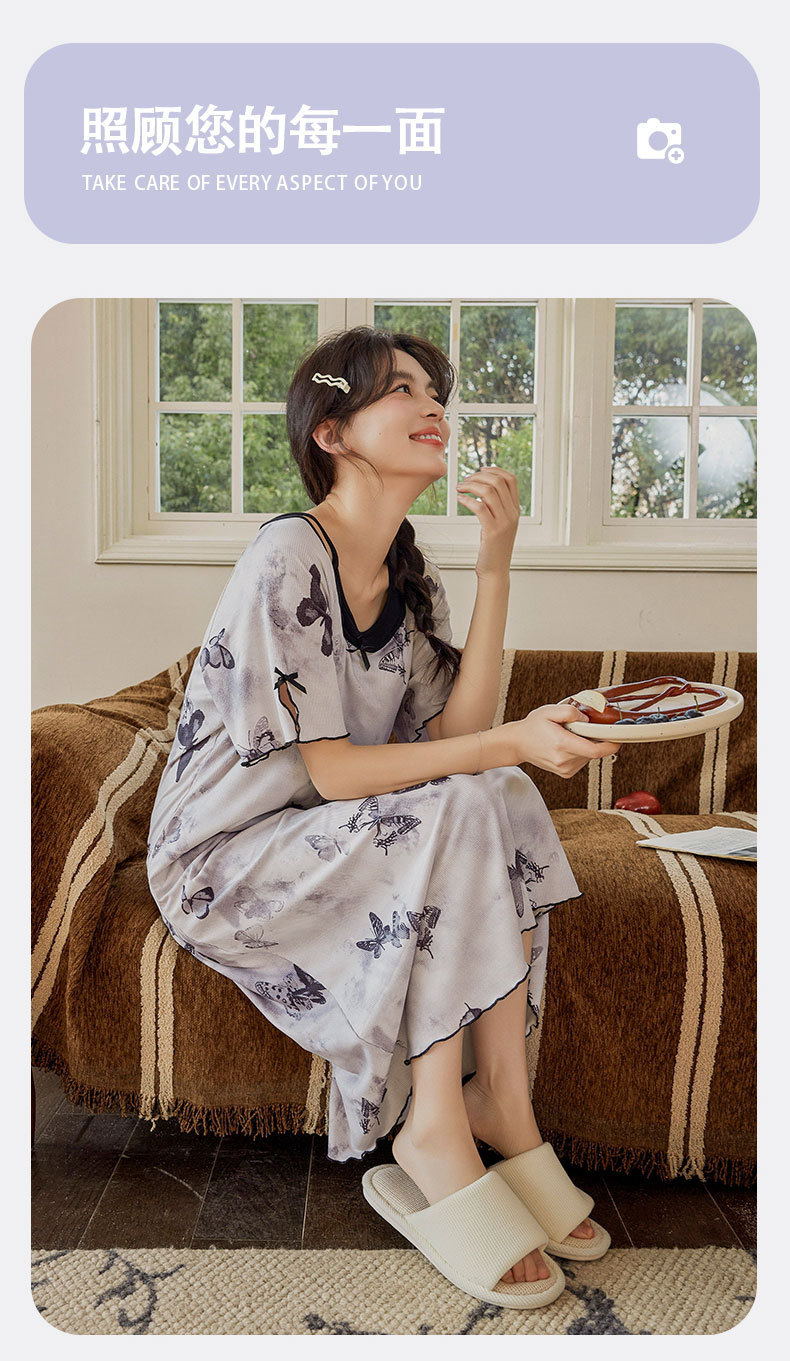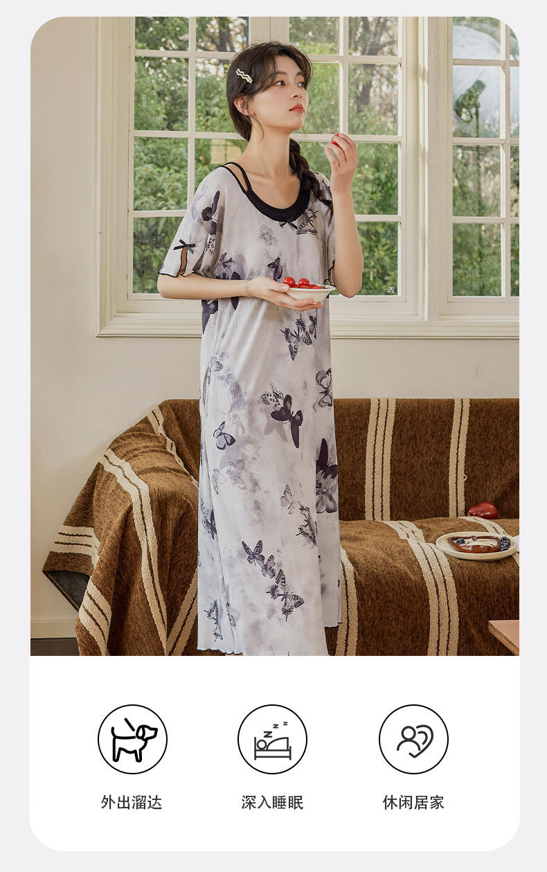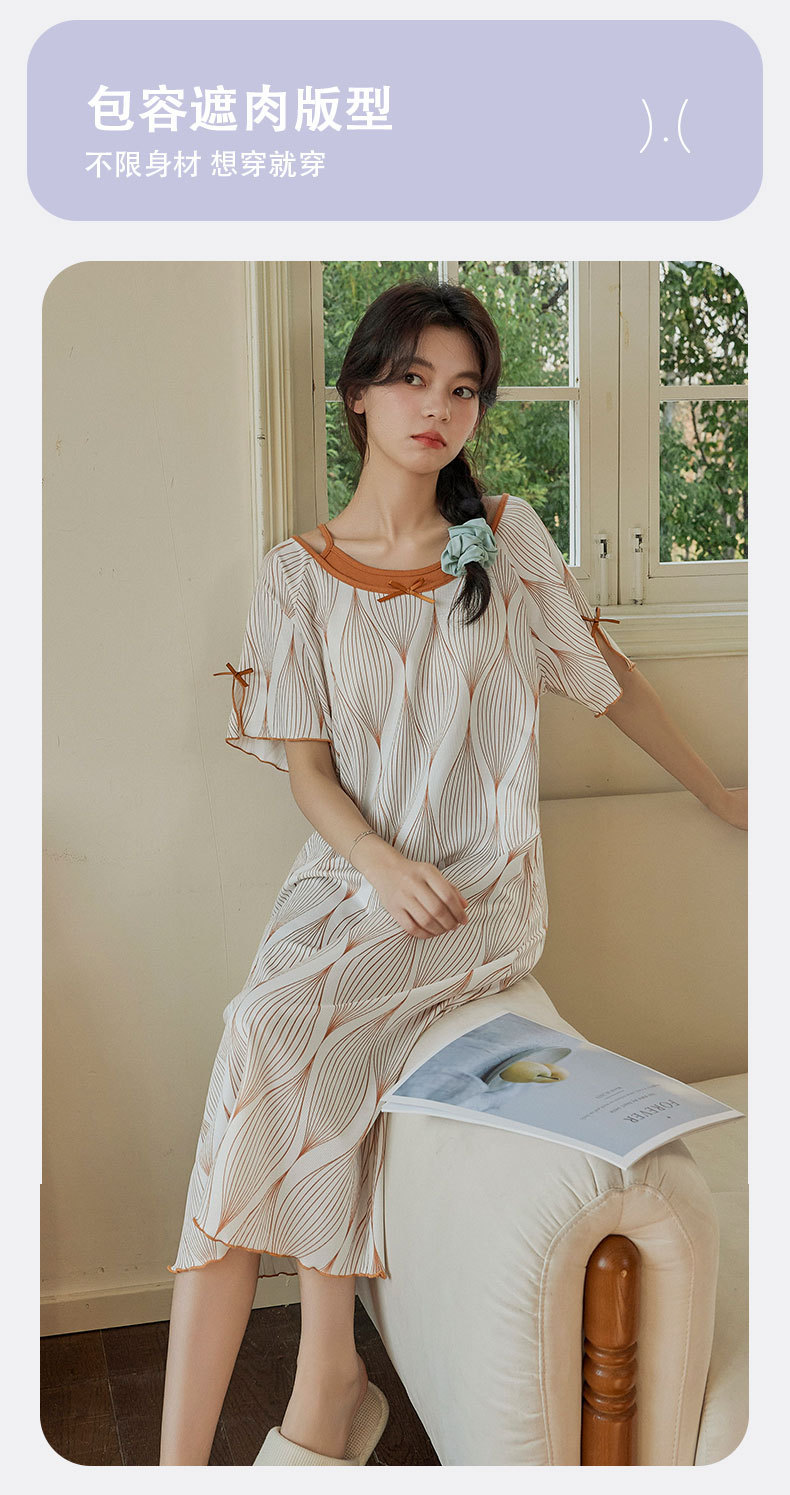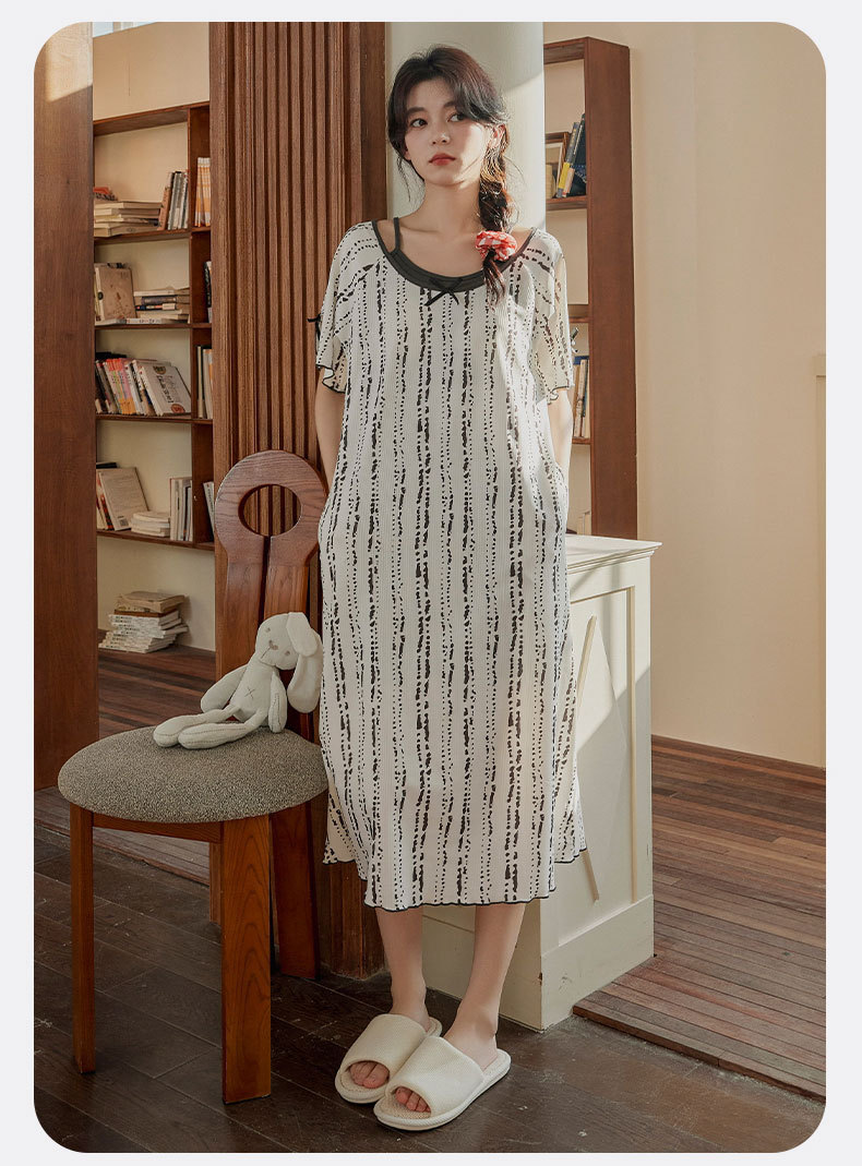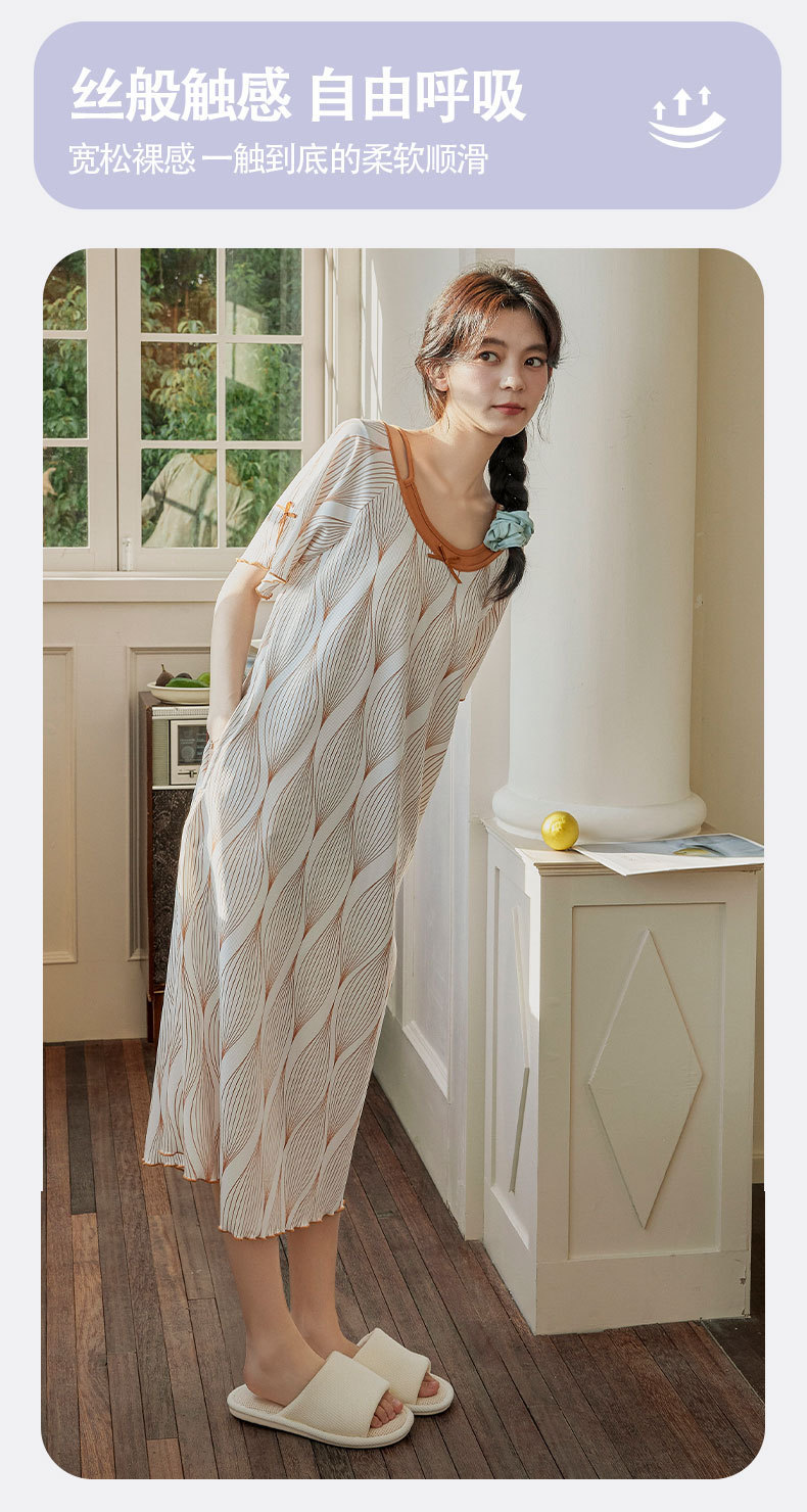 带胸垫睡裙女夏季薄款冰丝螺纹短袖裙甜美长款过膝连衣裙长裙爆款