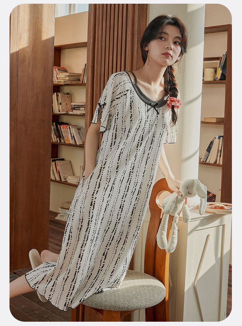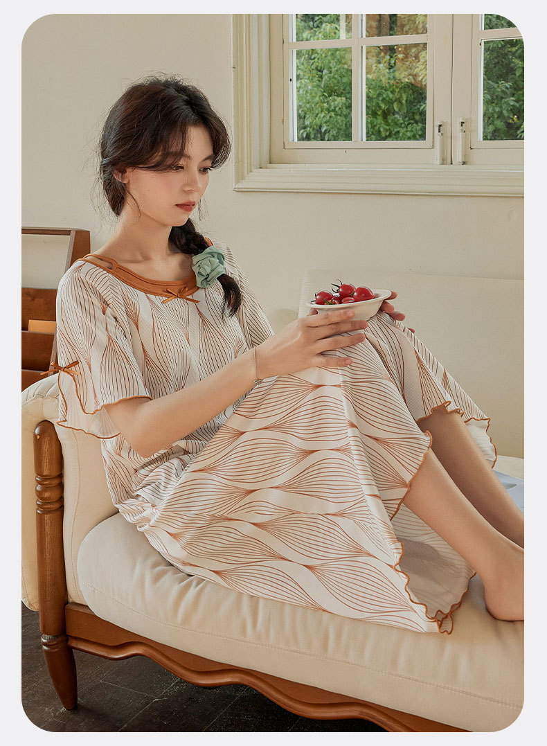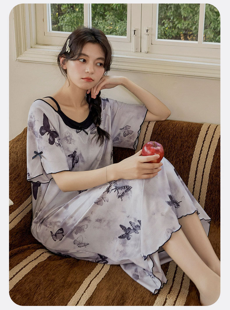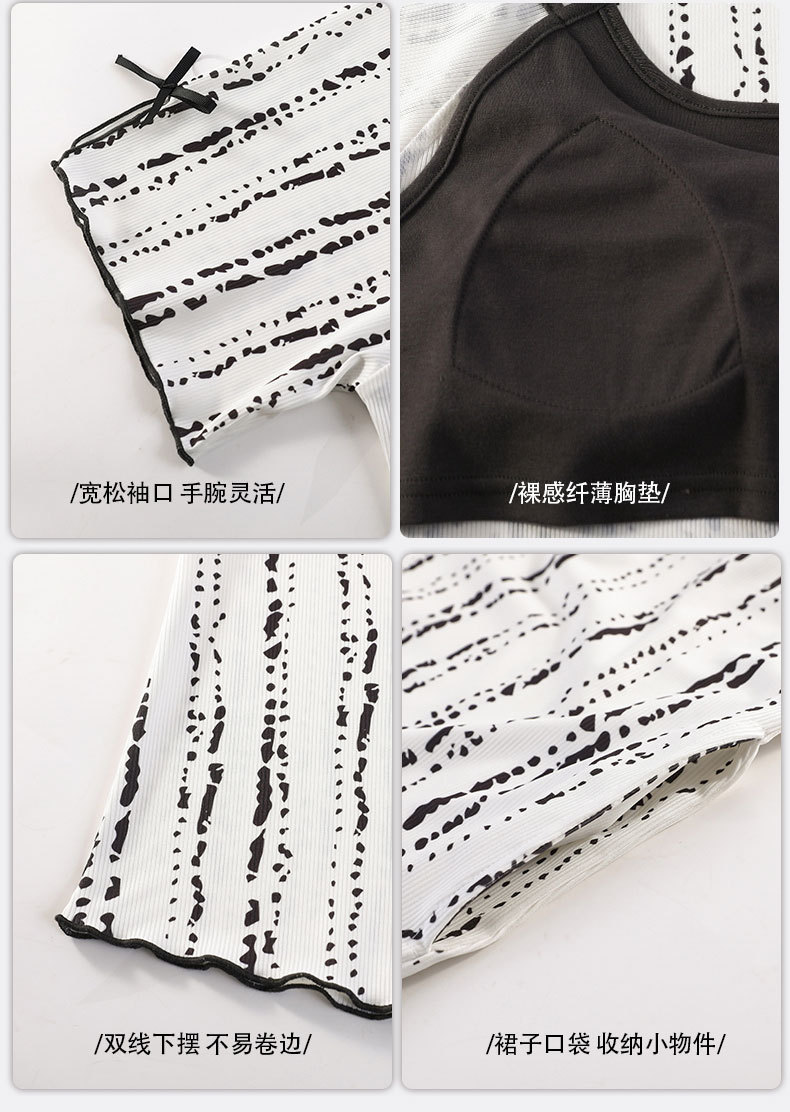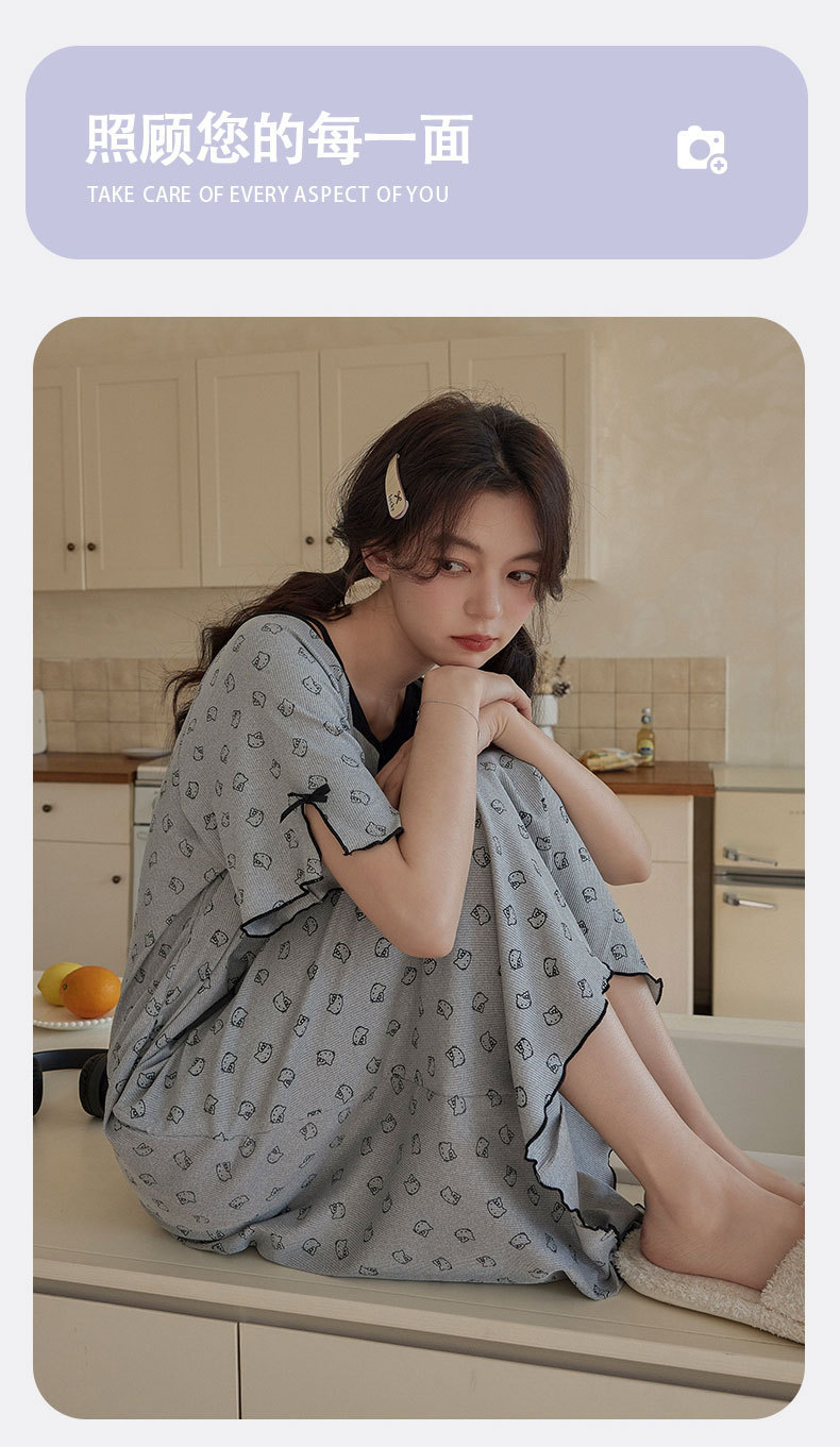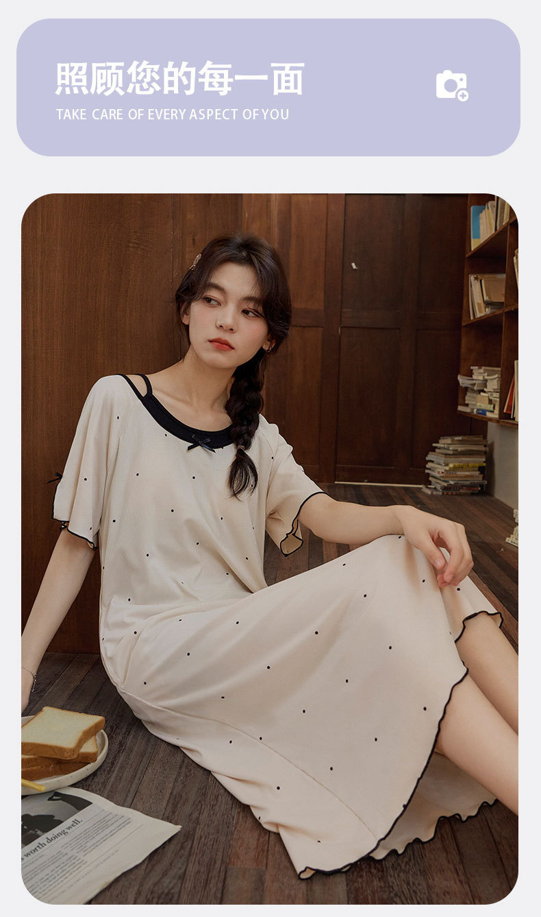 带胸垫睡裙女夏季薄款冰丝螺纹短袖裙甜美长款过膝连衣裙长裙爆款