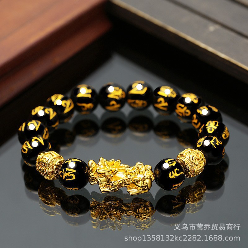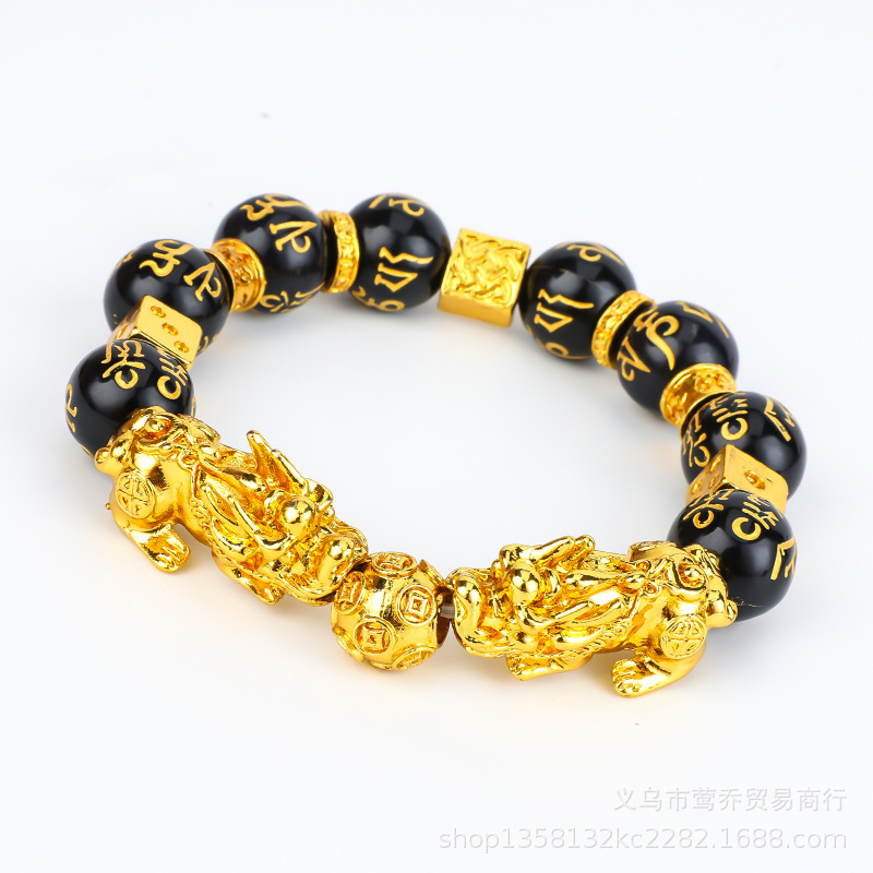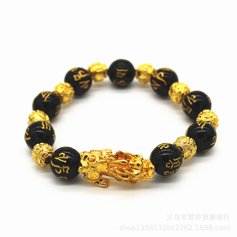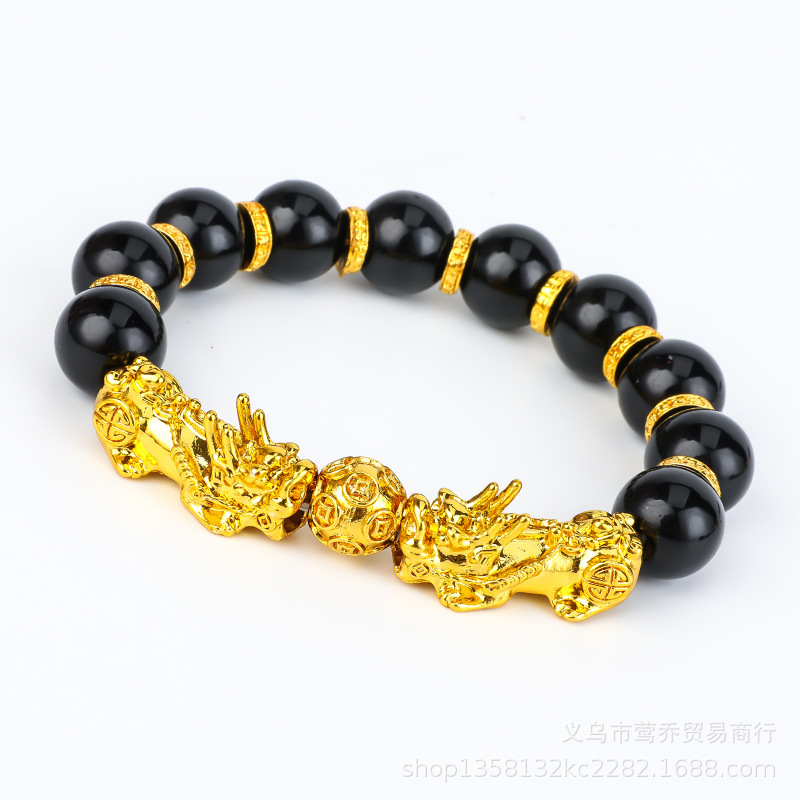 12mm仿黑曜石沙金貔貅直播热销代发跨境货源路路通镀金手串小礼品
