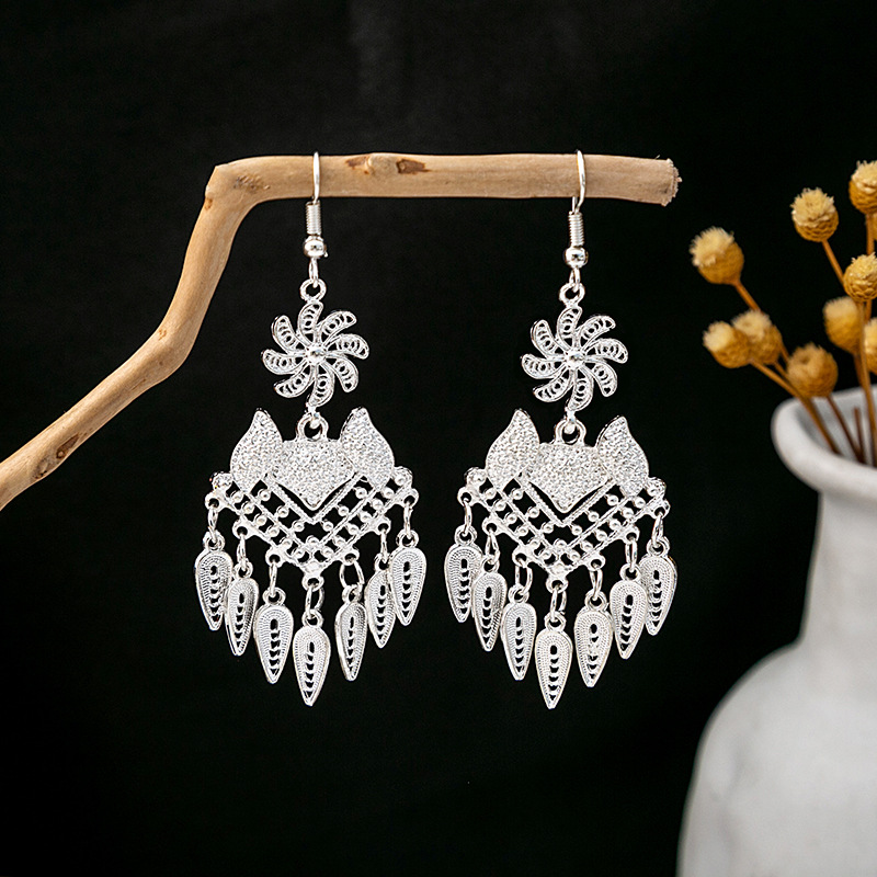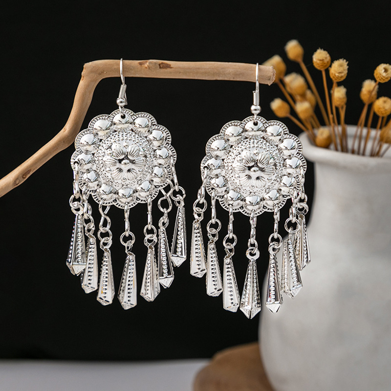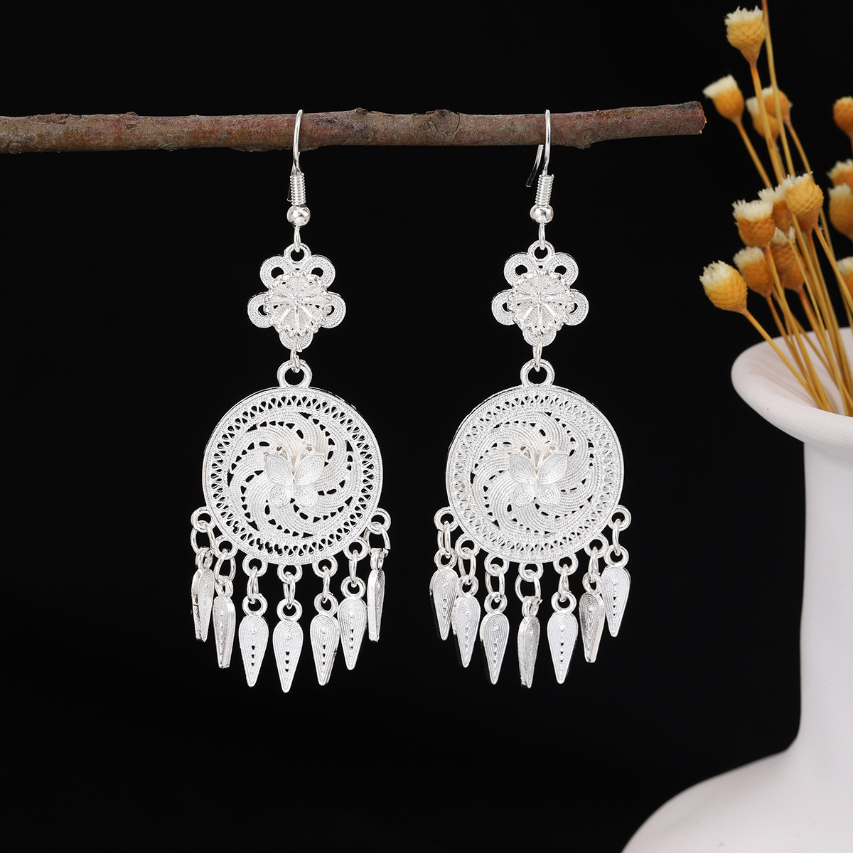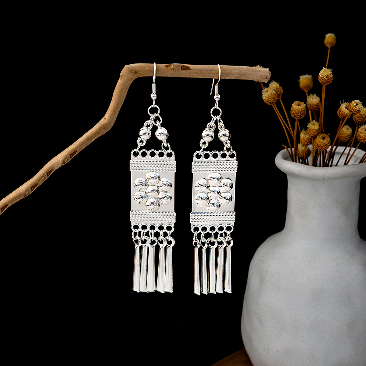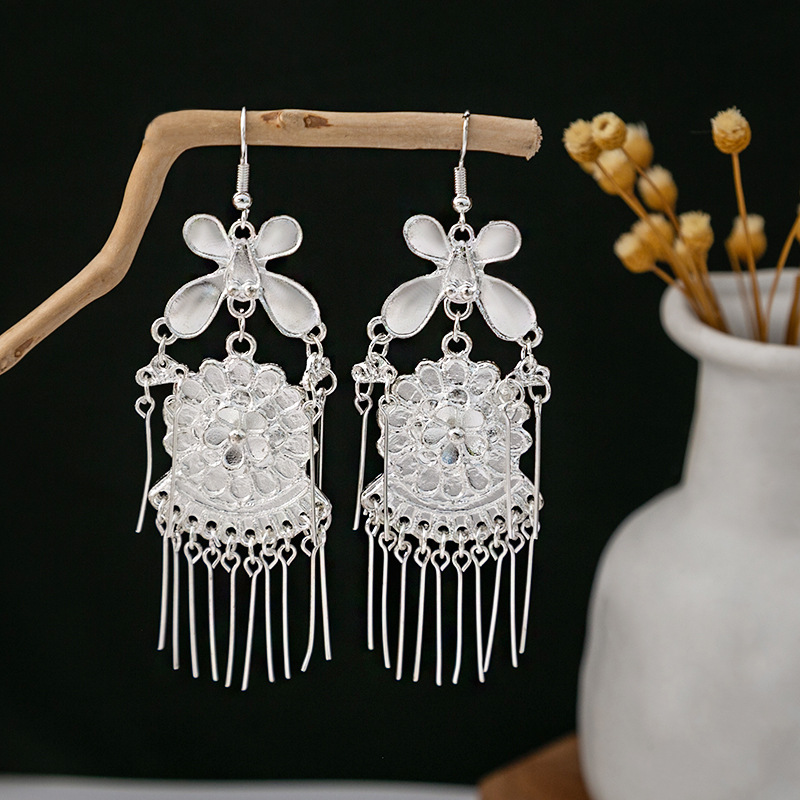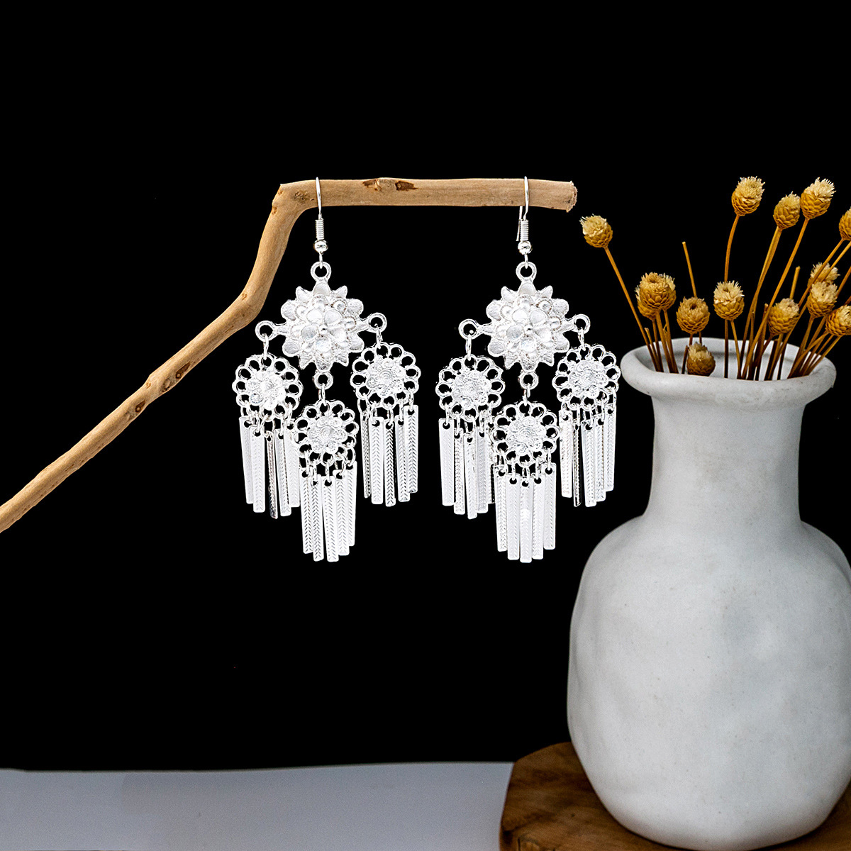 复古苗银少数民族风耳环 个性波西米亚风花朵耳坠长款流苏耳饰