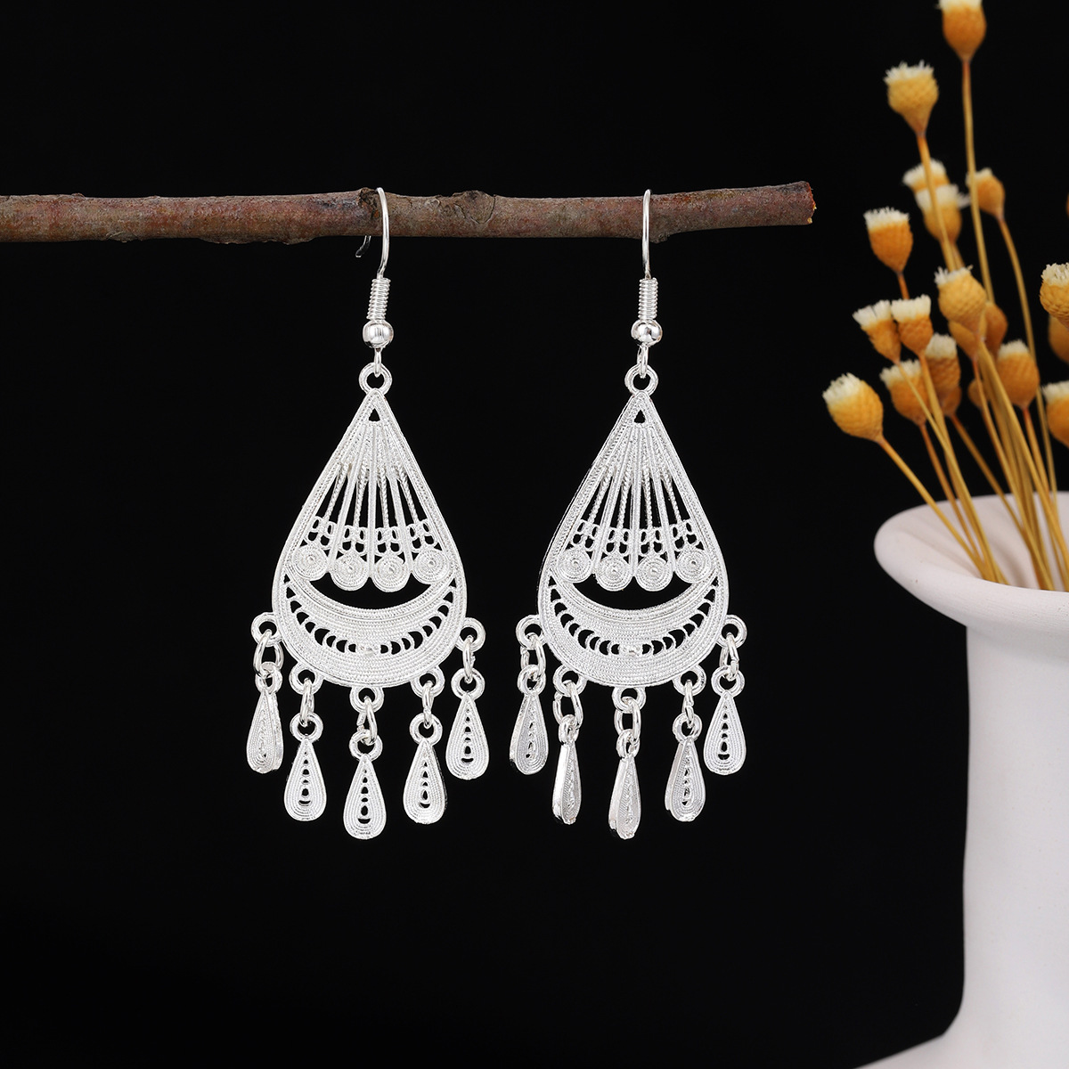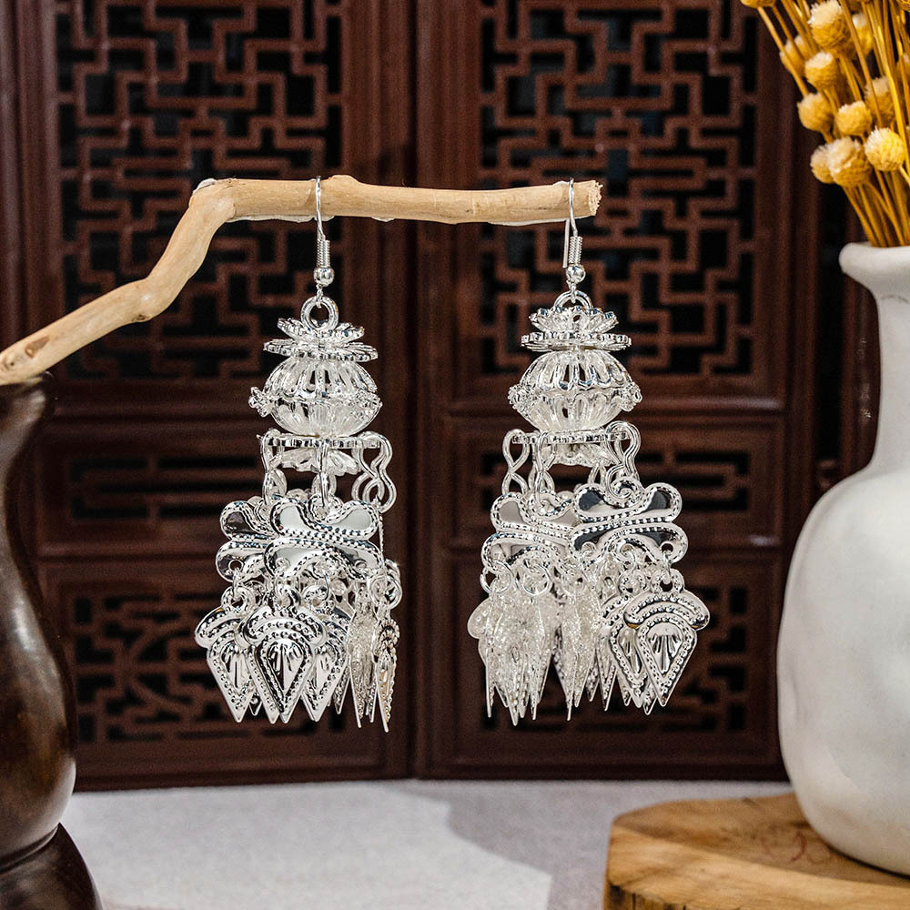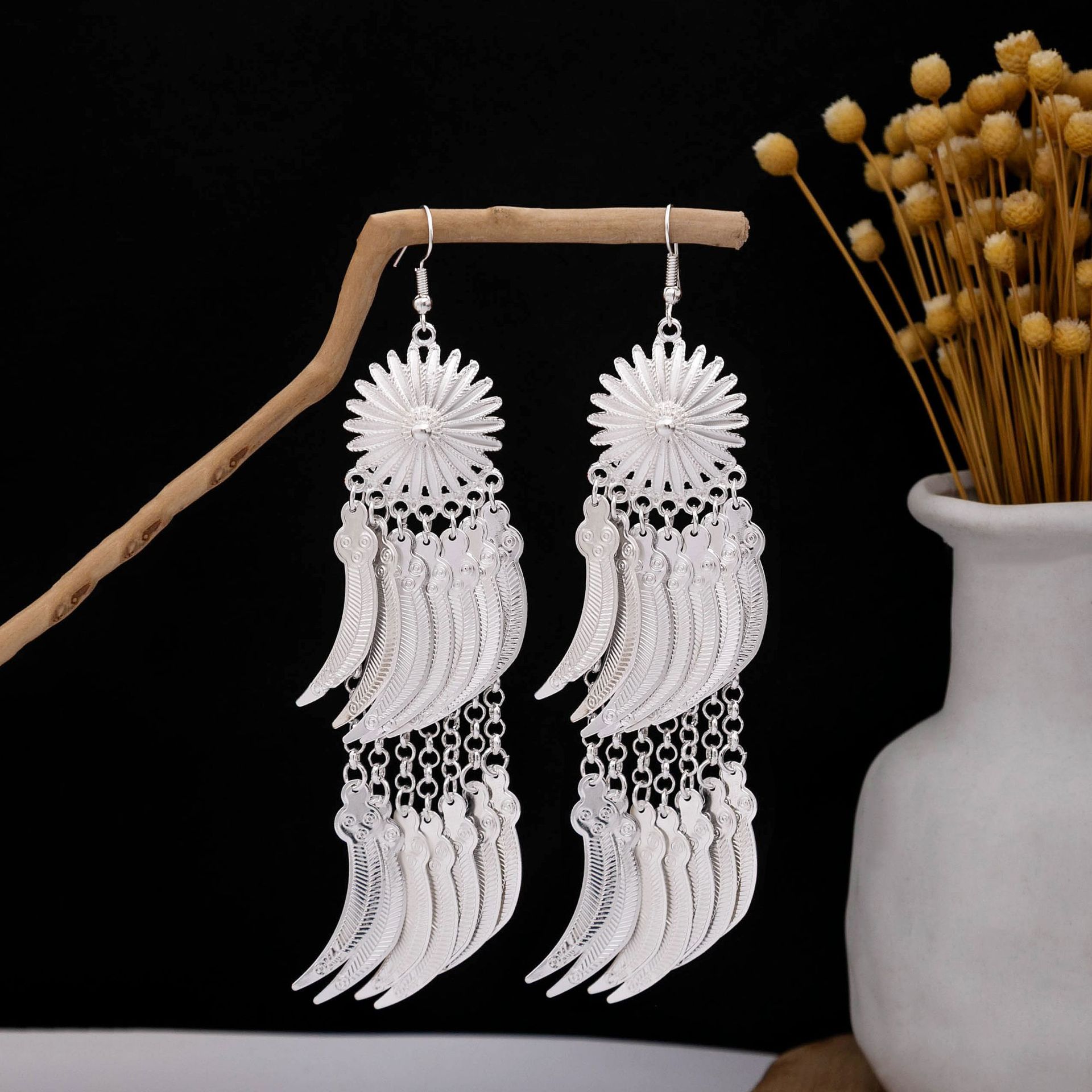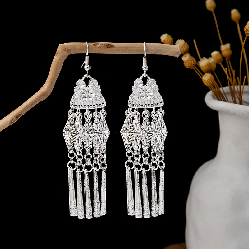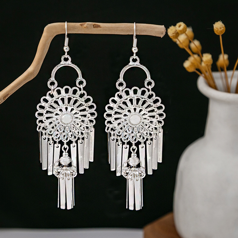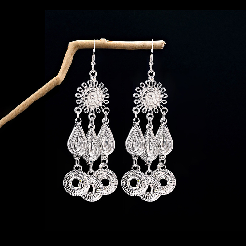 复古苗银少数民族风耳环 个性波西米亚风花朵耳坠长款流苏耳饰