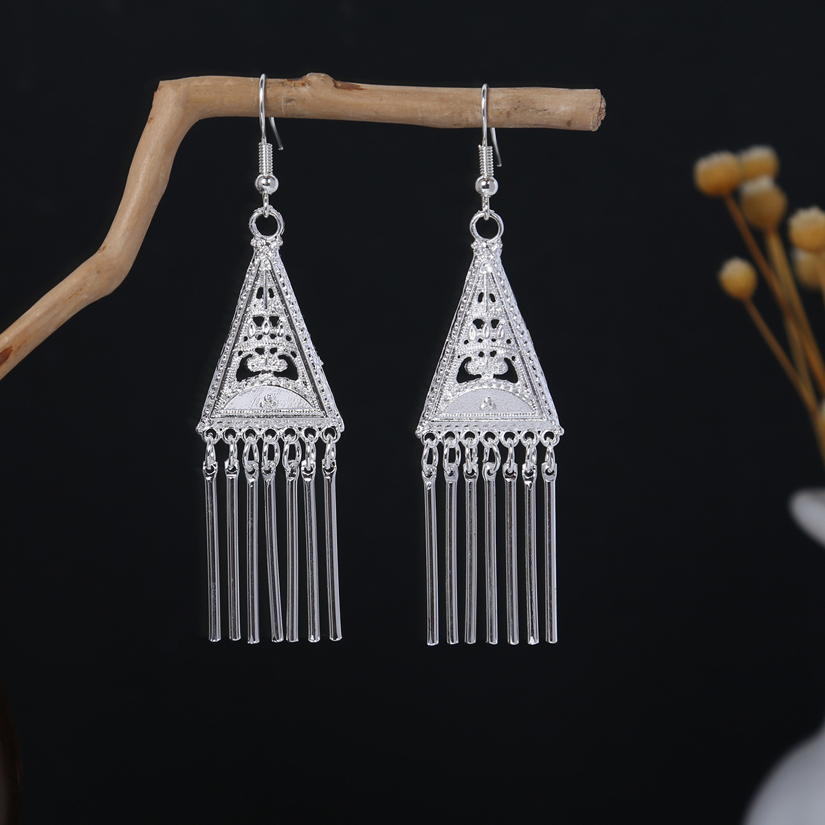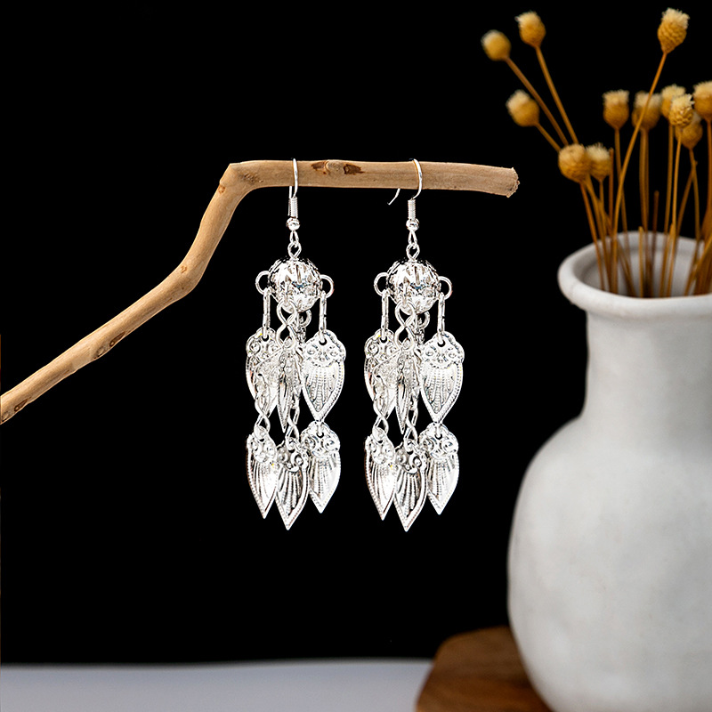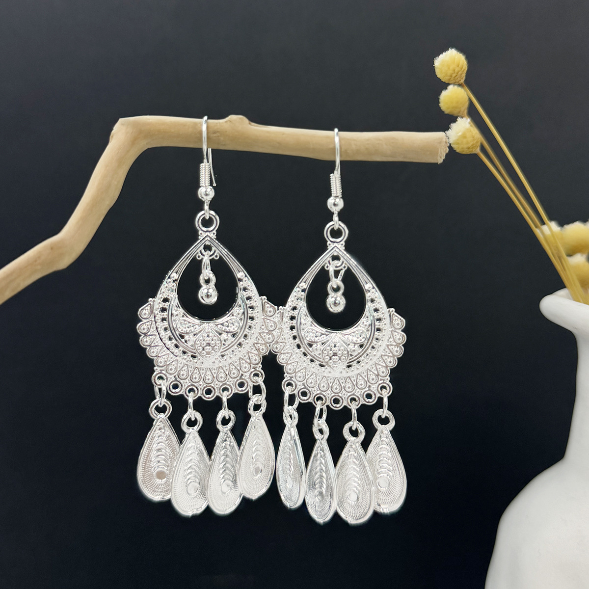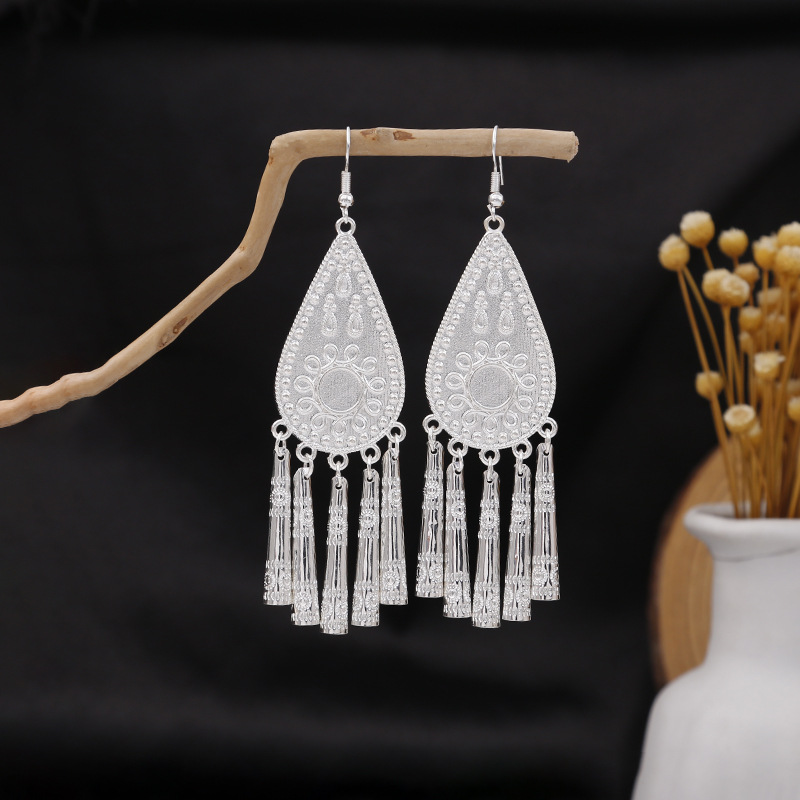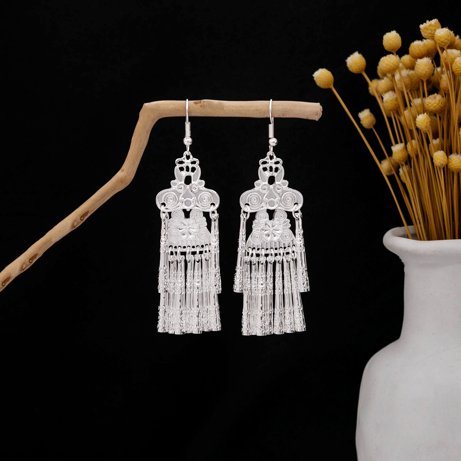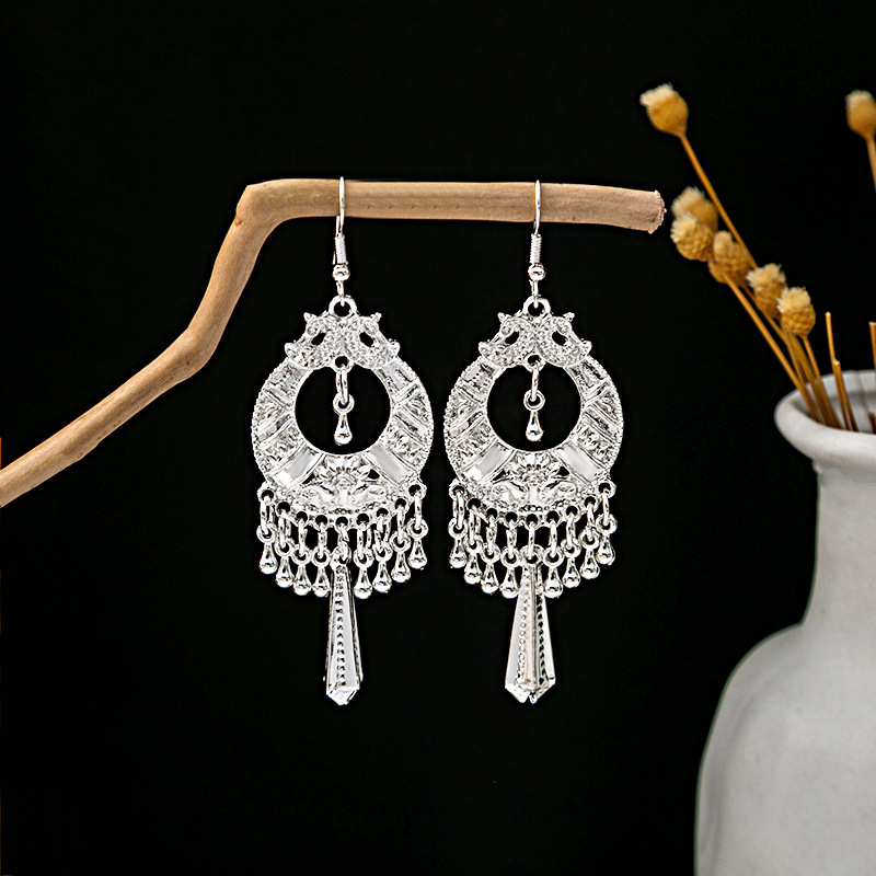 复古苗银少数民族风耳环 个性波西米亚风花朵耳坠长款流苏耳饰
