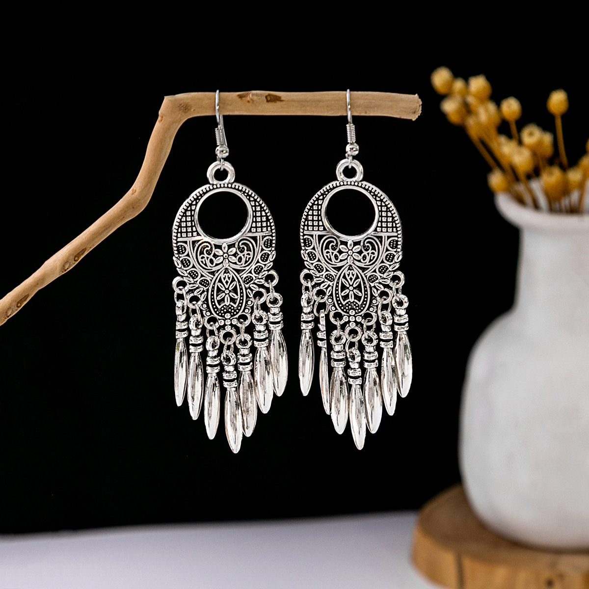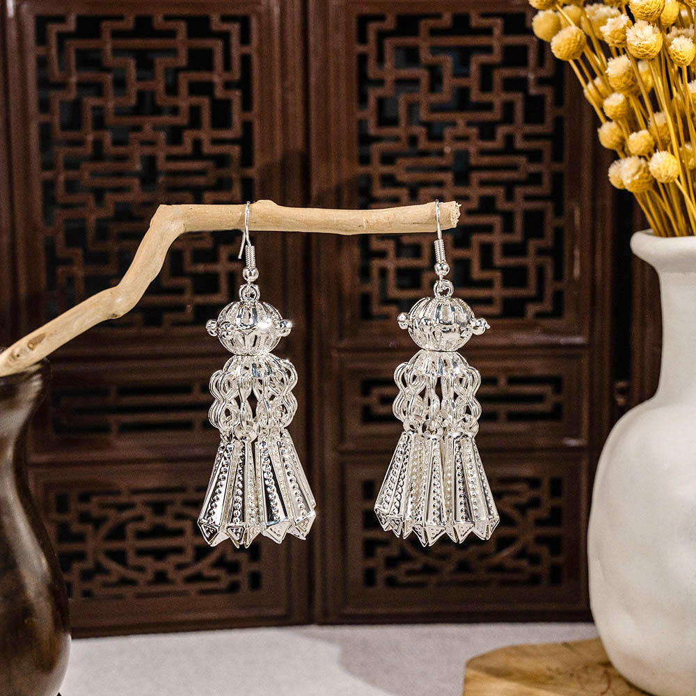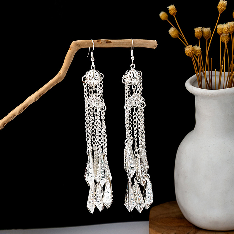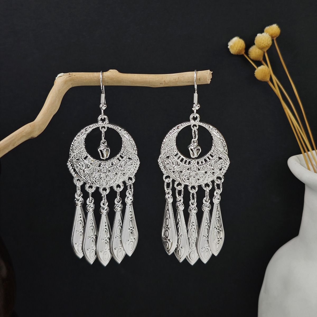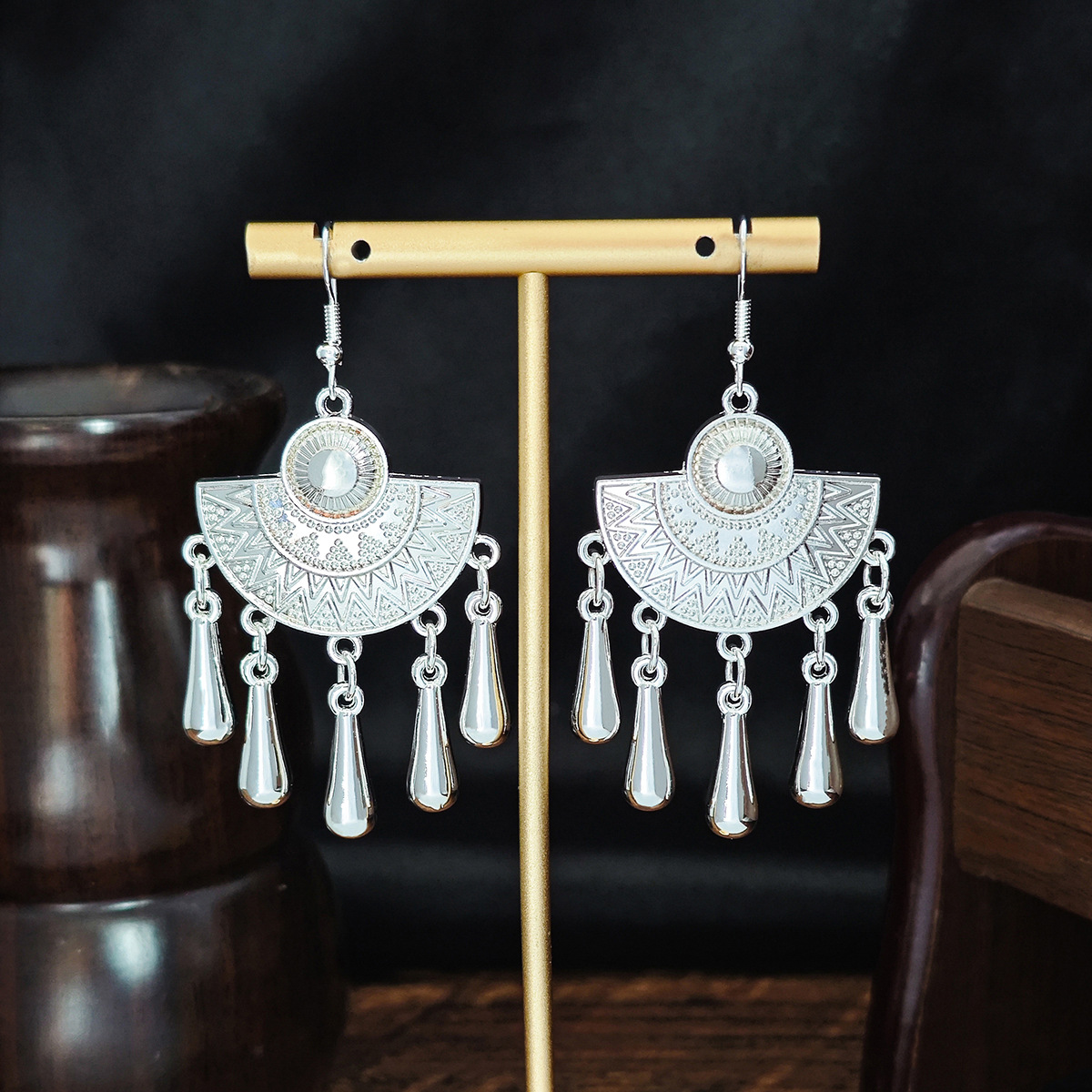 复古苗银少数民族风耳环 个性波西米亚风花朵耳坠长款流苏耳饰