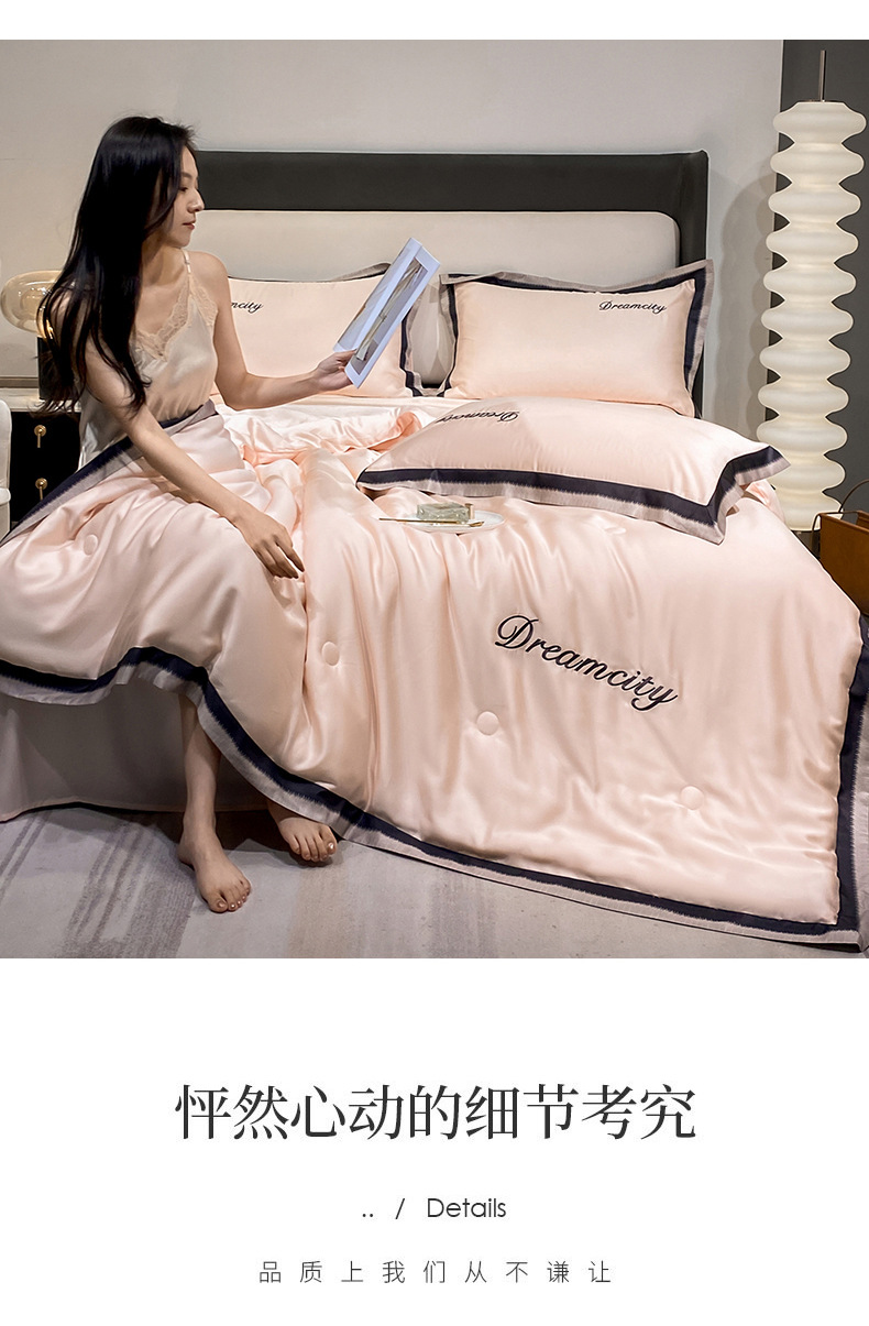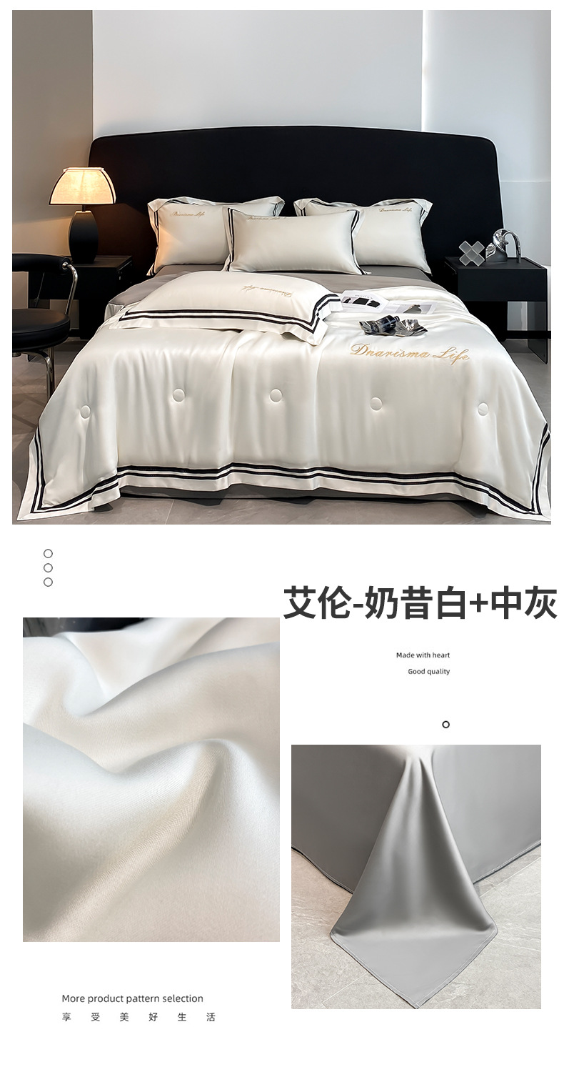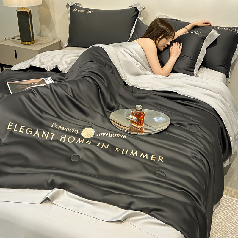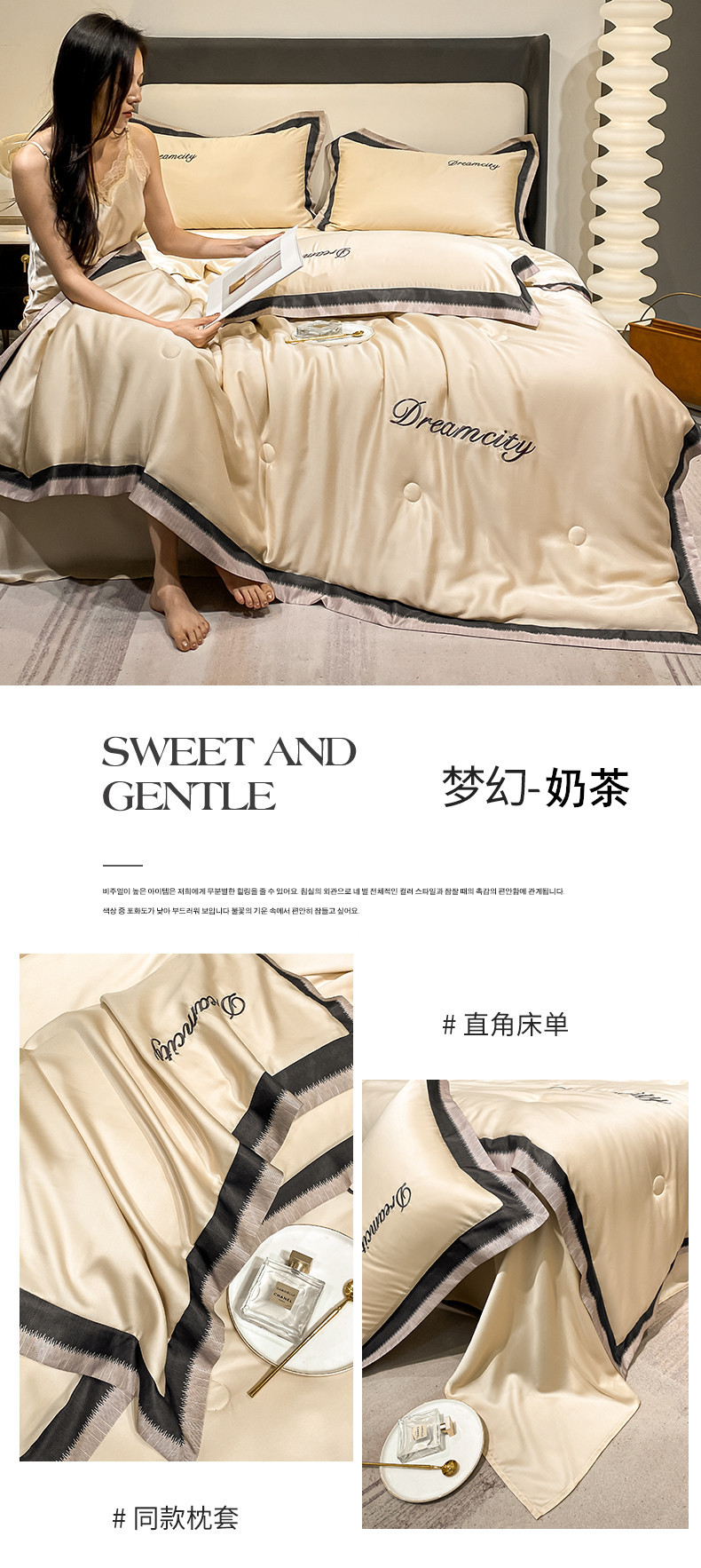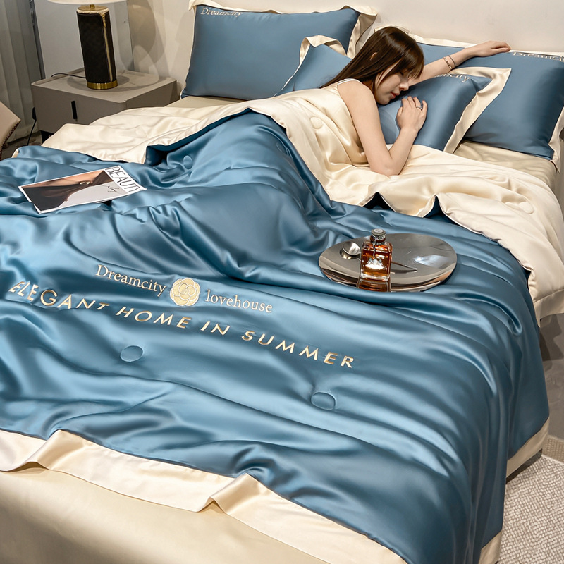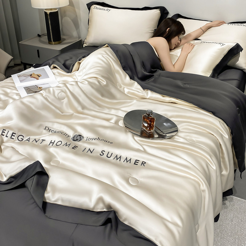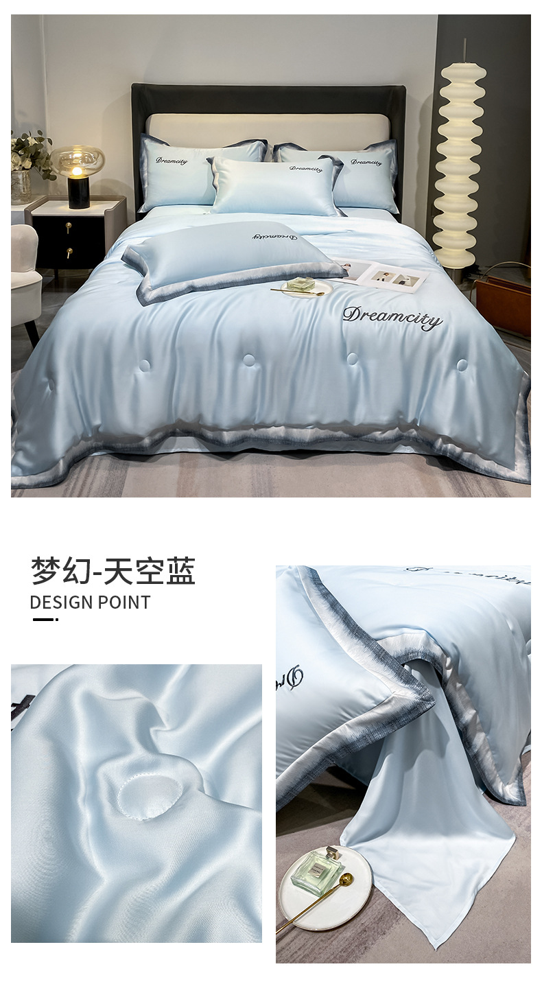 爆款轻奢数码宽边冰丝刺绣夏被可机洗丝滑裸睡夏被四件套礼品批发