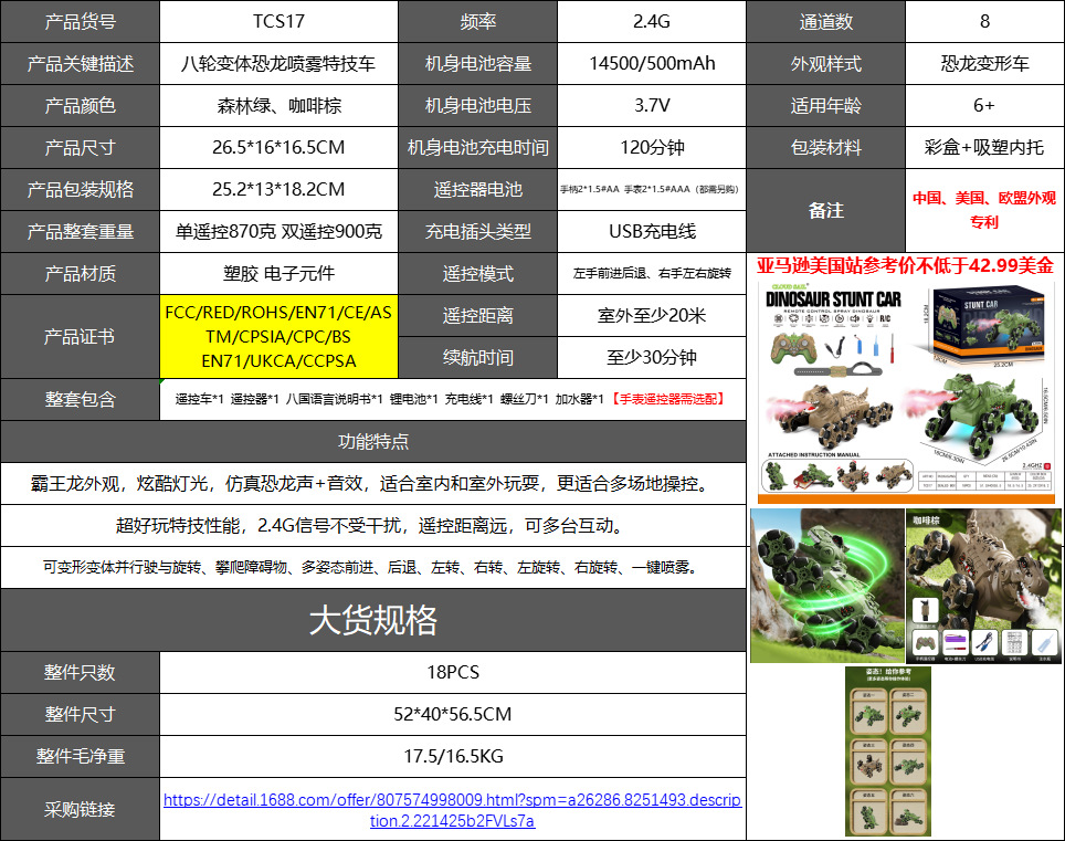 跨境恐龙遥控车八轮变体喷雾变形特技车四驱攀爬手势感应玩具车