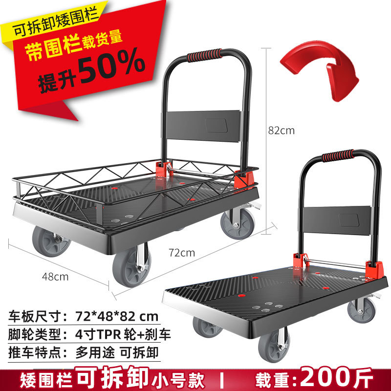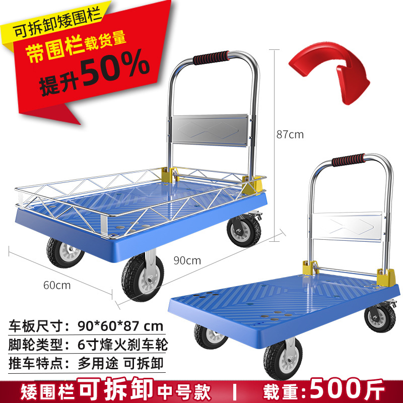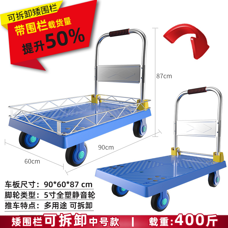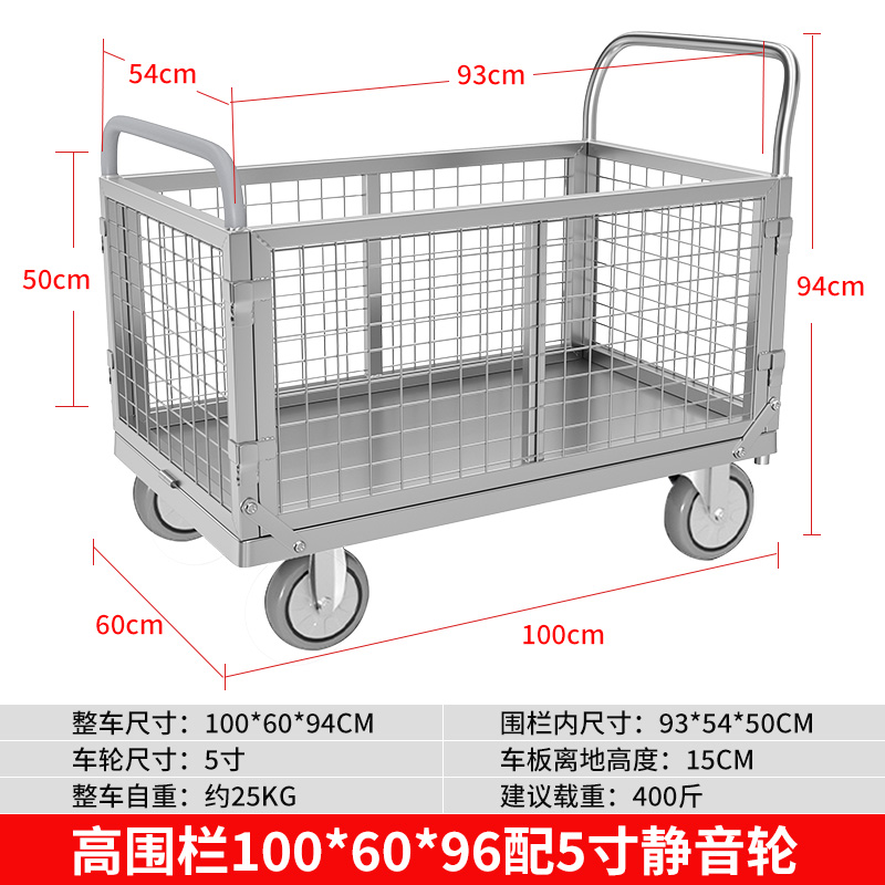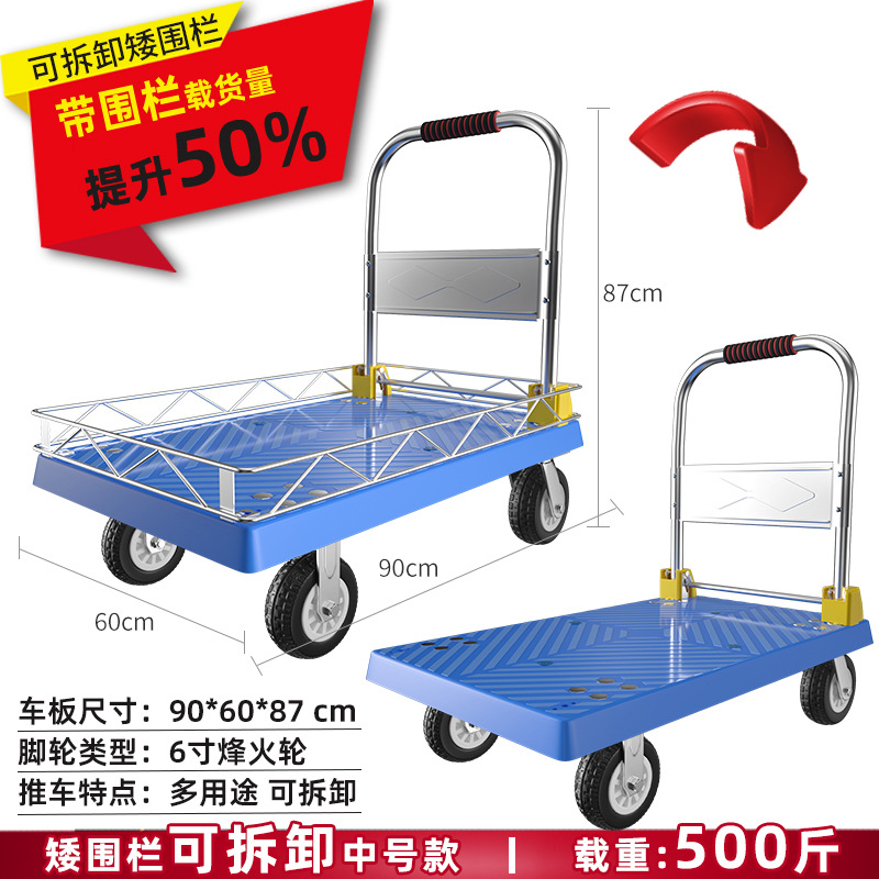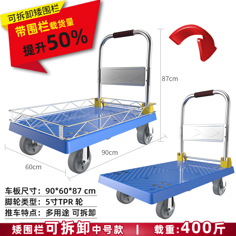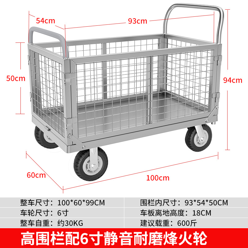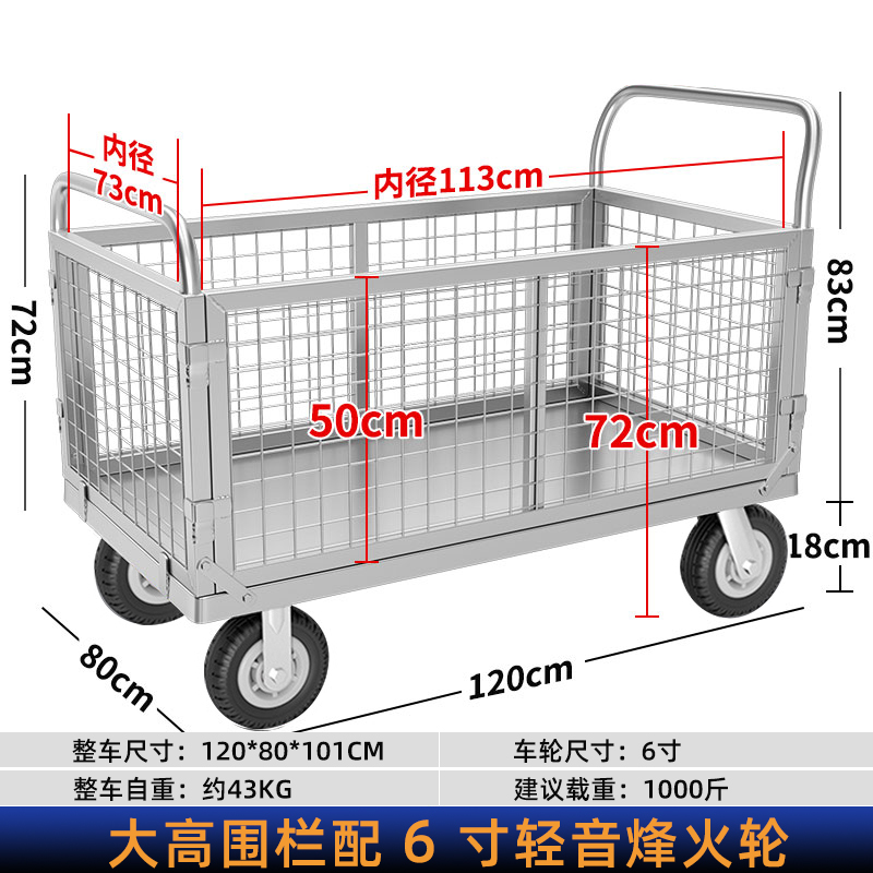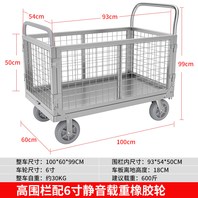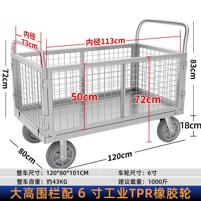 拉货小推车带护栏平板车家用搬运车带围栏手推车取快递可折叠拖车