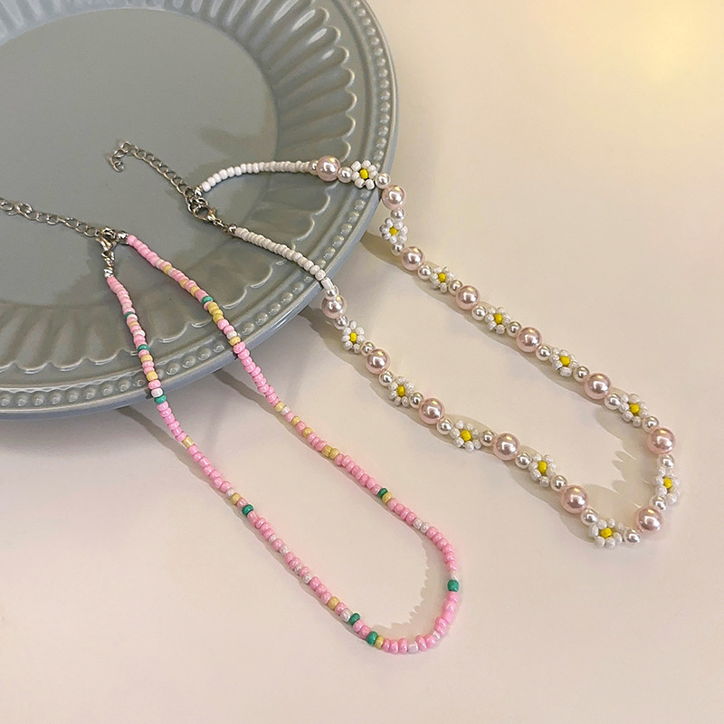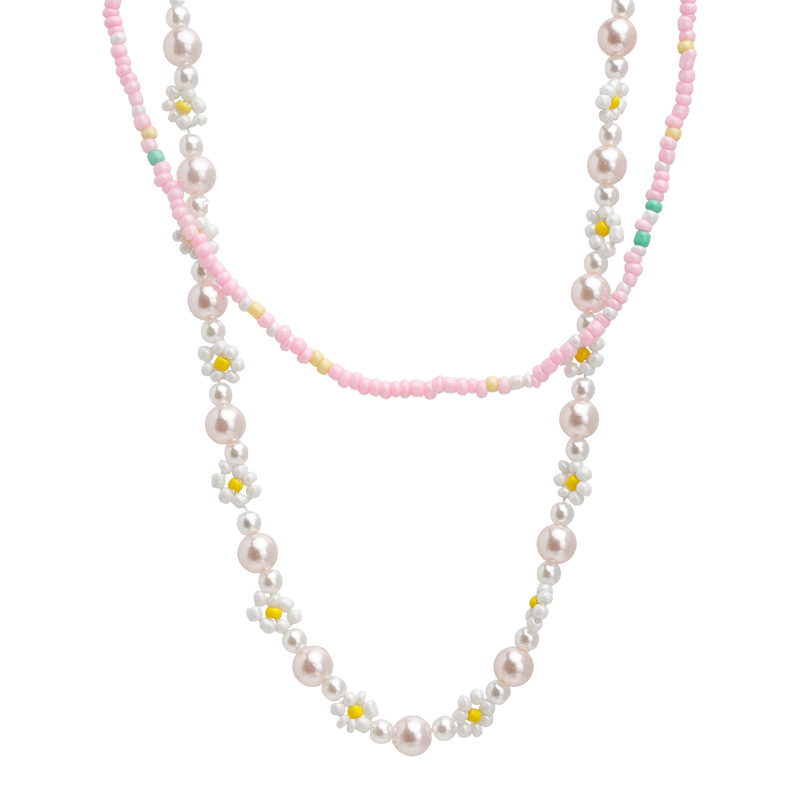 粉色珍珠花朵项链2件套 清新夏日新款锁骨链甜美可爱少女项饰批发