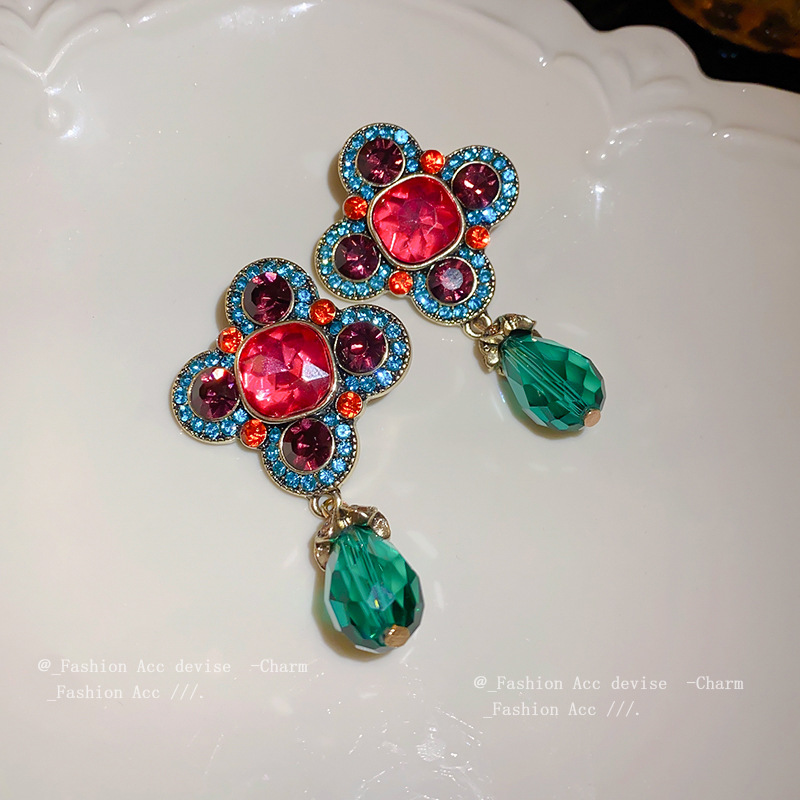 中古银针镶钻花朵水滴耳环复古轻奢宫廷风耳钉时尚百搭耳饰批发女
