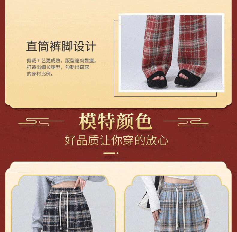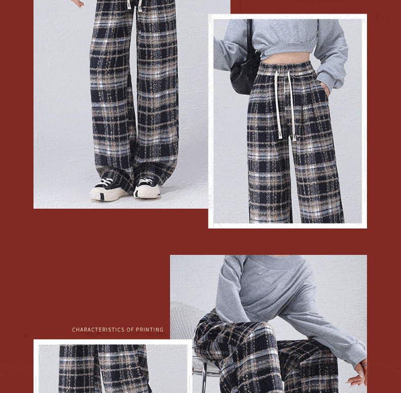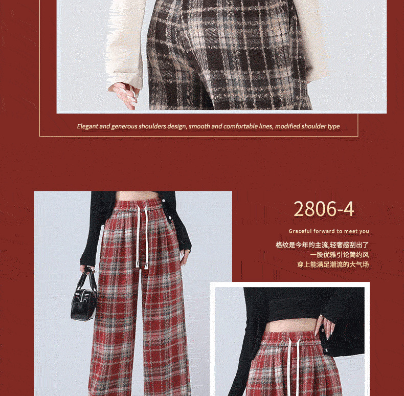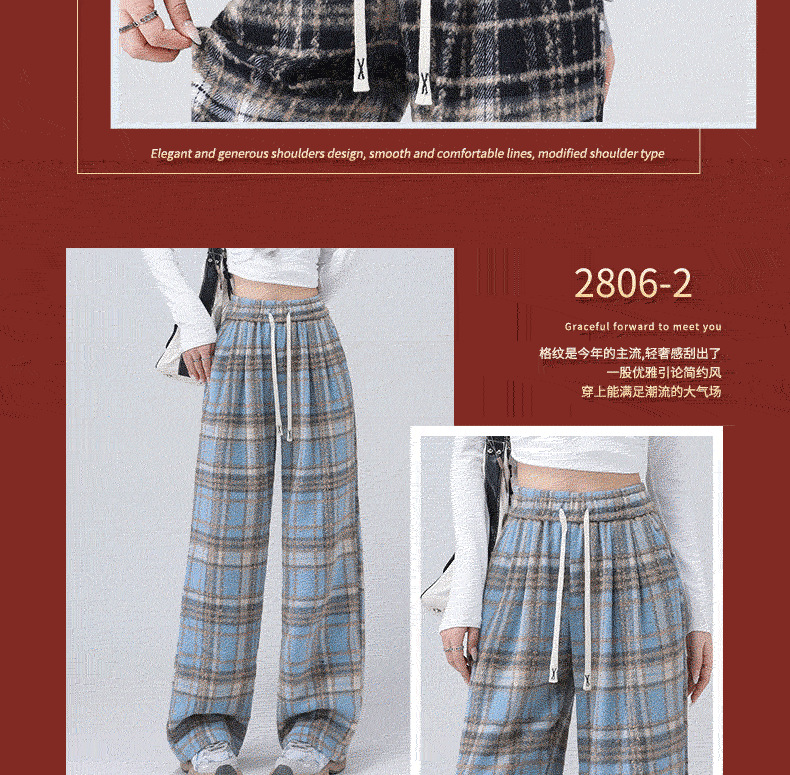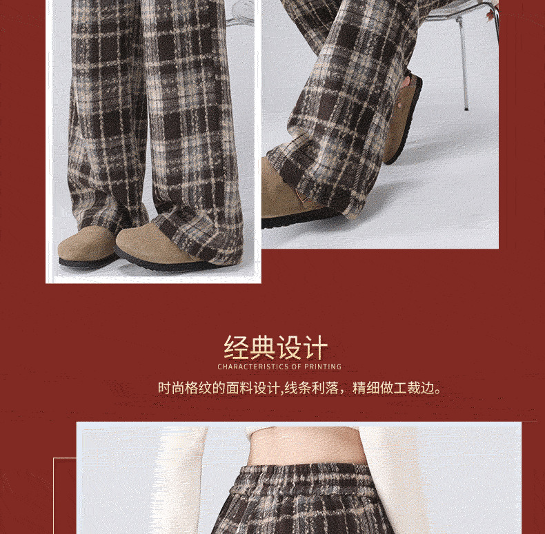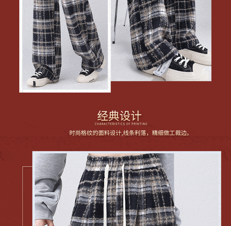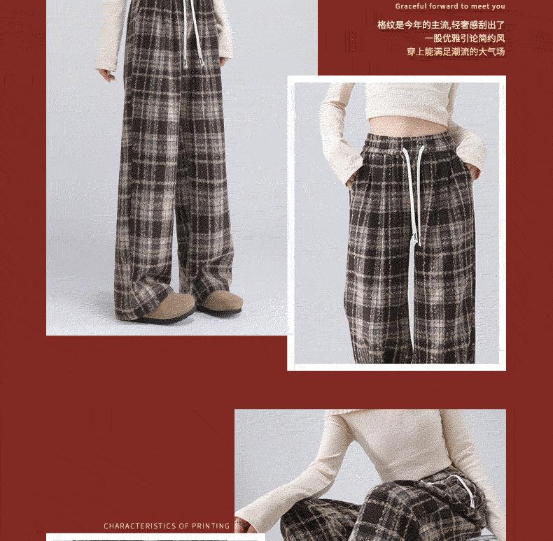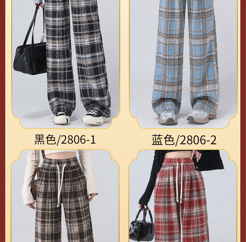新品毛呢格子阔腿裤春秋时尚百搭显高显瘦直筒高腰休闲潮流阔腿裤