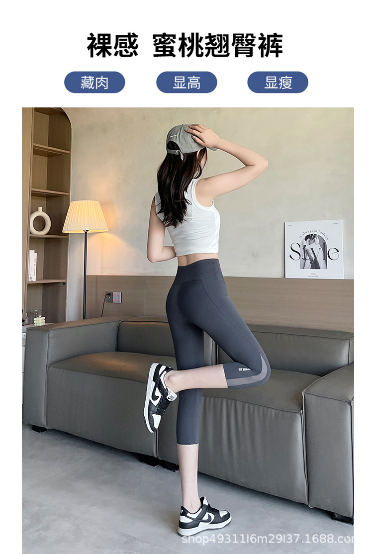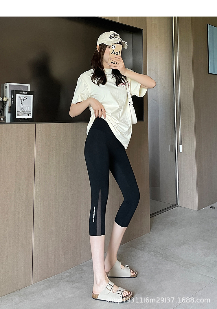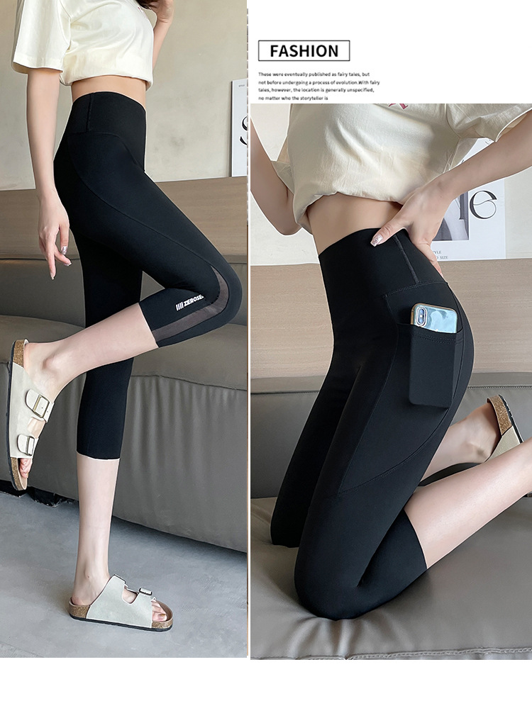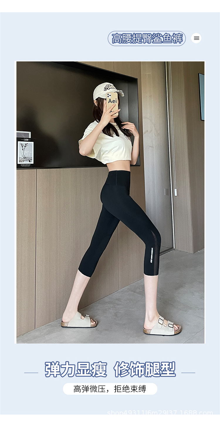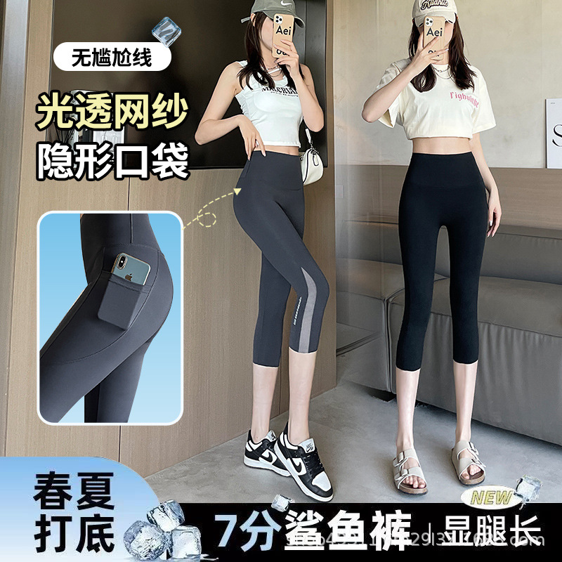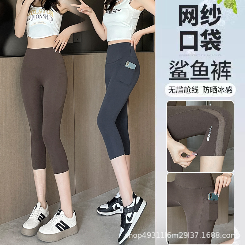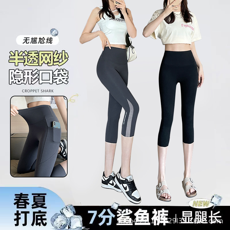 口袋七分鲨鱼裤女外穿夏季薄款收腹提臀瑜伽芭比裤高腰网纱打底裤