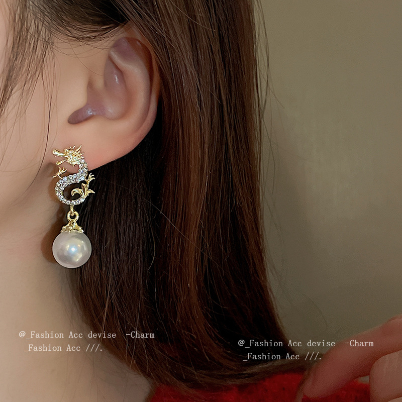 银针珍珠镶钻龙形耳环新中式小众气质耳钉复古百搭设计感耳饰批发