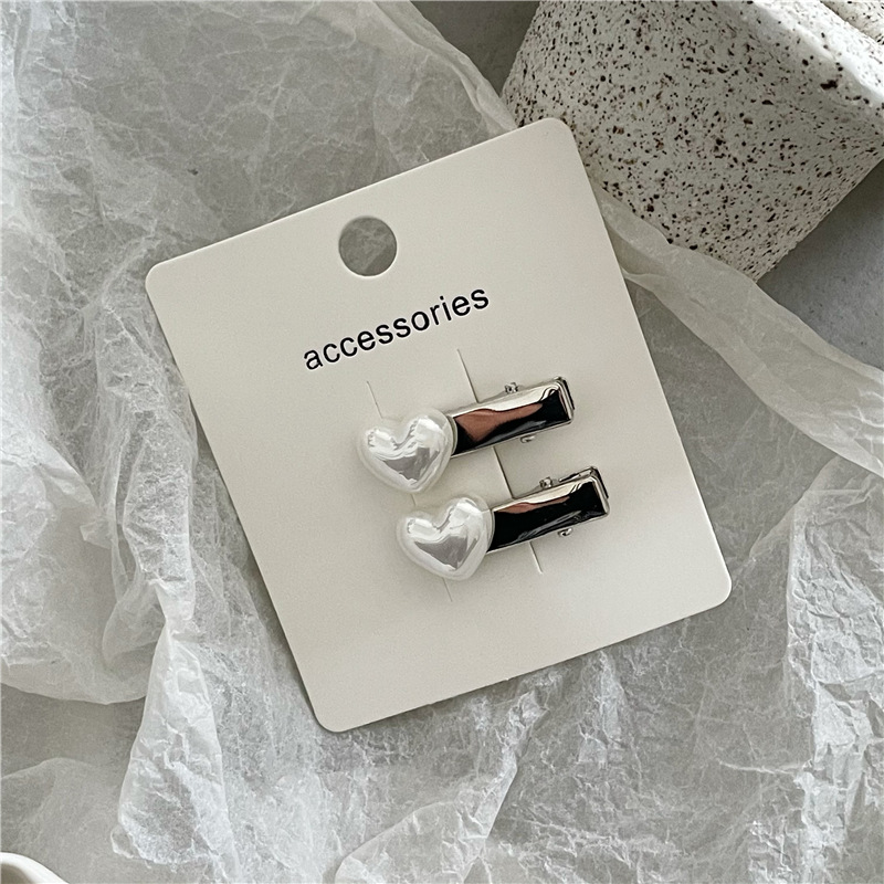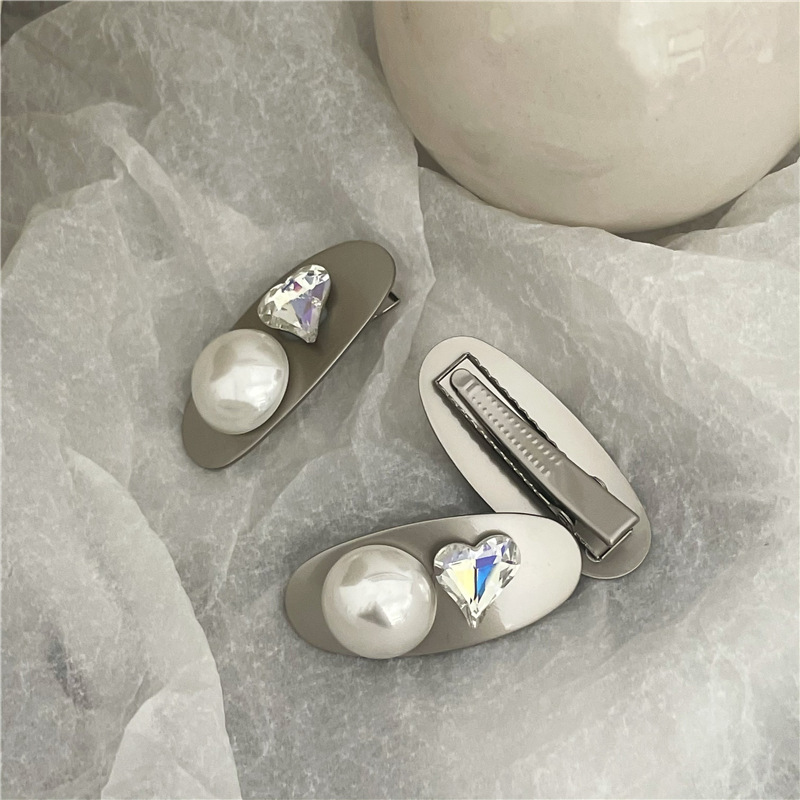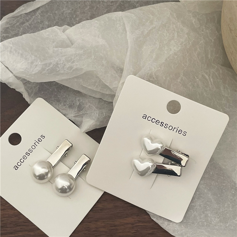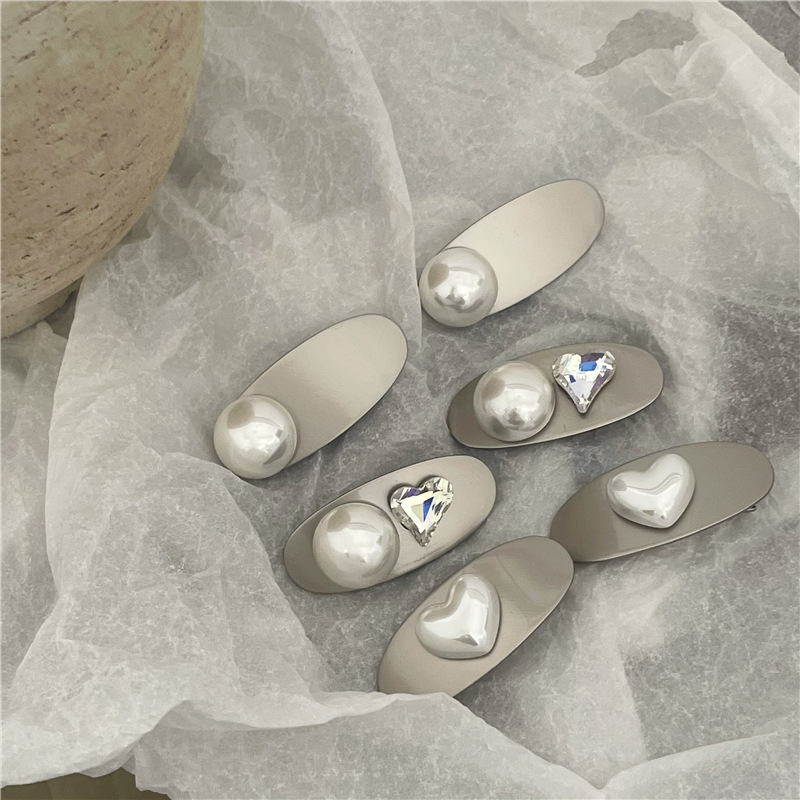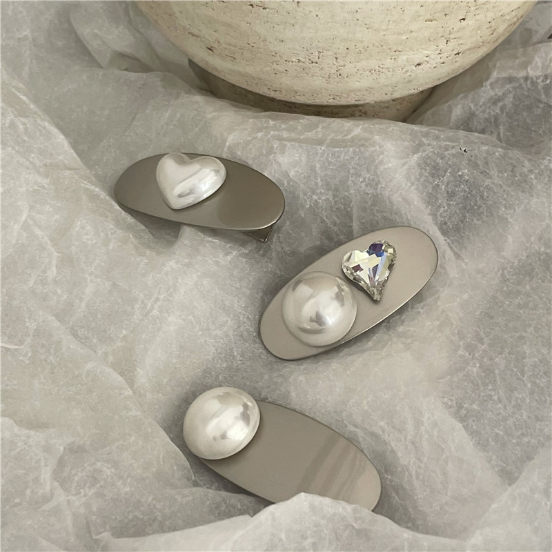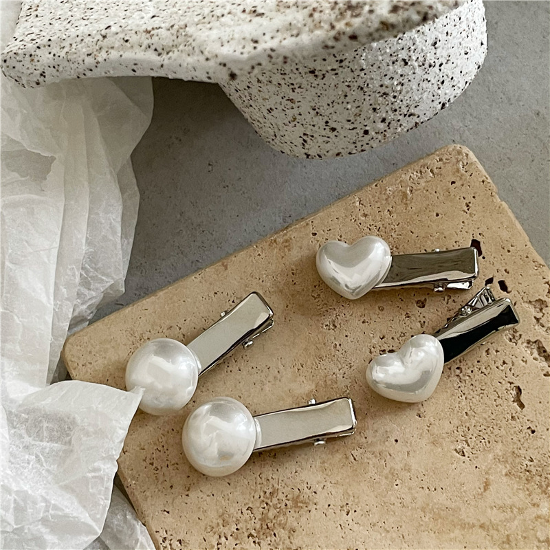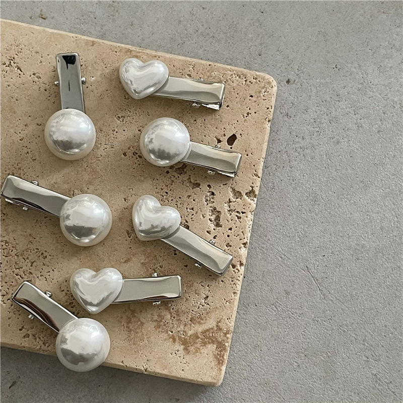 冷淡风 金属银色发夹边夹 高亮仿马贝珍珠爱心鸭嘴夹刘海夹新款