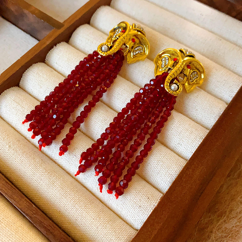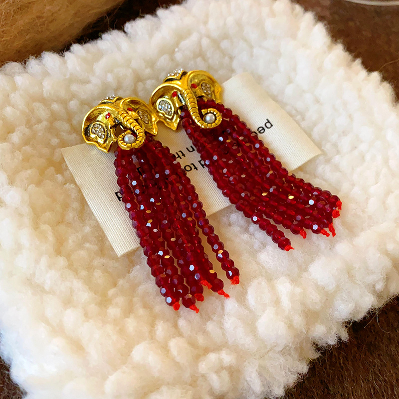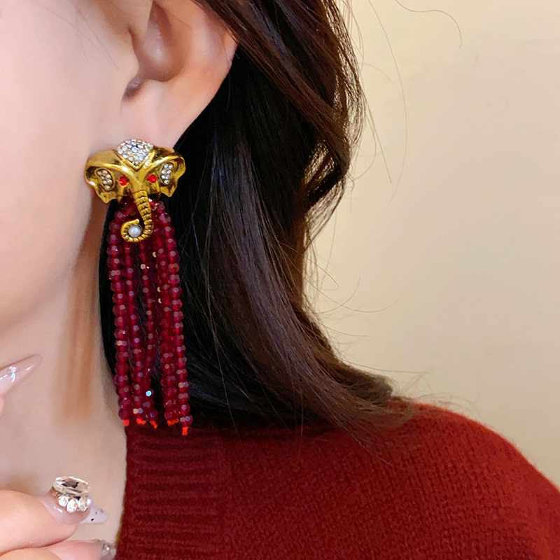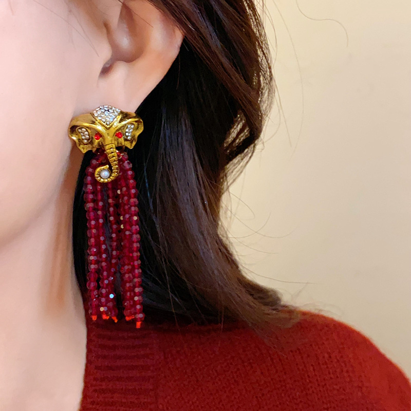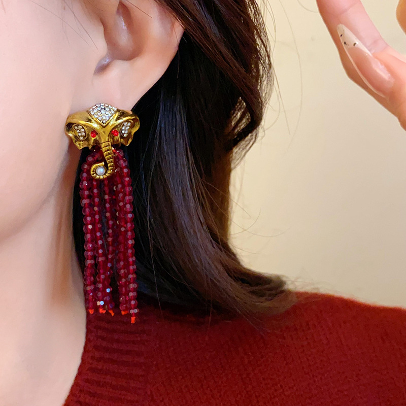 中古vintage耳饰银针镶钻大象人造珍珠耳环复古宫廷风气质耳坠女