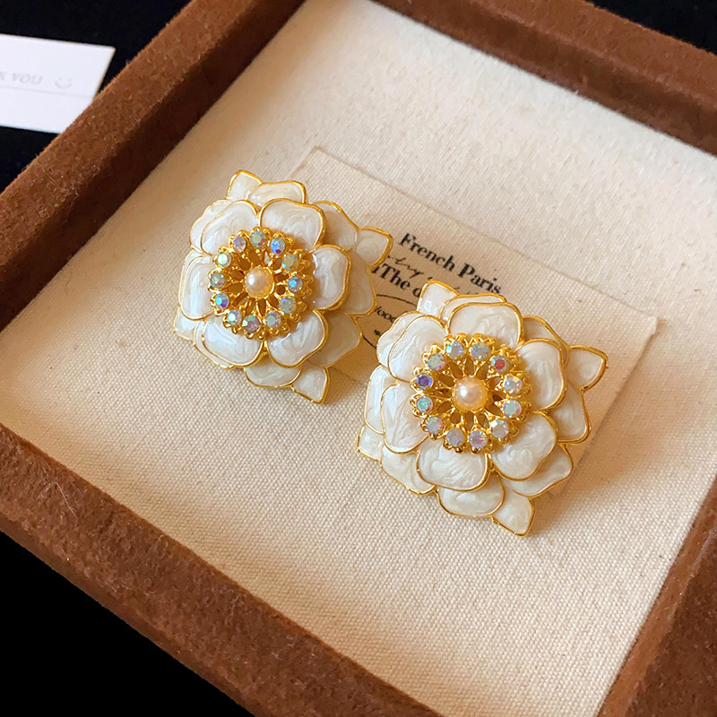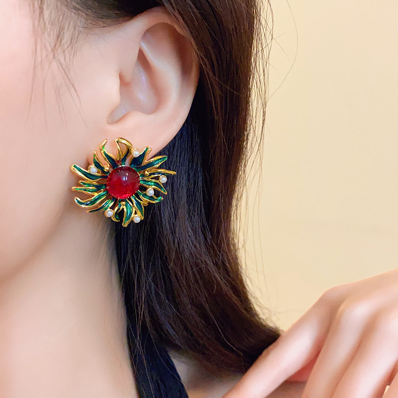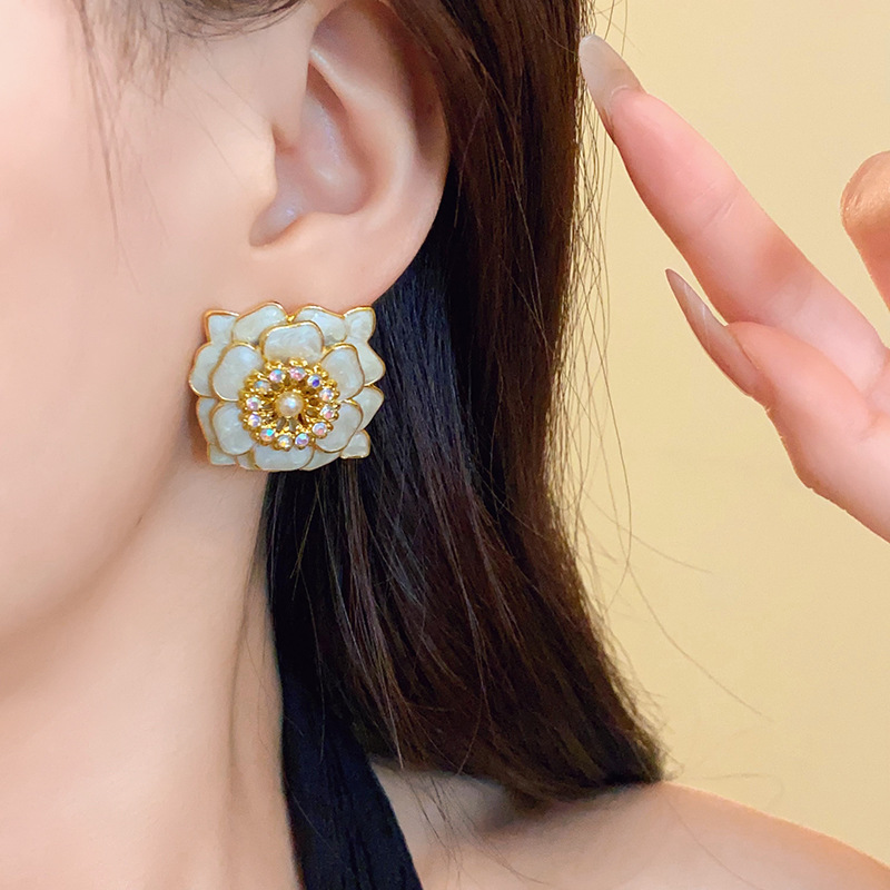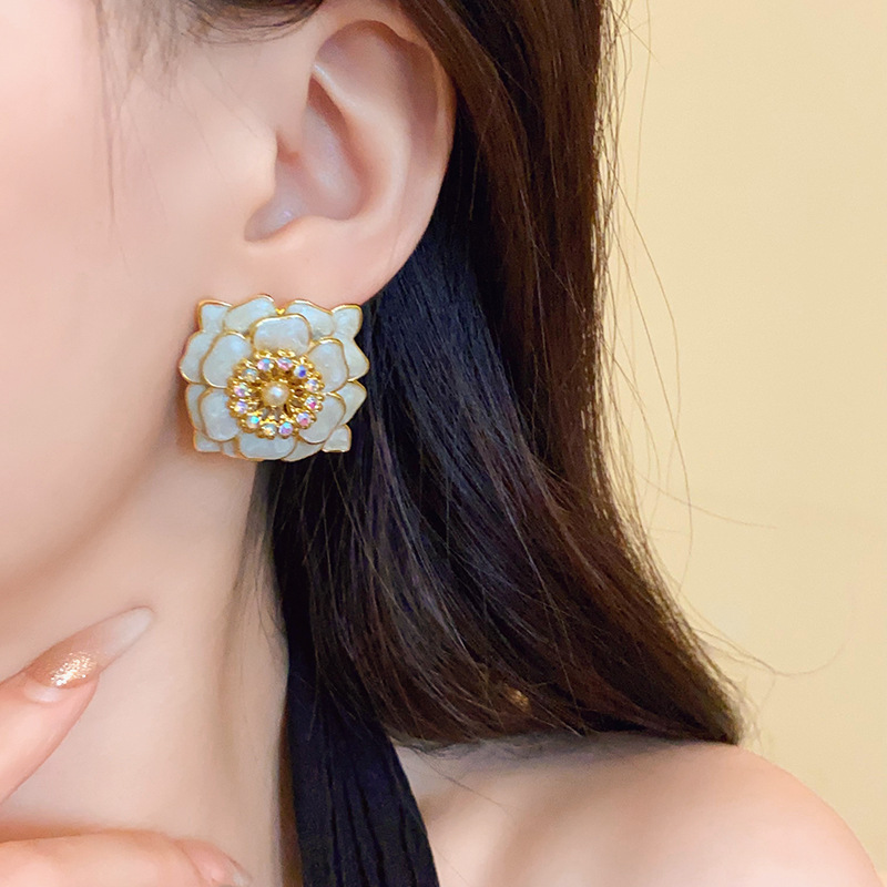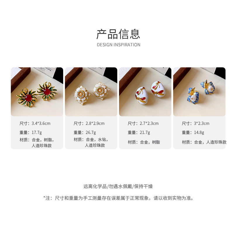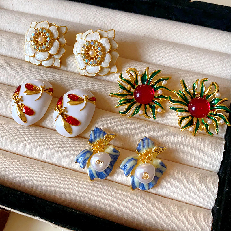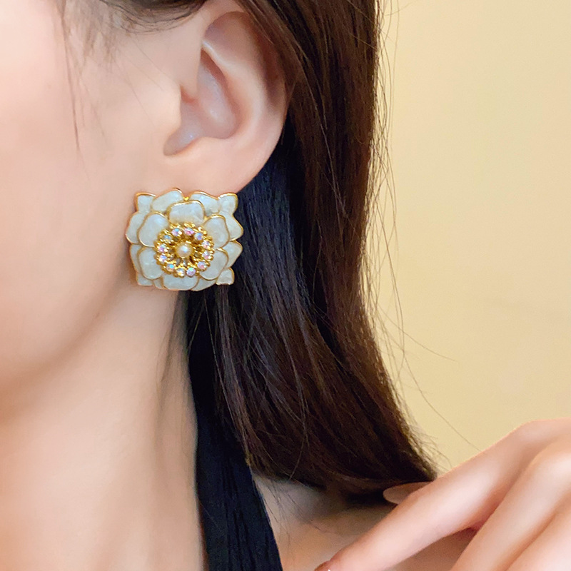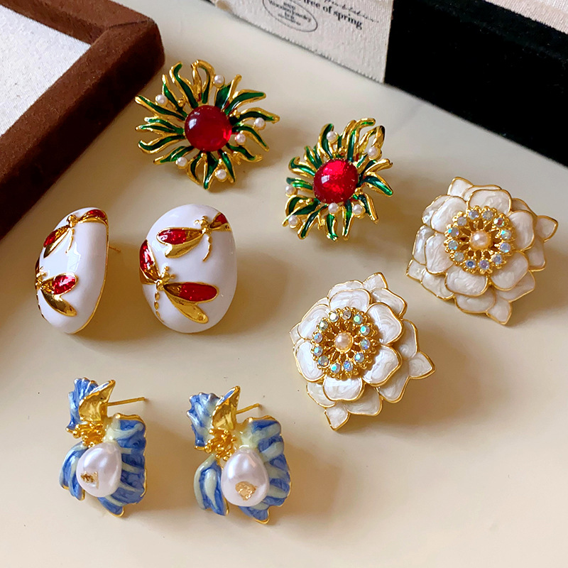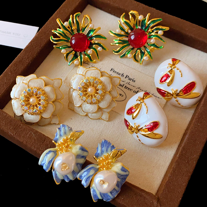 中古vintage饰品银针滴油花朵珍珠款耳钉气质耳环时尚高级感耳饰