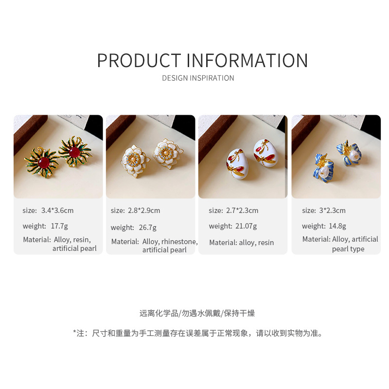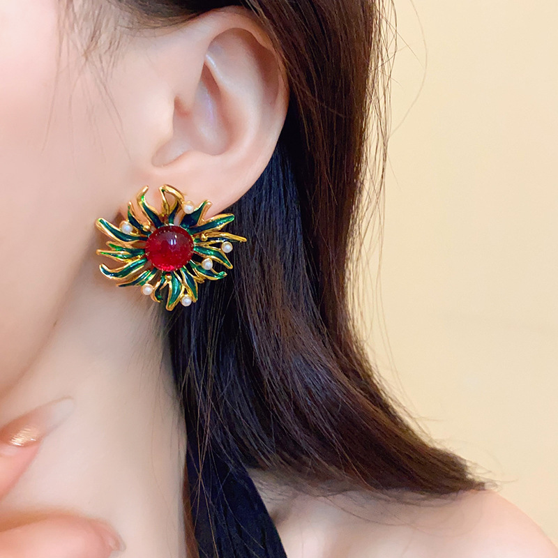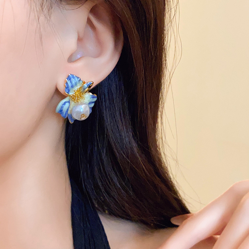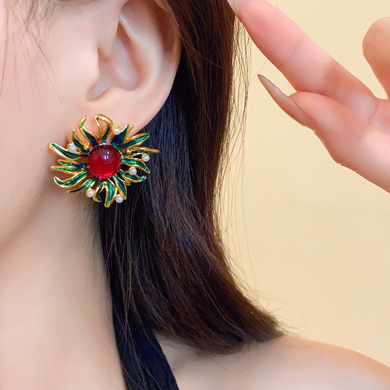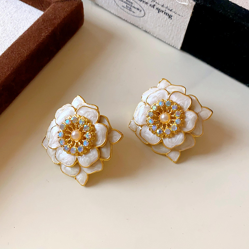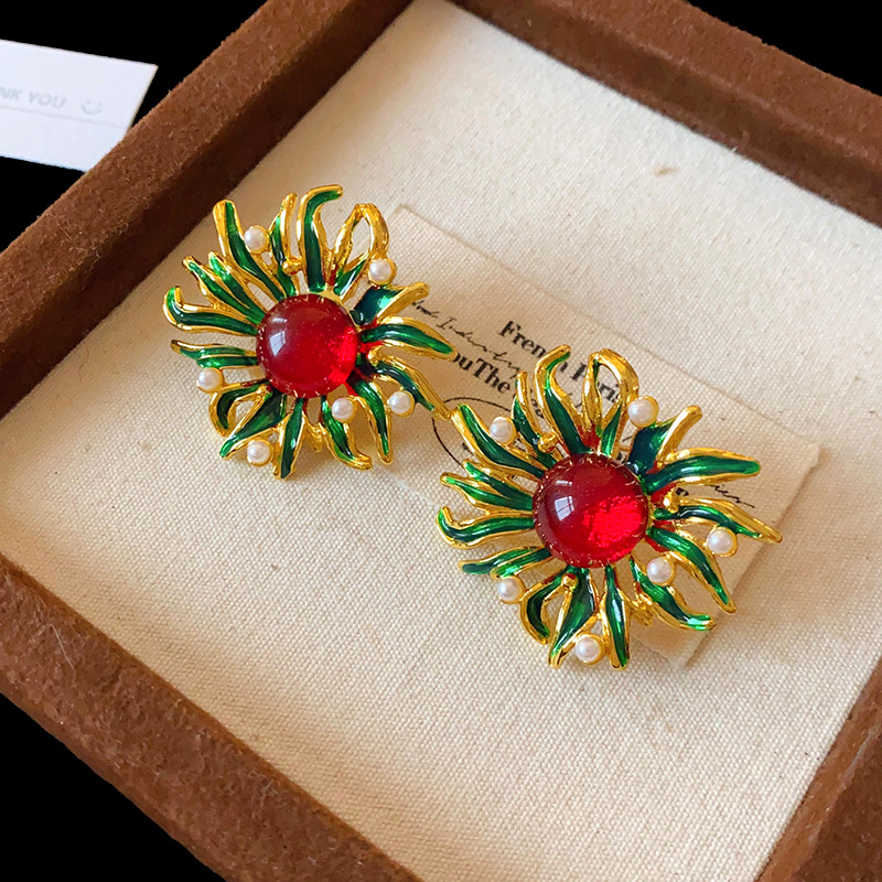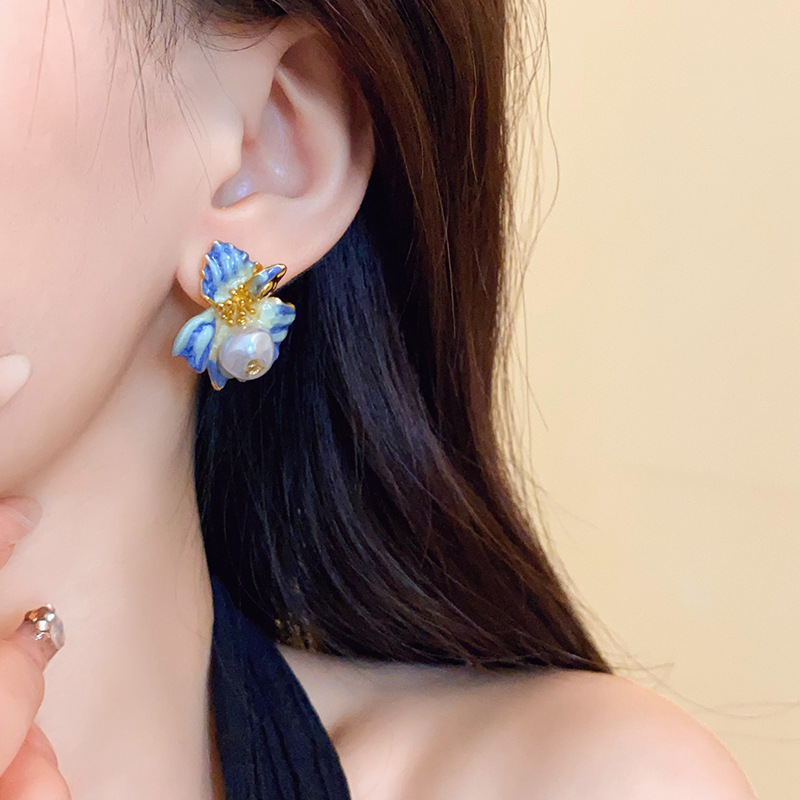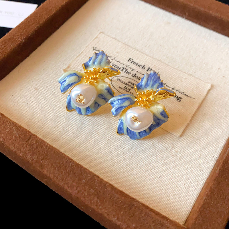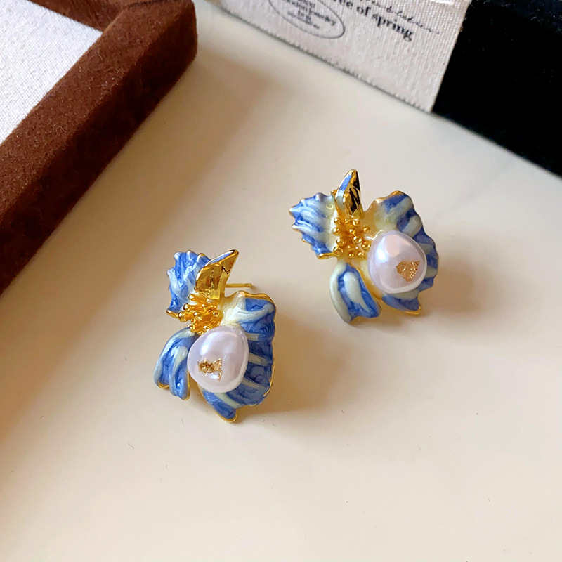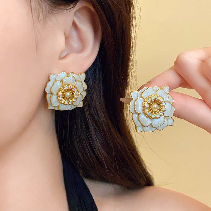 中古vintage饰品银针滴油花朵珍珠款耳钉气质耳环时尚高级感耳饰