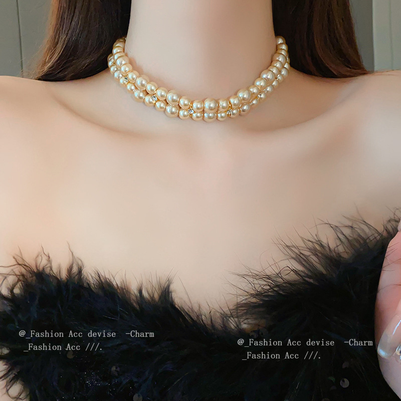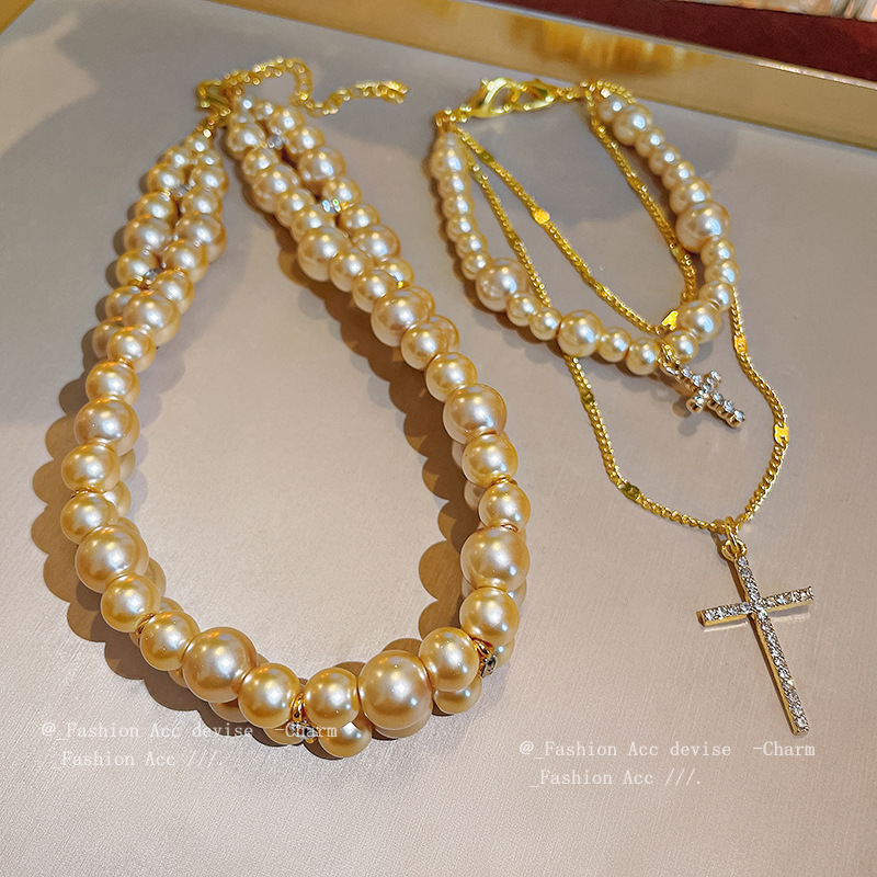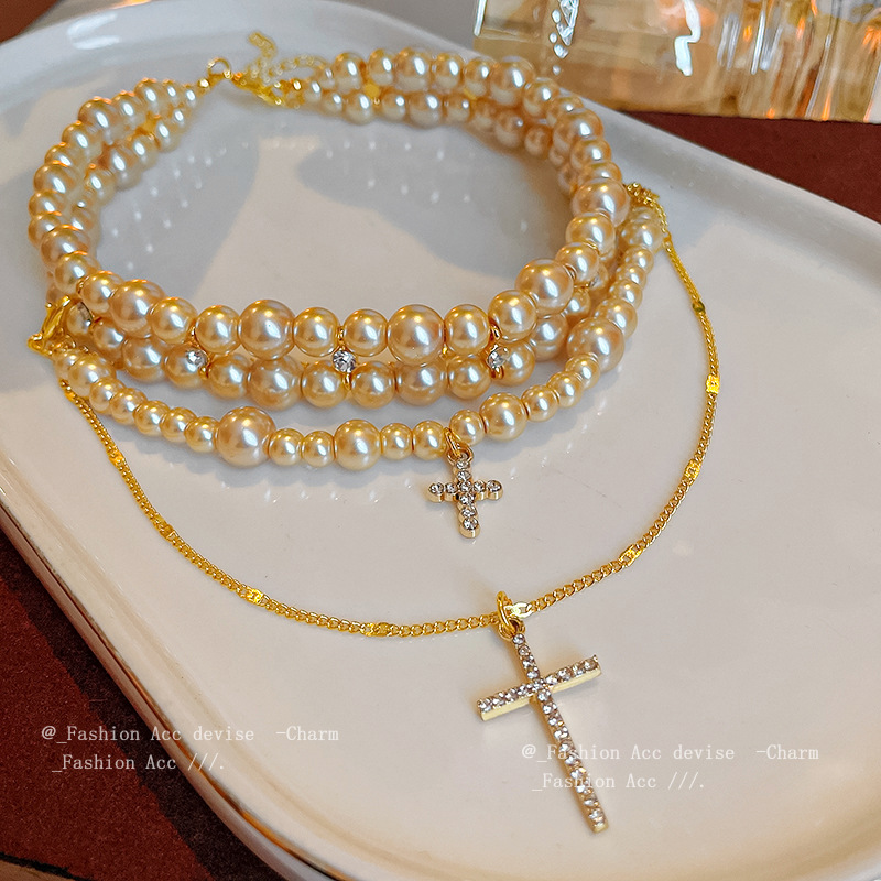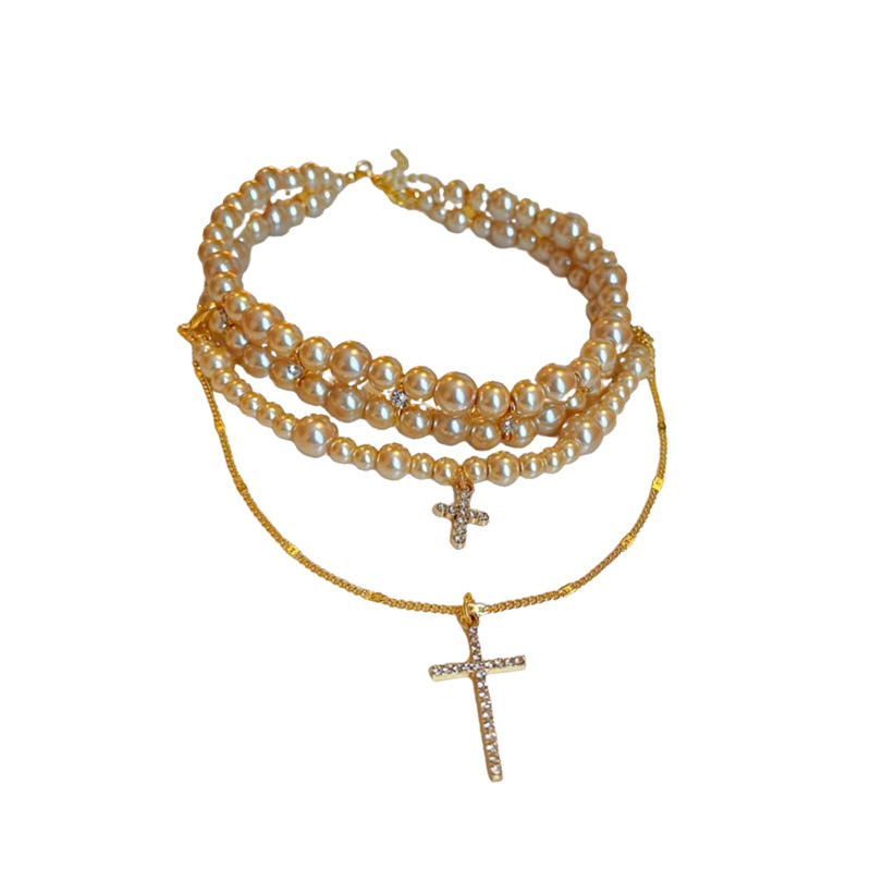 多层镶钻珍珠十字架项链复古时尚设计感锁骨链小众百搭饰品批发女
