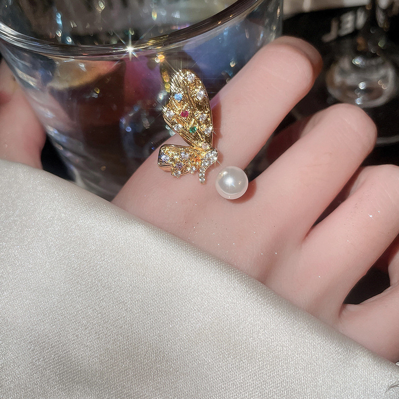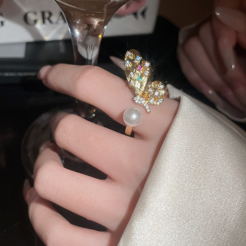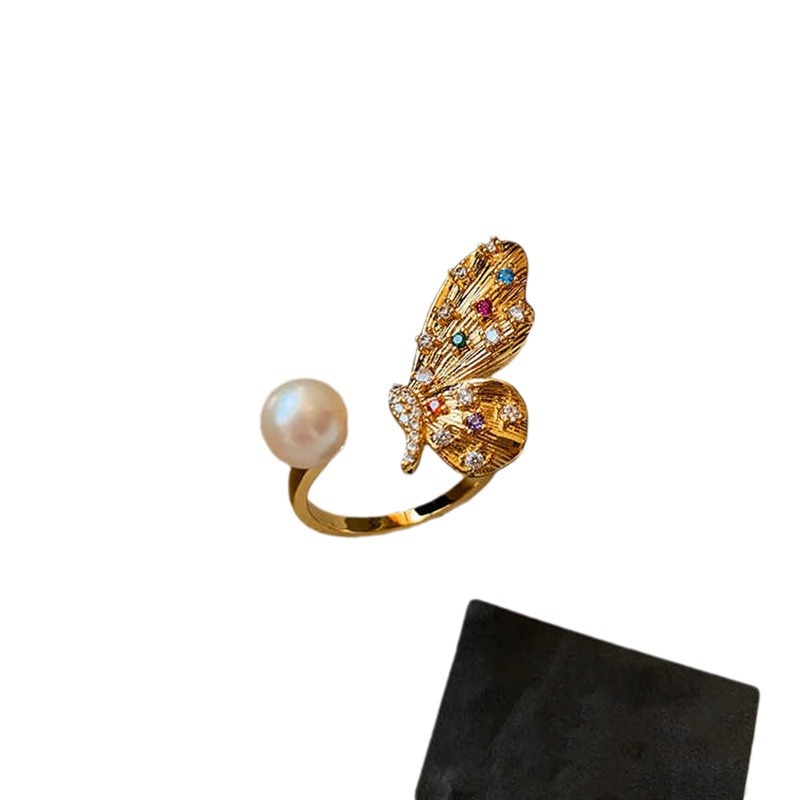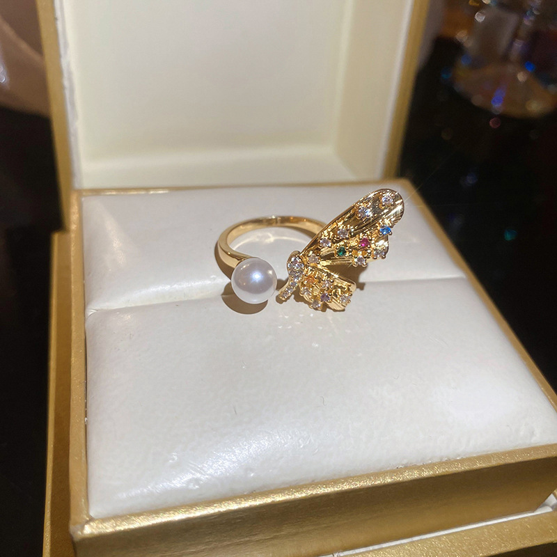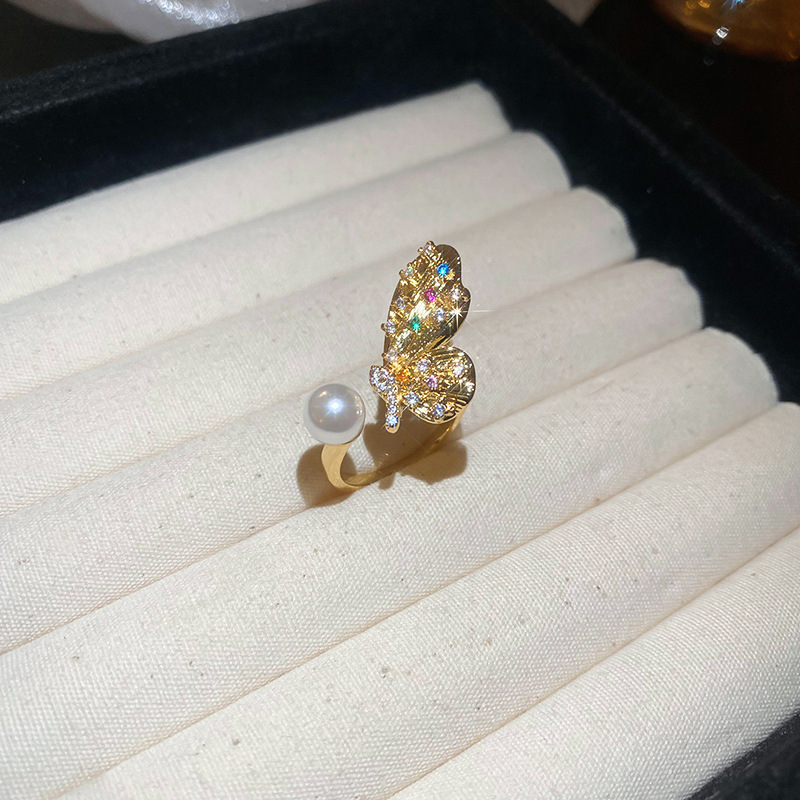真金电镀人造珍珠蝴蝶锆石戒指轻奢风时尚开口食指戒新款精致手饰